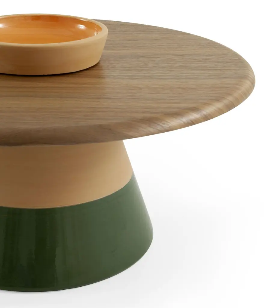 Sablier Oak and Clay Coffee Table by Morica DesignDimensions: D 70 x W 70 x H 34 cm.Materials: Canaletto walnut, Muschio Green terracotta.Available in Canaletto Walnut, Laguna Oak, or Oak wood. Please contact us.Available in different clay colors.Coffee table with base and object holder in natural clay worked on the lathe with inserts in glossy glazed pure color. Top in MDF veneered real wood worked in a membrane press. The object holder is separated from the top and can be moved. The height shown in the table includes the object holder, which is 5cm high.This product is handcrafted using traditional methods, so it may have slight imperfections. These details are distinctive marks that reflect the skill involved in their creation. Each piece is unique and showcases the authenticity and beauty of handmade craftsmanship.The spark of an idea began with three brothers, Moreno, Riccardo, and Carlo, and the desire to provide genuine Made in Italy design furniture, delivered to customer homes directly from the factory.We guarantee our customers a controlled, certified supply chain and an excellent service that makes it easy for their items to be delivered directly to their homes.We are a fresh organization, full of ideas with the desire to make the world a better place, to change the way we consume by providing beauty, sustainability, and reliable service!