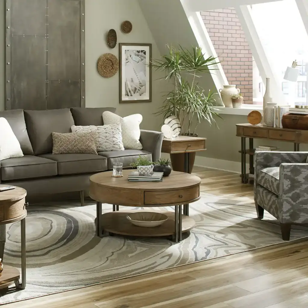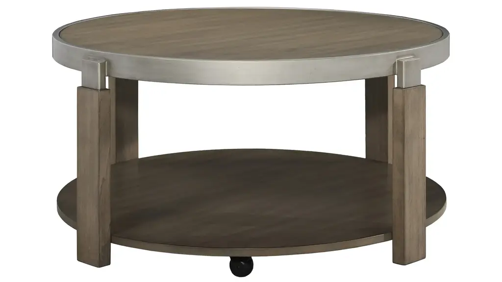 The Round Lift-Top Coffee Table from Saddletree-Hamilton blends rustic charm with modern functionality. Crafted from oak veneers with sturdy metal legs, it offers a striking mix of natural warmth and industrial appeal. The lift-top design provides versatility for work or dining, while a spacious drawer offers discreet storage for essentials. A lower shelf enhances organization and display options, and casters ensure effortless mobility. Thoughtfully designed for both style and practicality, this coffee table serves as a bold yet functional centerpiece for any living space.