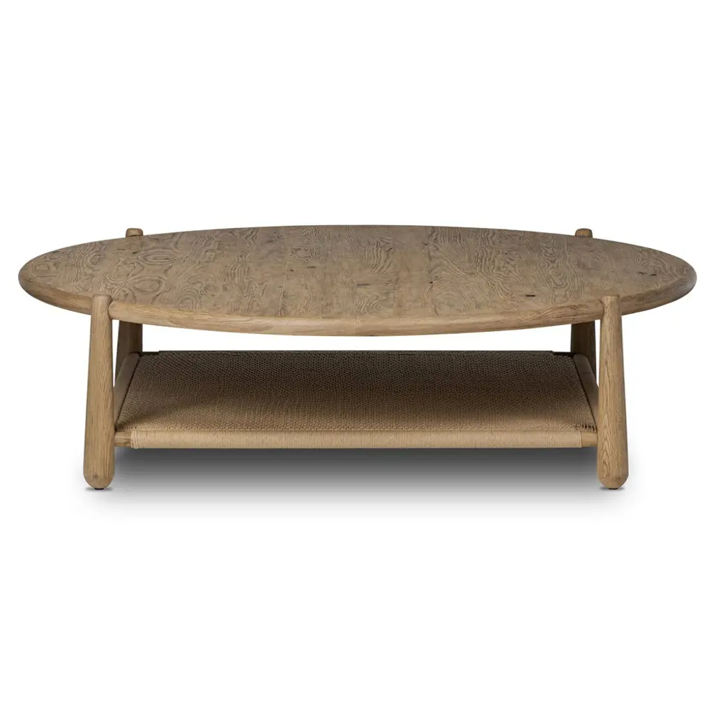 A design collaboration by Amber Lewis and Four Hands. Mix materials for intrigue. A rounded, two-tier coffee table is made from resawn oak with an aged, smoked finish, with heavy graining and natural knots. A lower shelf of woven paper cord brings texture — and storage — into play.