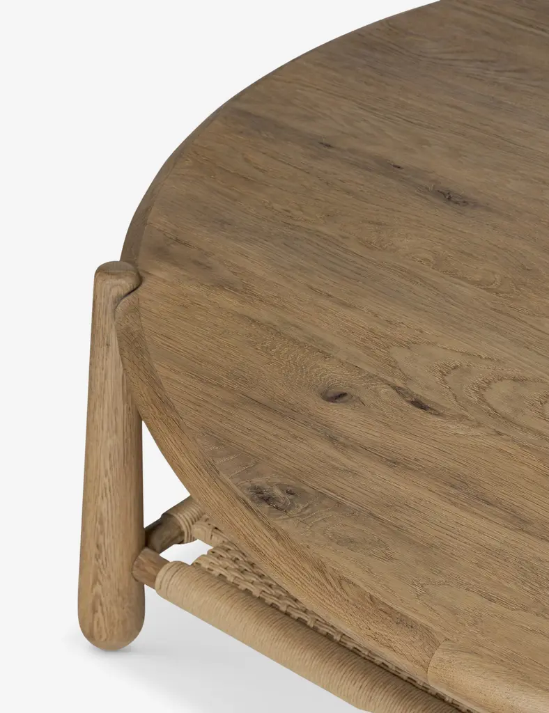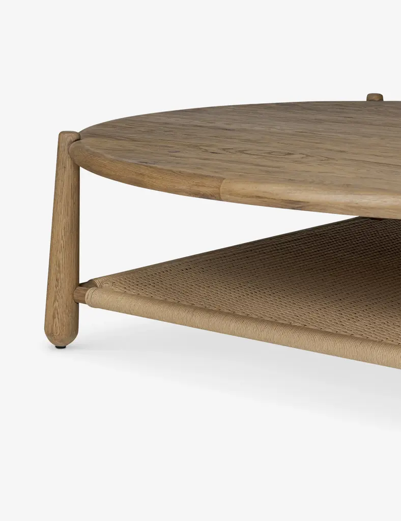 Four Hands brings their exceptional craftsmanship to a timeless collection rooted in Amber Lewis' perennial California style. The Salvador coffee table finds elegance in simplicity. This round coffee table's soft lines and tapered legs showcase the natural character of the wood with a woven shelf below for books or blanketsevery detail considered.