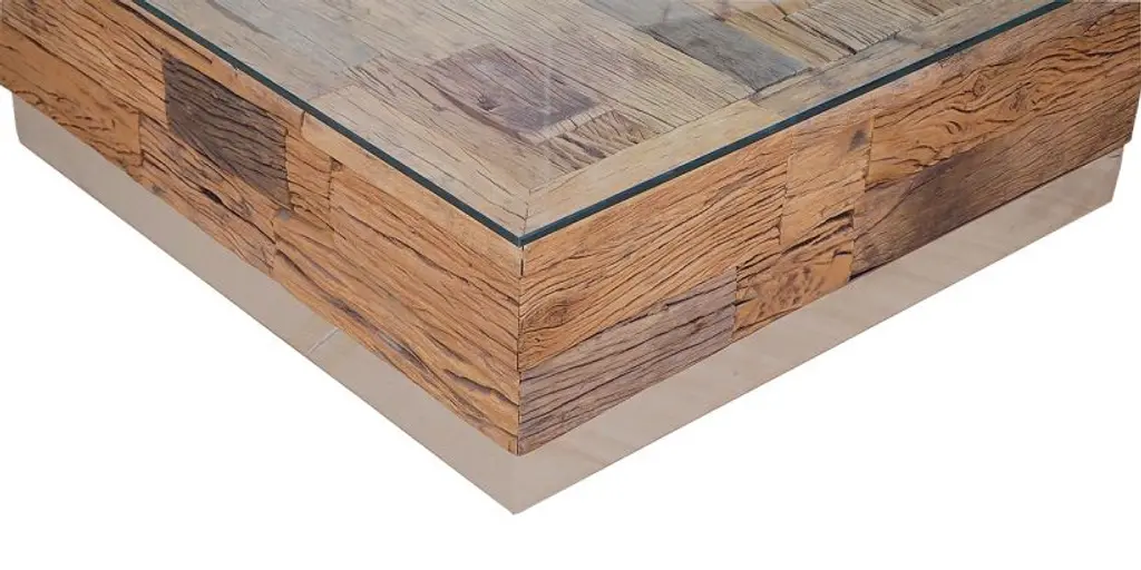We scaled the original Samana down for smaller dwellings, but the essence of what makes the Samana so charming is still intact. Sal wood planks, purposefully weathered to resemble those used along railways, are configured into a singular unit for one to rest drinks, books, or a vase filled with a beautiful arrangement from an artisan floral shop. A steel base keeps the wood afloat, and the tempered glass has a smooth finish that makes it clear enough to see every fiber of timber.