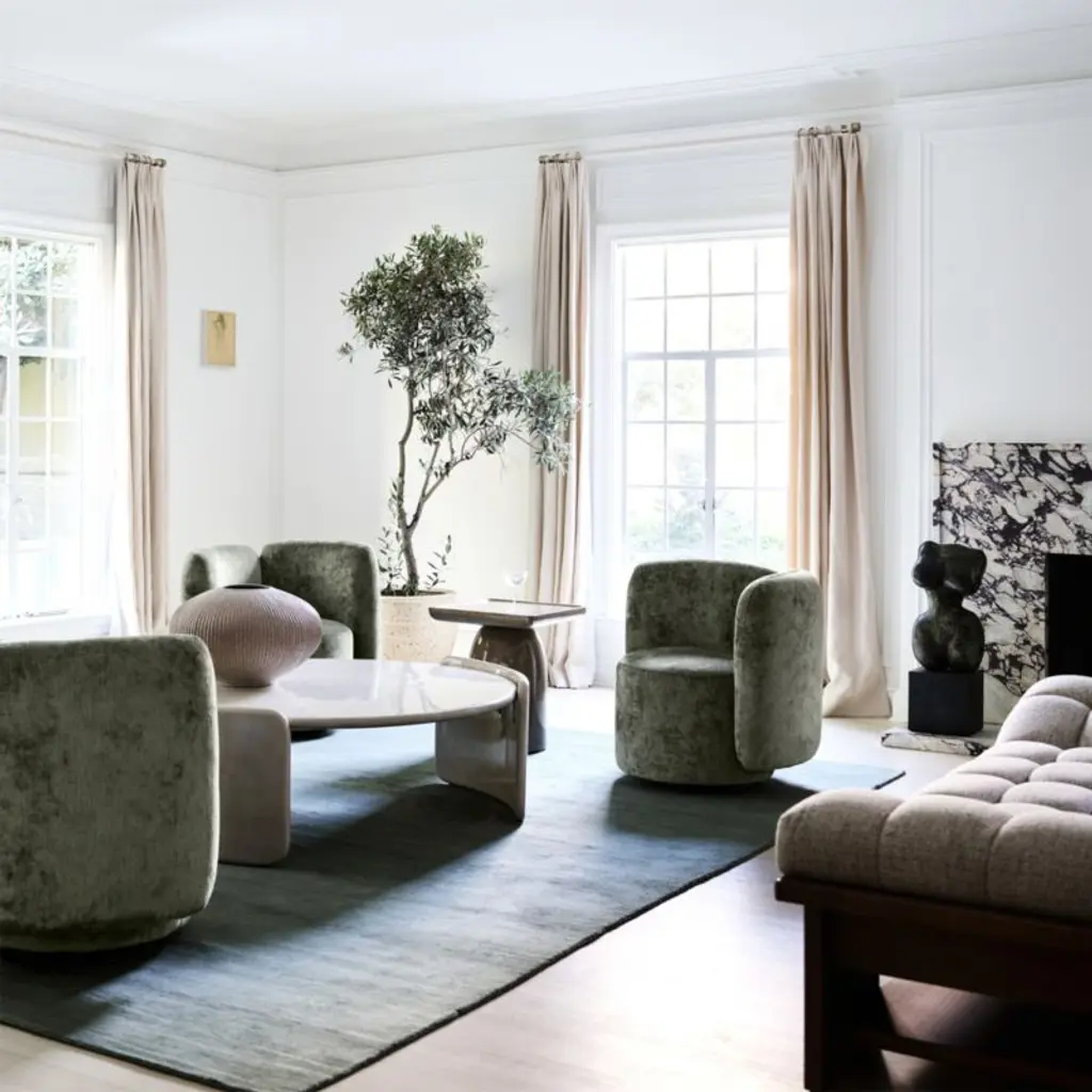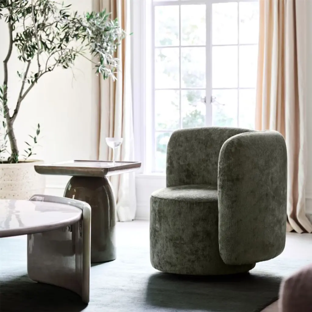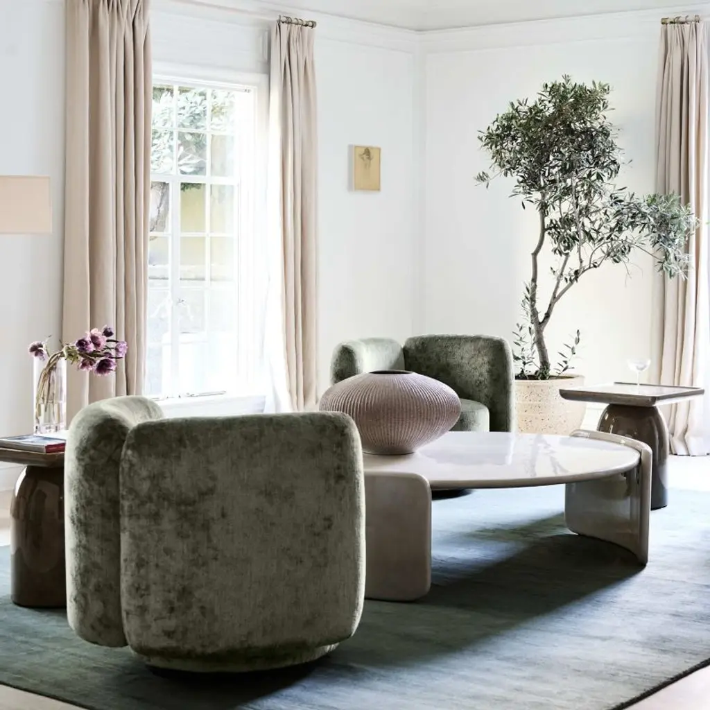 Minimalist with maximum impact, this coffee table instantly updates your living space. Curved slabs hug the generously sized round top for a floating look, with bullnose edges that soften the contours. Enhancing its sculptural silhouette, the concrete table is hand-finished in a high-gloss light putty tadelakt-style finish, a time-honored plaster technique with roots in Morocco that offers a slightly textured finish with beautiful tonal variations.Exclusive collaboration! L.A.-based star designer Brigette Romanek redefines design rules as only she can, with playfully unexpected forms to bring you the fresh look her A-list clients love.