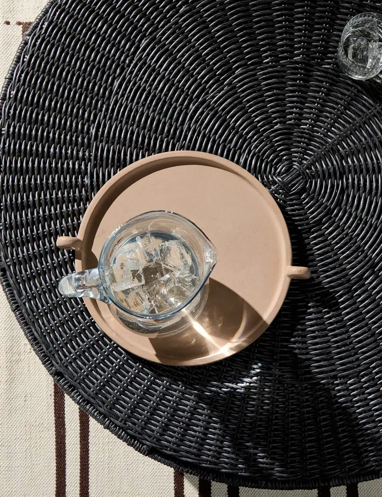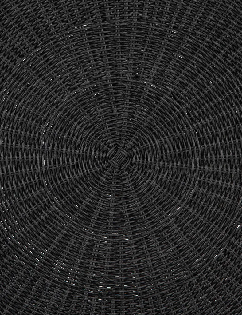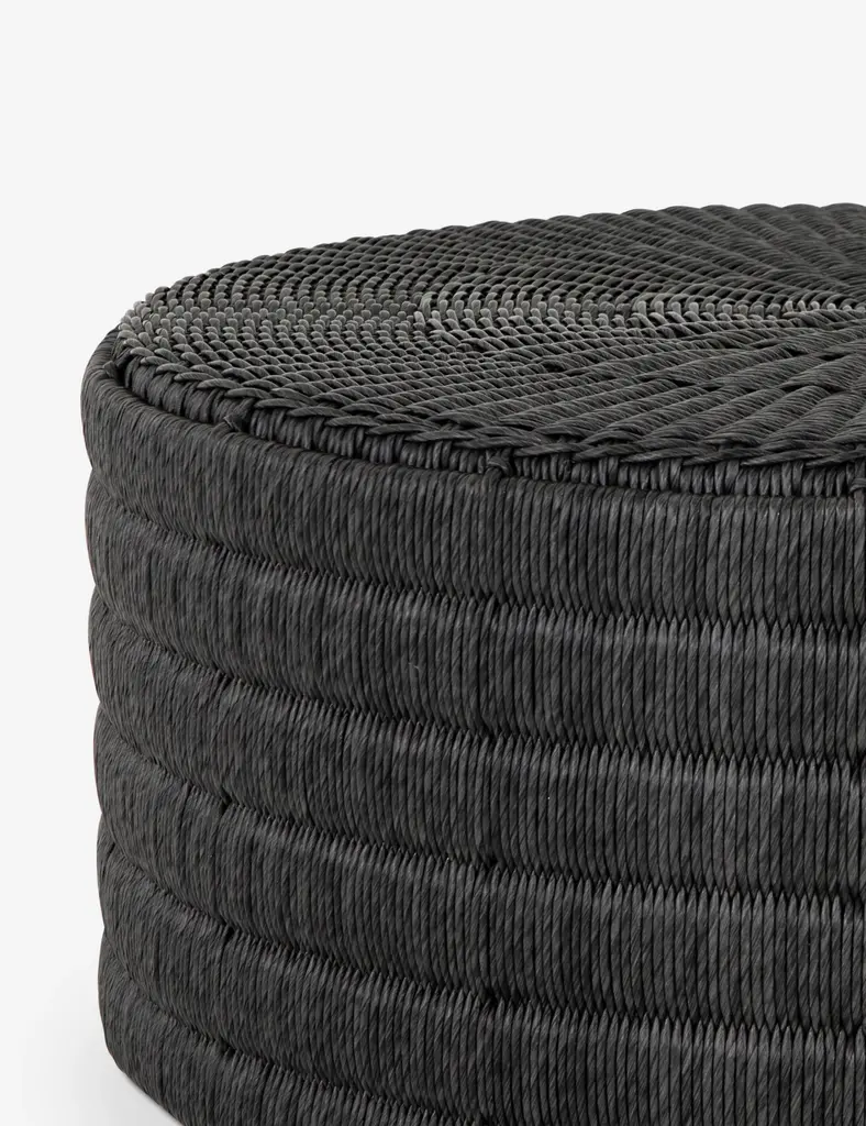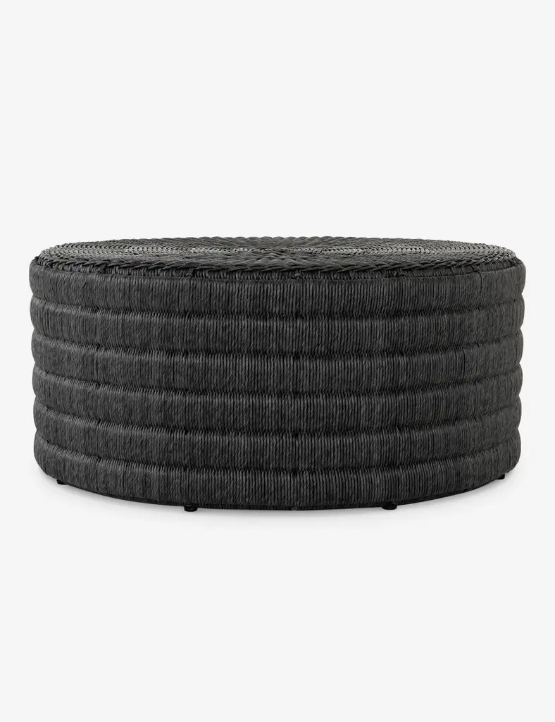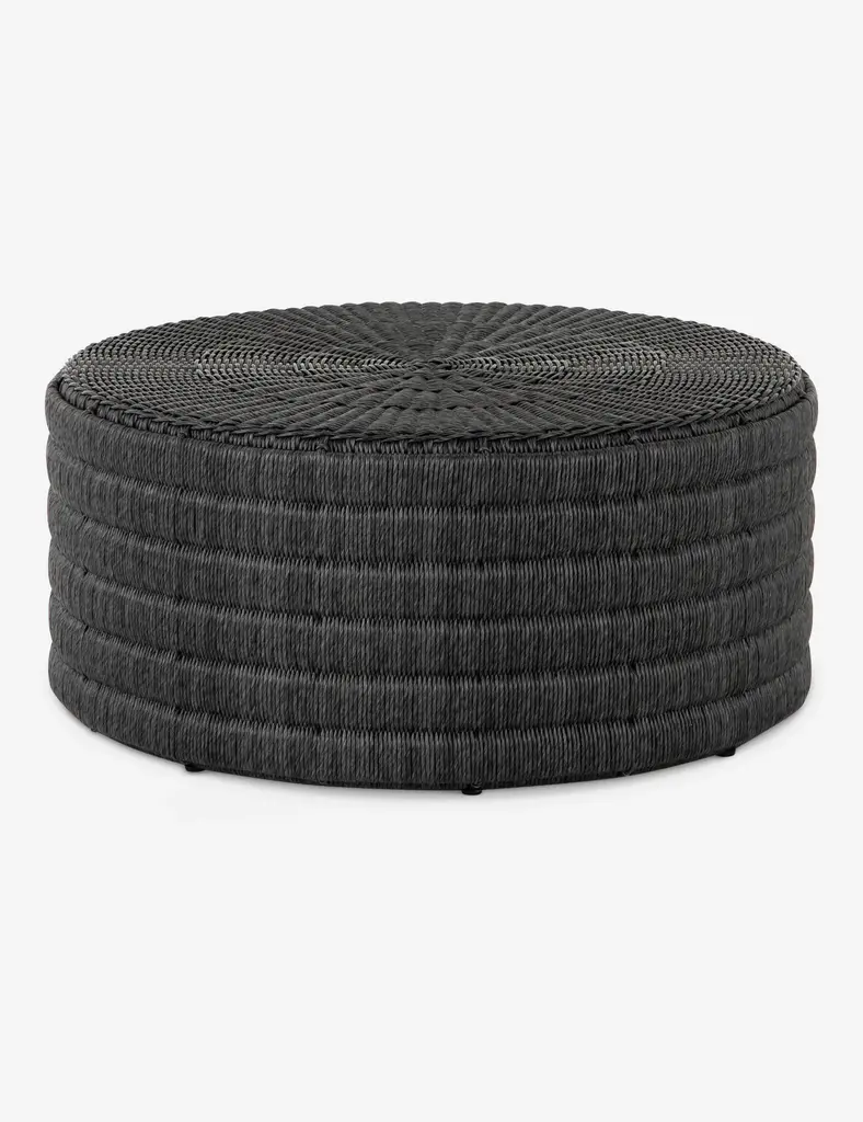 Wrapped in a dark and dynamic, all-weather wicker, this texture-forward coffee table is a distinctive centerpiece with visual appeal in the round. Style this new coffee table for some patio table space or layer it into a lounge for a moody touch with an easy-care appeal.