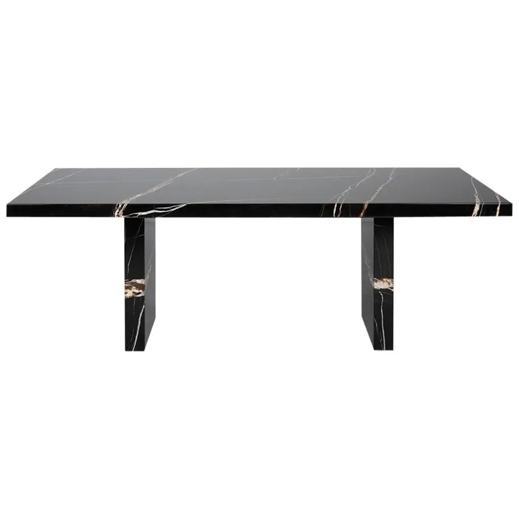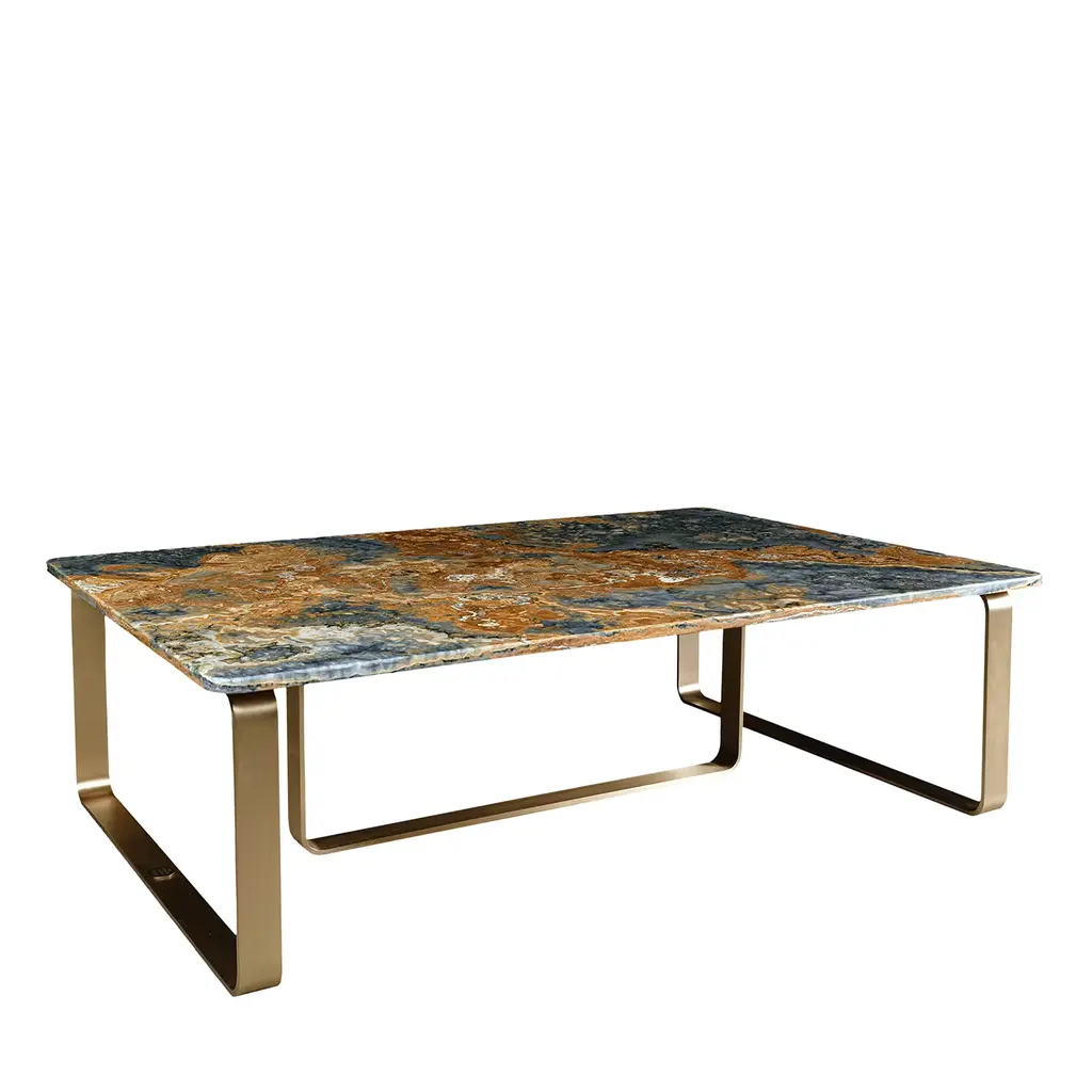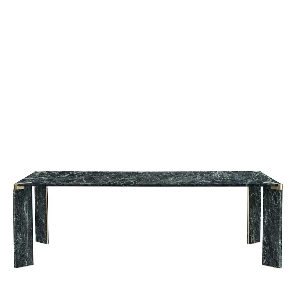 This stunning table is part of the Savoy Collection. A magnificent object of unparalleled sophistication, this piece boasts a structure in burnished bronze where sinuous lines cross at the base and flare up to support the imposing rectangular top with cut corners. The top, mounted in bronze, is a single slab of marble, whose one-of-a-kind veins create a superb pattern on the light-colored background.