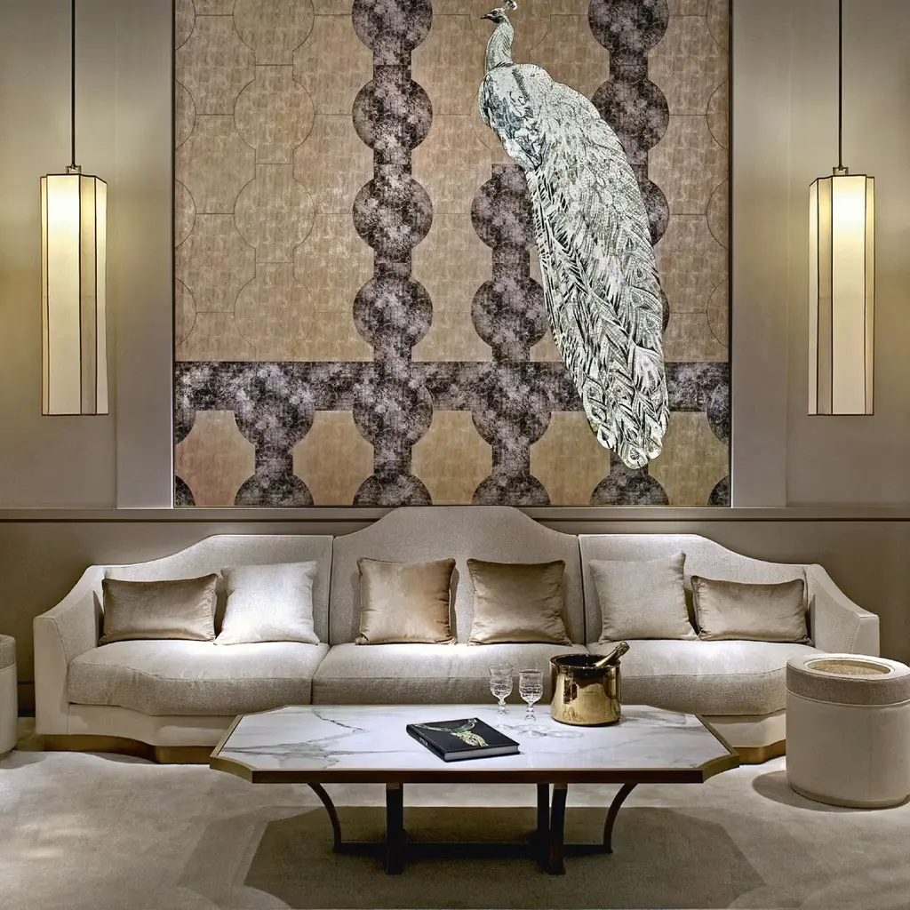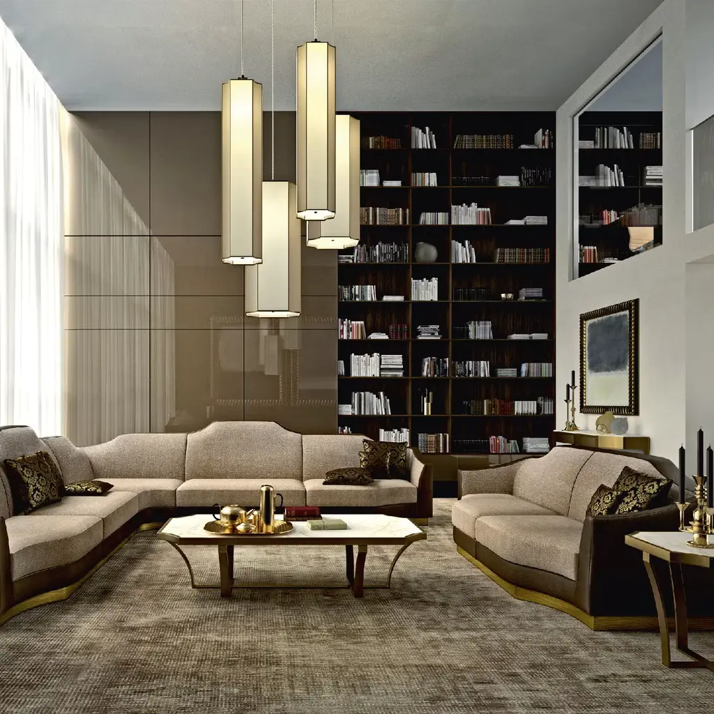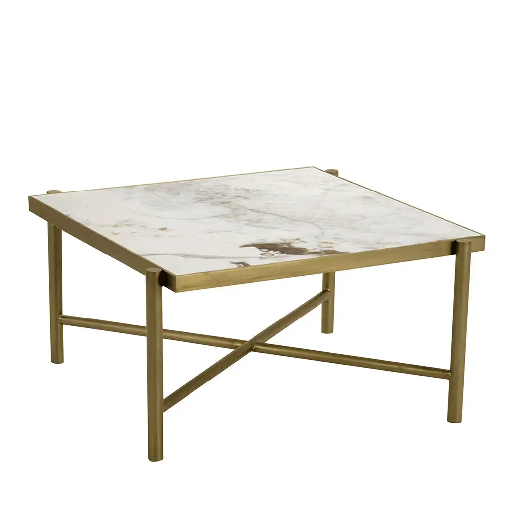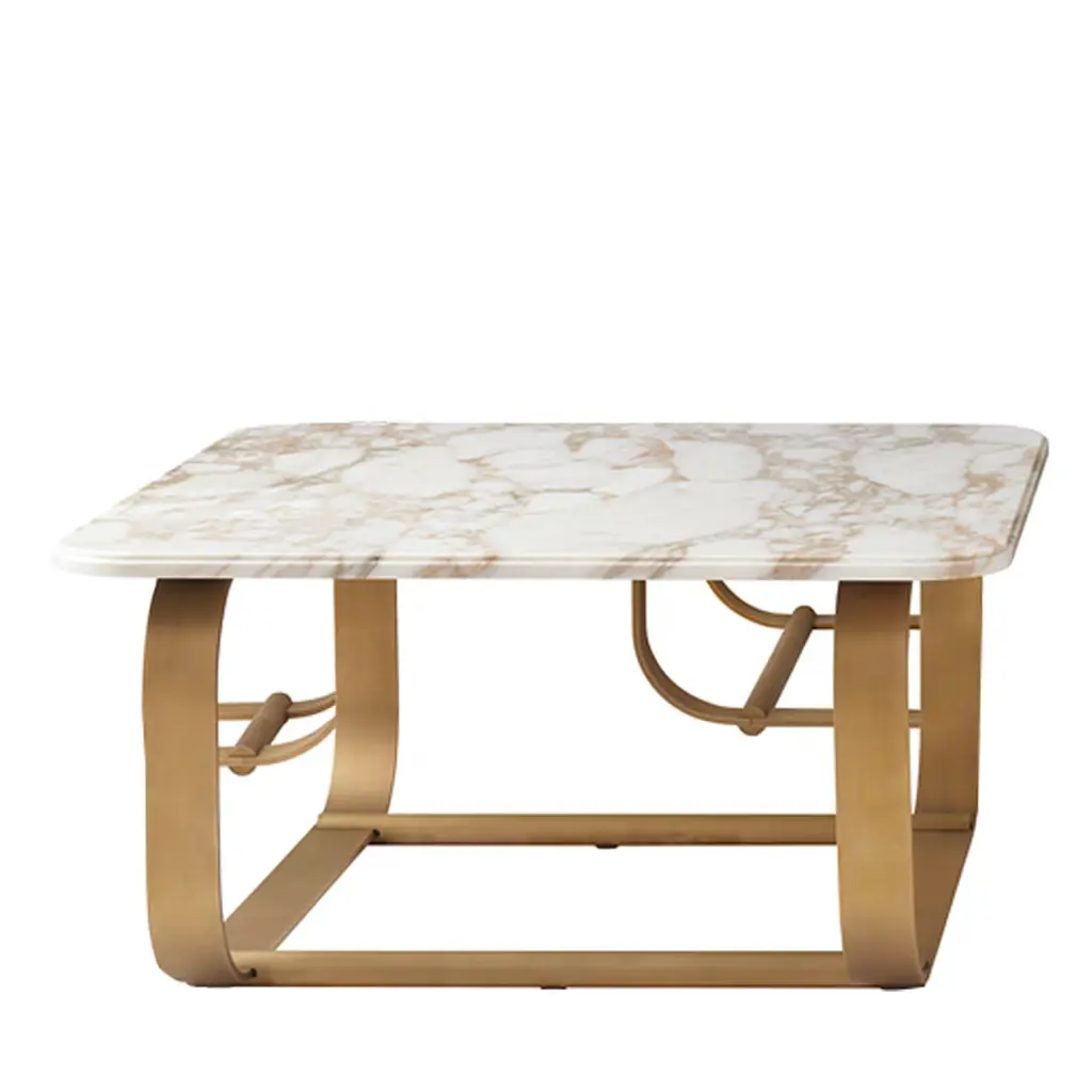 This stunning table is part of the Savoy Collection. A magnificent object of unparalleled sophistication, this piece boasts a structure in burnished bronze where sinuous lines cross at the base and flare up to support the imposing rectangular top with cut corners. The top, mounted in bronze, is a single slab of marble, whose one-of-a-kind veins create a superb pattern on the light-colored background.