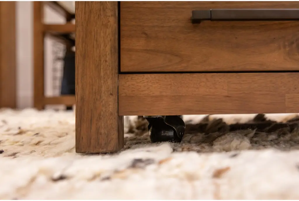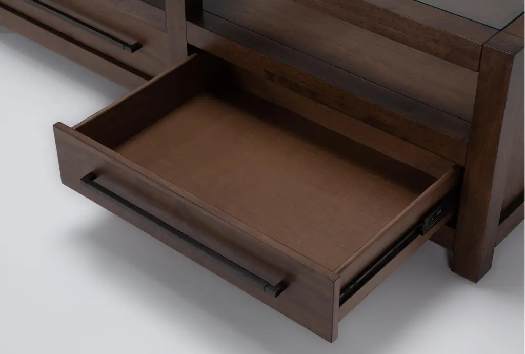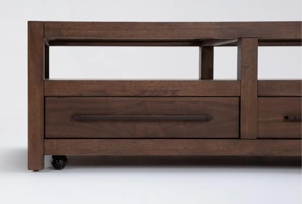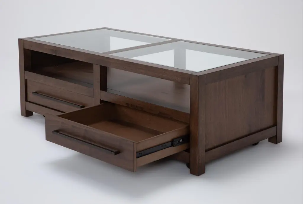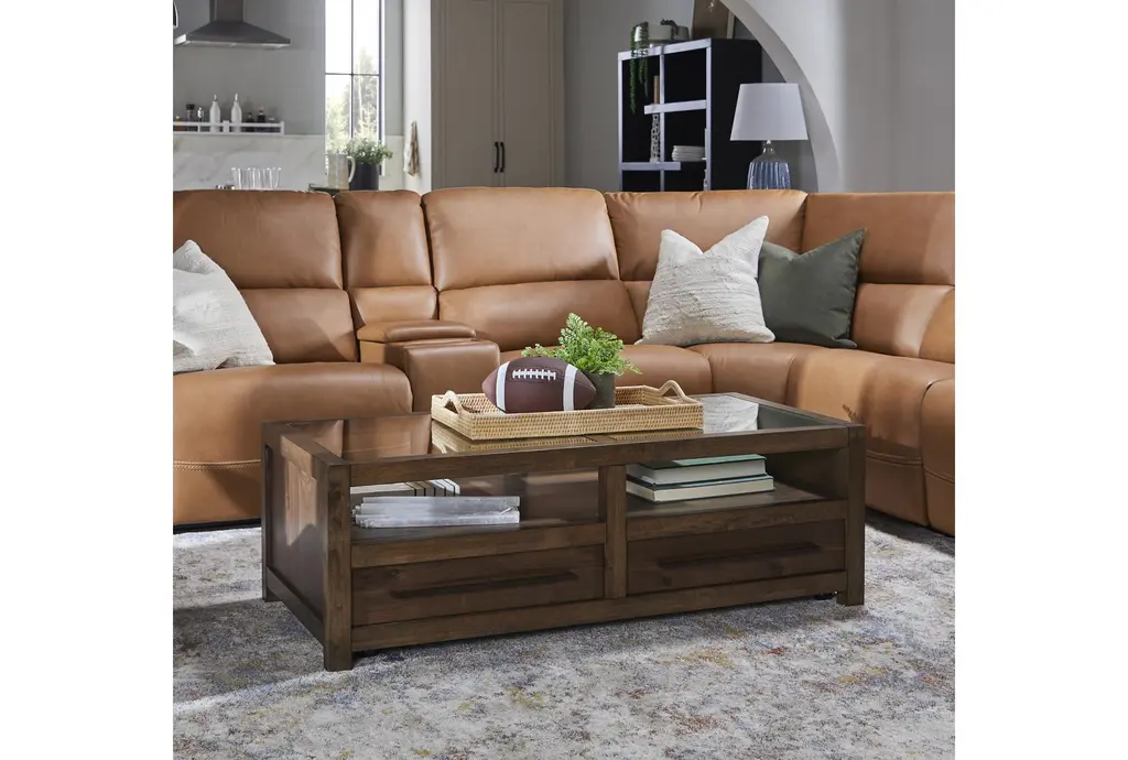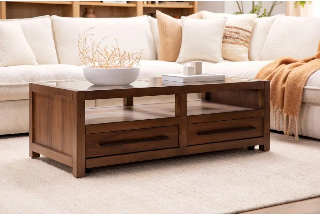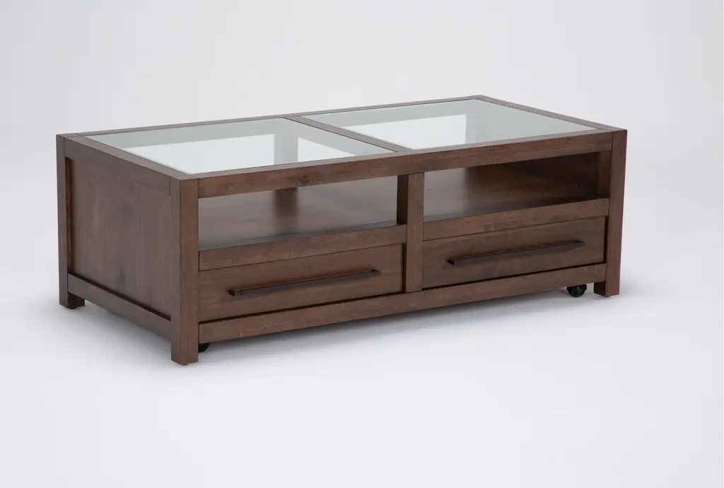 Sawyer Brown Walnut 54" Wide Rectangle Glass Top & Wood Base Coffee Table | Storage | Drawers | Wheels | Shelf
