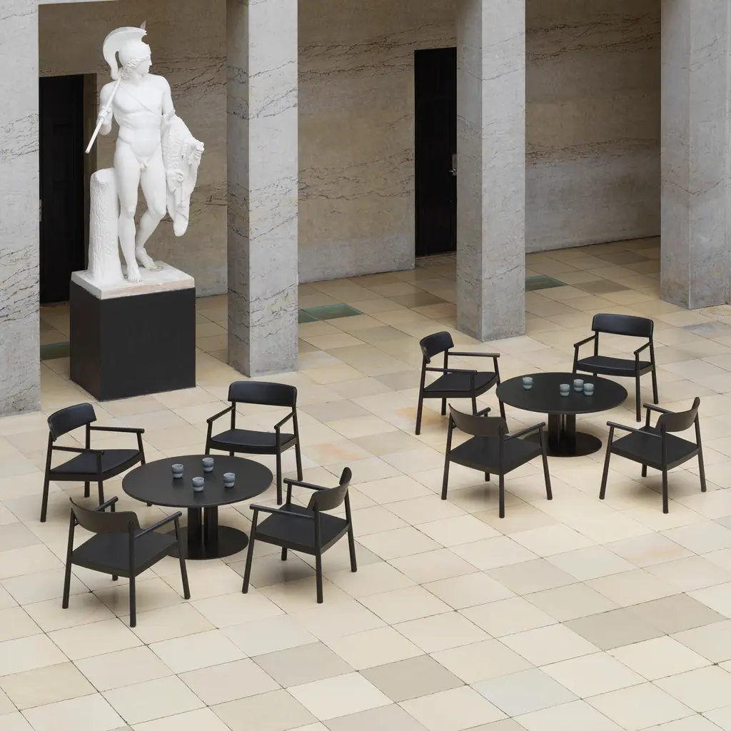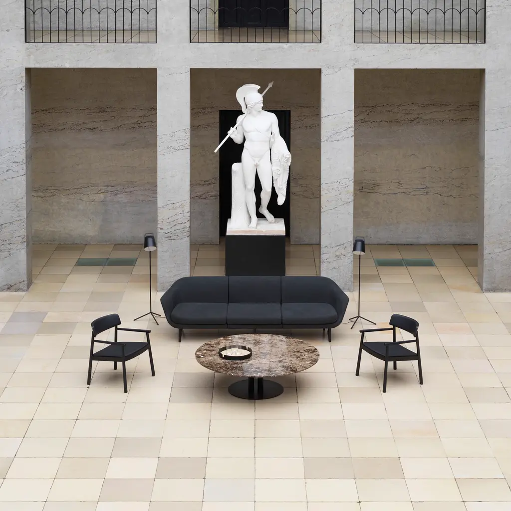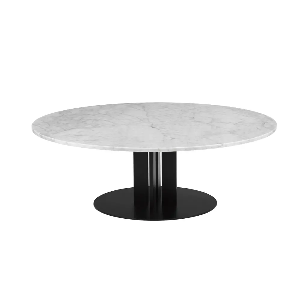 Designer Simon Legald plays with scale in his coffee table featuring an eye-catching arrangement of 4 columns made of solid steel with a black lacquer finish. Scalas defining variation on the classic architectural form shifts in perspective when viewed from different angles. The generous, convivial round tabletop is offered in 3 sizes with a host of complementary options in either oak veneer, several marble colorations or silvery stainless steel.