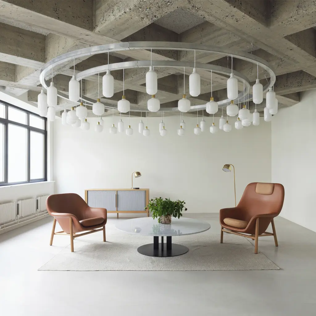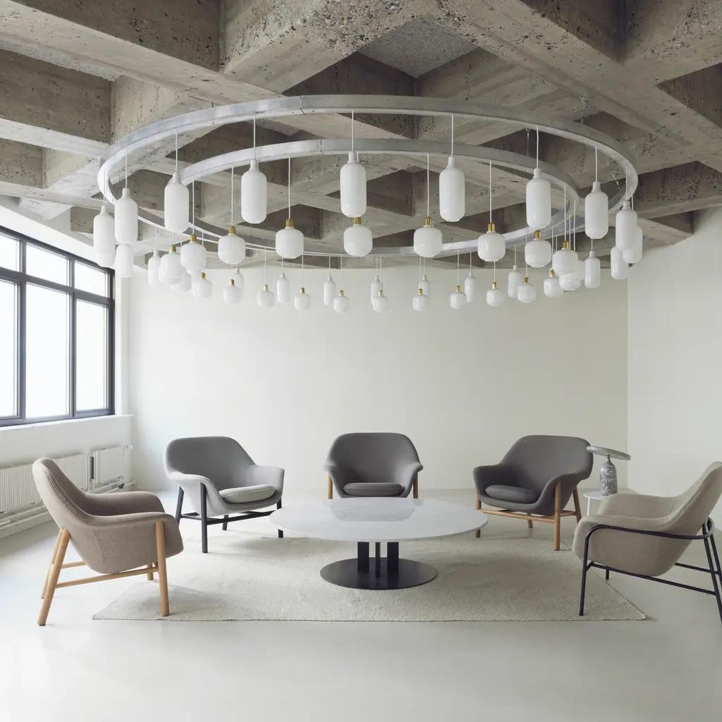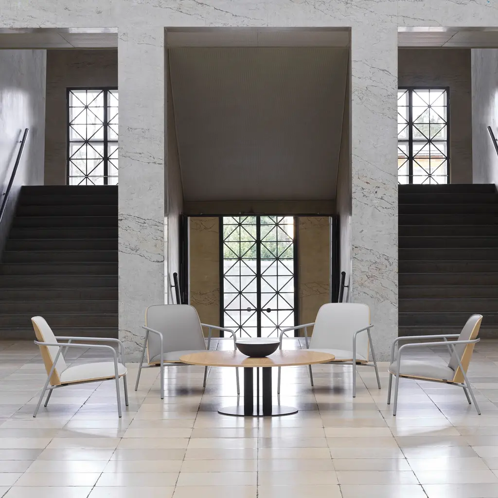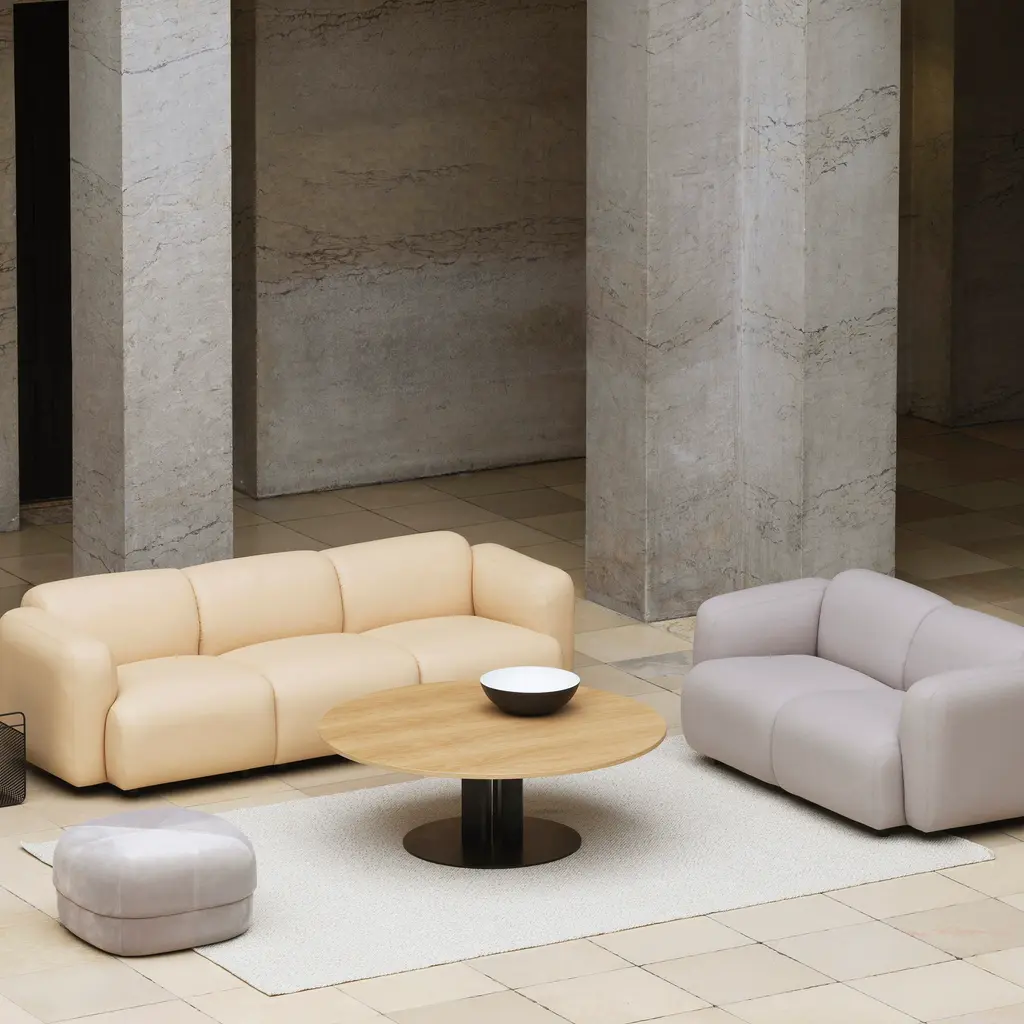 Designer Simon Legald plays with scale in his coffee table featuring an eye-catching arrangement of 4 columns made of solid steel with a black lacquer finish. Scalas defining variation on the classic architectural form shifts in perspective when viewed from different angles. The generous, convivial round tabletop is offered in 3 sizes with a host of complementary options in either oak veneer, several marble colorations or silvery stainless steel.
