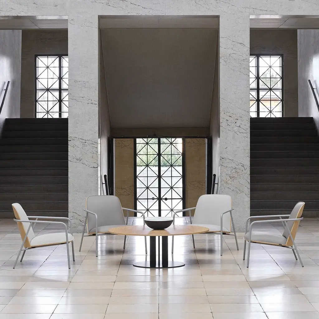 Scala table consist of a powder coated steel base with four poles. The tabletop comes in various sizes and shapes available in marble, veneer or stainless steel. The table is delivered flat-packed and must be assembled using the included tools. The tabletop is mounted with four screws.The marble tabletops are treated with a surface treatment that penetrates into the material and thereby provides a long-term protection. The surface should not be exposed to acidic foods or beverages, which can leave stains on the surface.