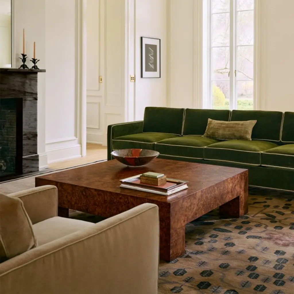 Deceptively simple design is elevated by the look of Mappa burl wood, thanks to the creative team at Barcelona-based Mermelada Estudio. Squares of contrast-rich burl are laid out at random, bringing fine craftsmanship to mind. Square coffee table's low profile and thick legs complement a variety of decor styles. CB2 exclusive.
