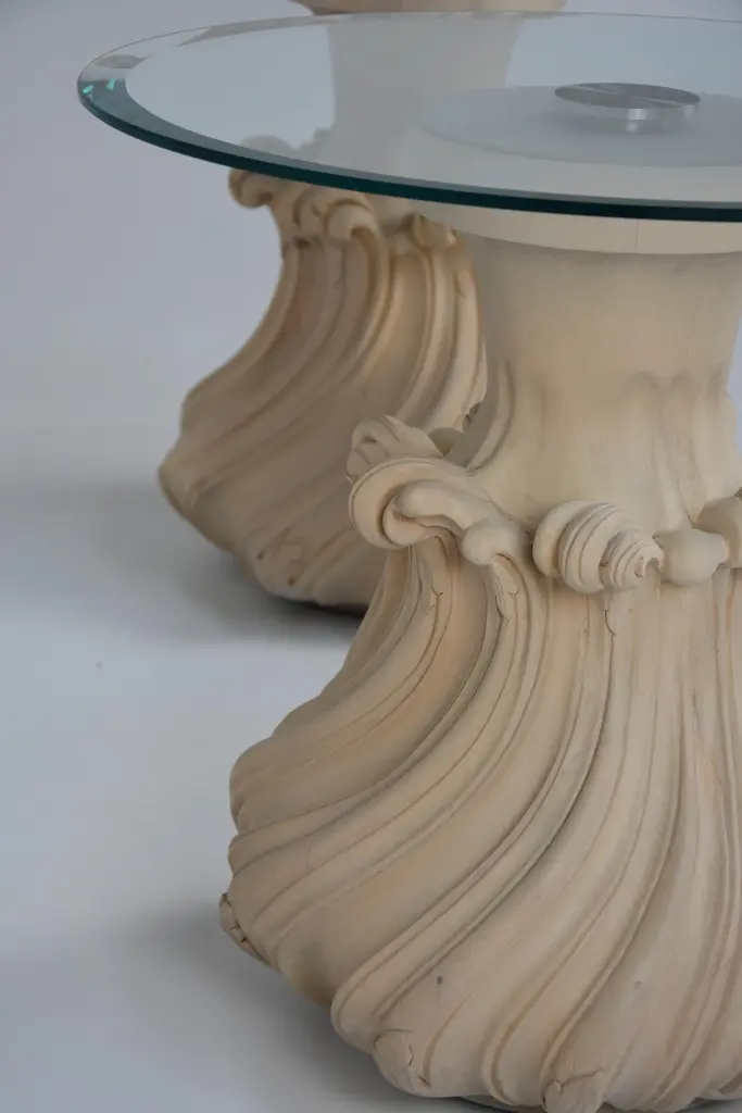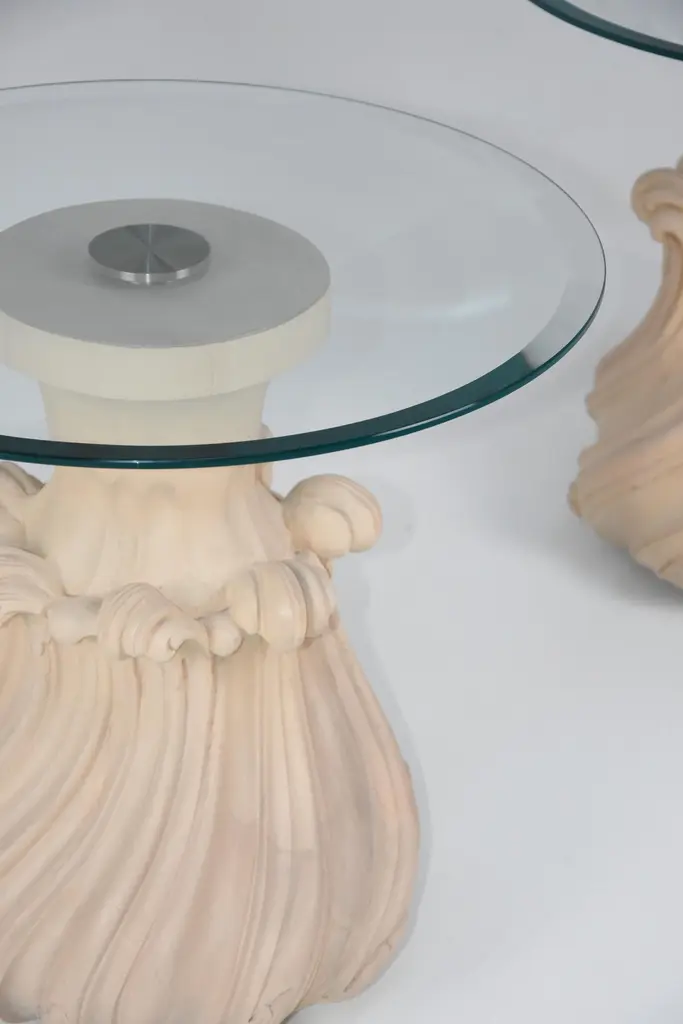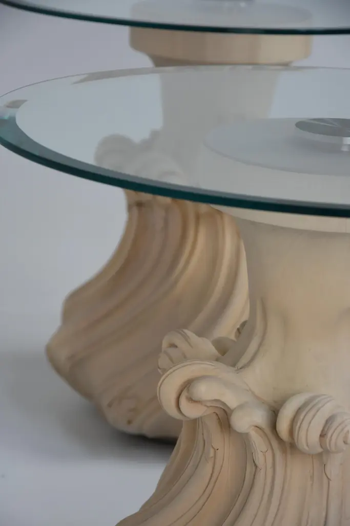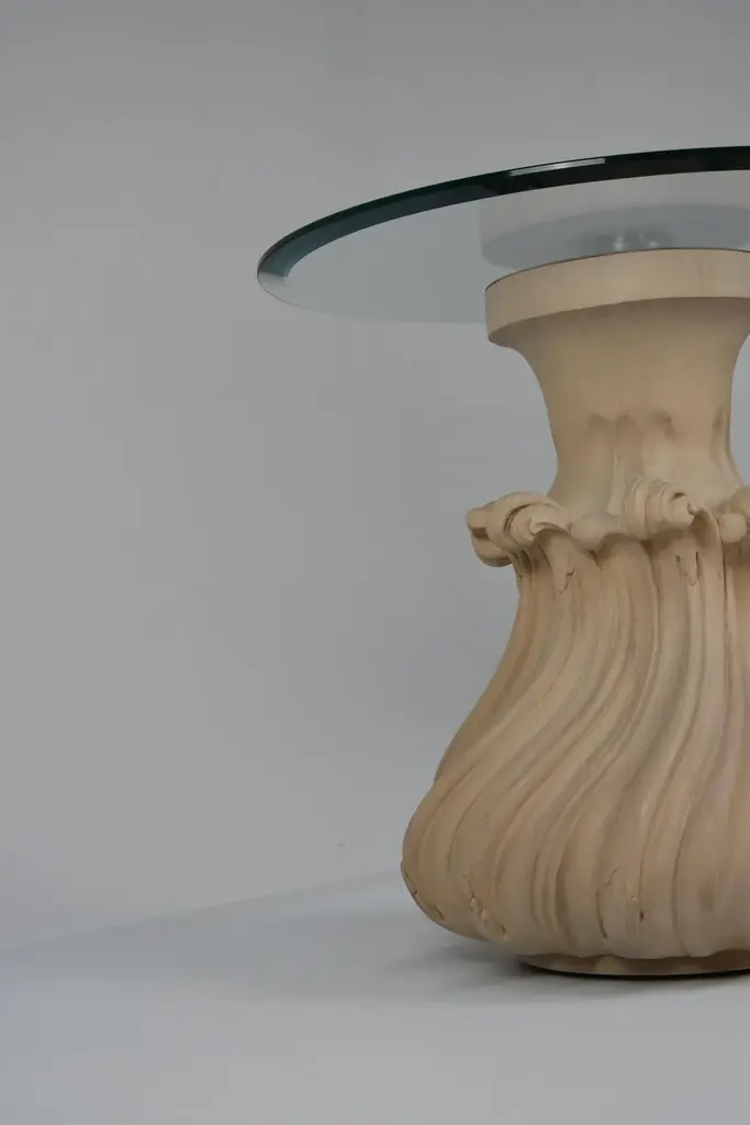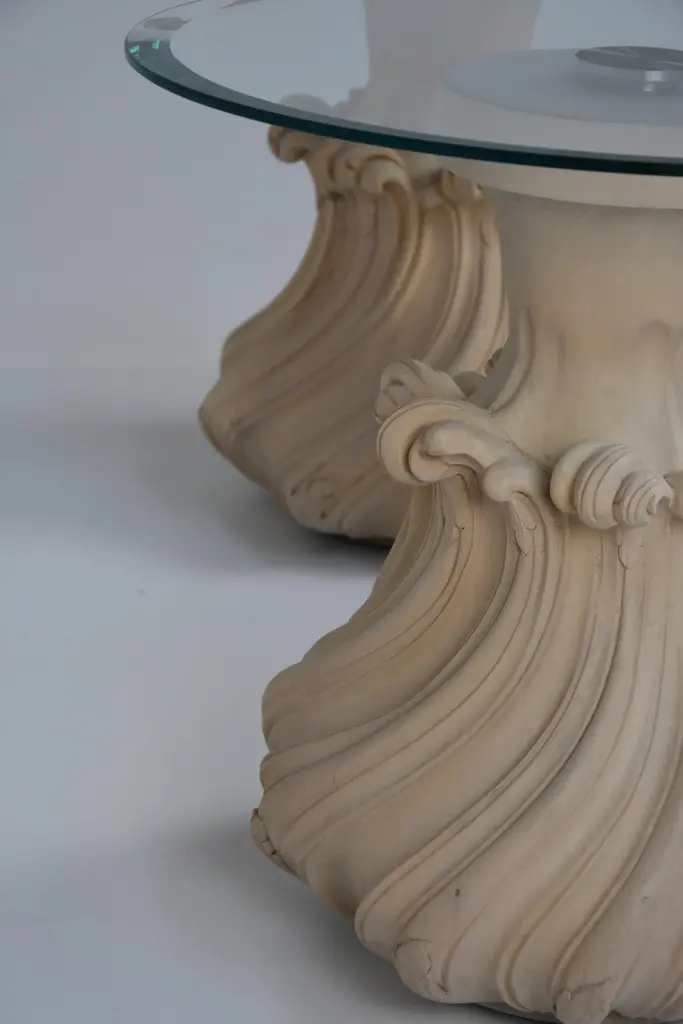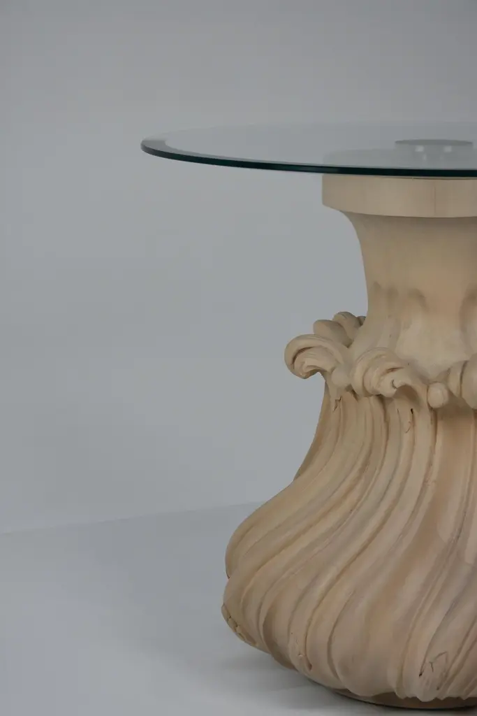 This exceptional piece features a carved wooden base and a beveled crystal top. The dusted gray base, which is a lacquering with patina, is a testament to meticulous craftsmanship, notched to form a fluid, rounded twisting shape that gracefully culminates in a distinctive Doric capital. This unique design not only adds a touch of architectural elegance but also provides a sturdy foundation for the glass top, enhancing the overall visual appeal.Scoubidou cocktail table has earned acclaim for its adaptability to various environments. Whether placed in a chic living room, a stylish lounge, or a sophisticated office, this table effortlessly becomes a focal point, elevating the ambiance with its modern and versatile design.Bring a touch of Italian design excellence into your space with the Scoubidou cocktail table—a creation that transcends trends and showcases Nigel Coates' visionary approach to furniture.