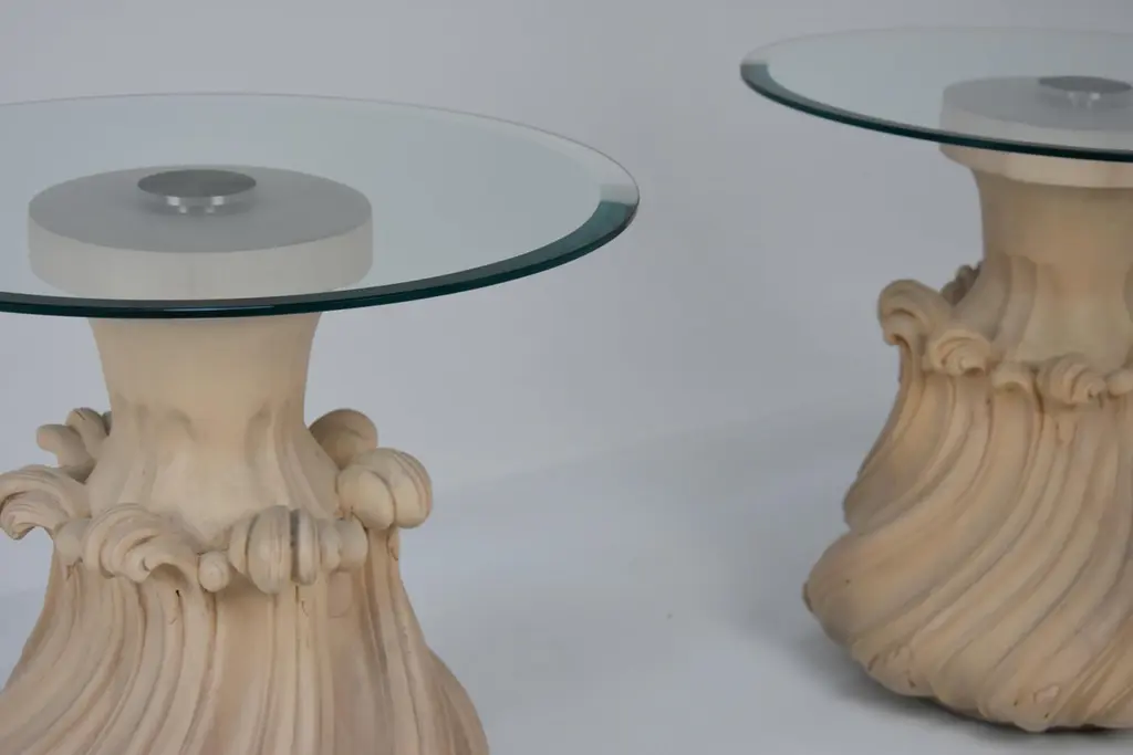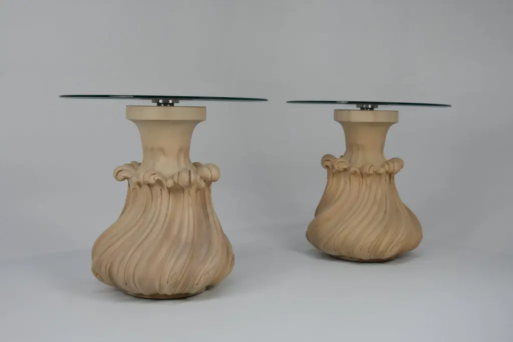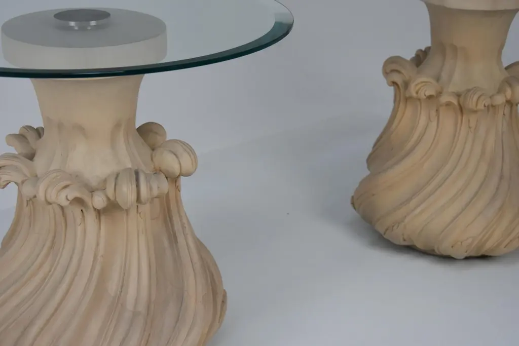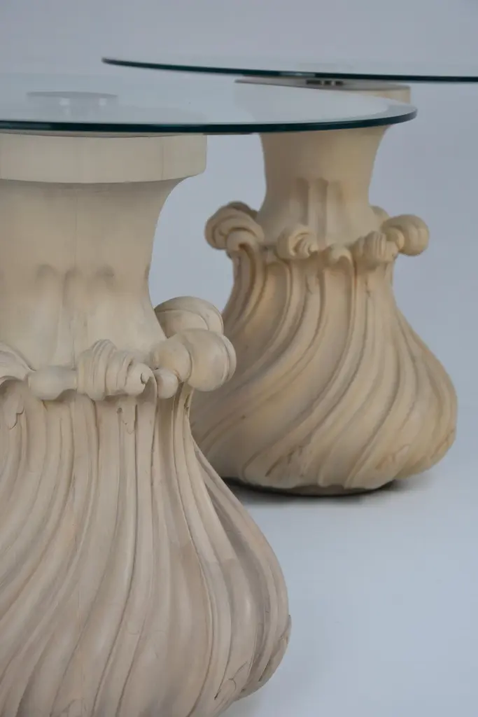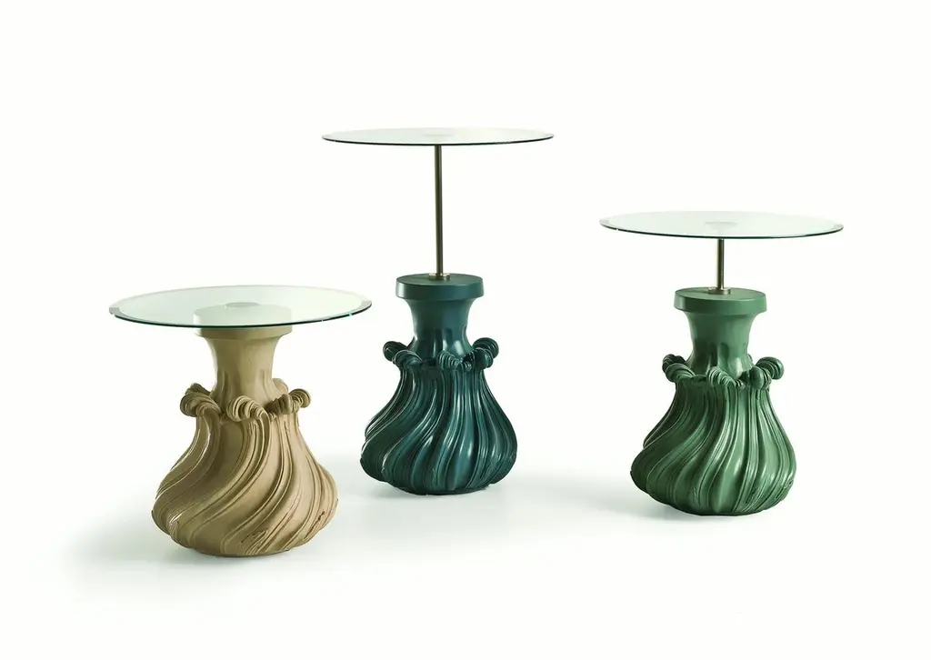 This exceptional piece features a carved wooden base and a beveled crystal top. The dusted gray base, which is a lacquering with patina, is a testament to meticulous craftsmanship, notched to form a fluid, rounded twisting shape that gracefully culminates in a distinctive Doric capital. This unique design not only adds a touch of architectural elegance but also provides a sturdy foundation for the glass top, enhancing the overall visual appeal.Scoubidou cocktail table has earned acclaim for its adaptability to various environments. Whether placed in a chic living room, a stylish lounge, or a sophisticated office, this table effortlessly becomes a focal point, elevating the ambiance with its modern and versatile design.Bring a touch of Italian design excellence into your space with the Scoubidou cocktail table—a creation that transcends trends and showcases Nigel Coates' visionary approach to furniture.