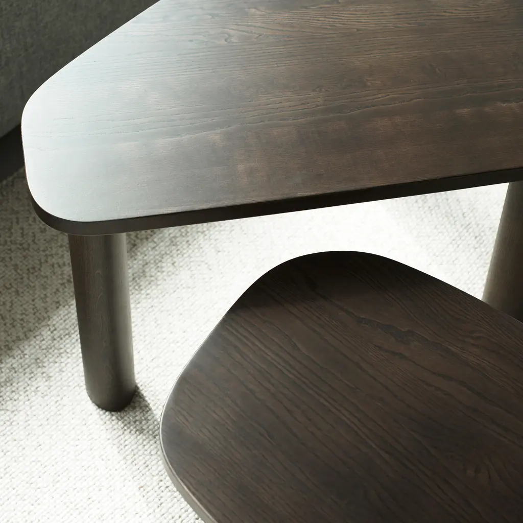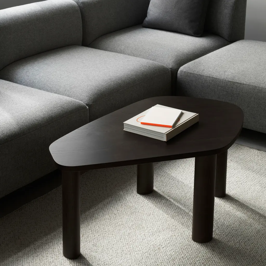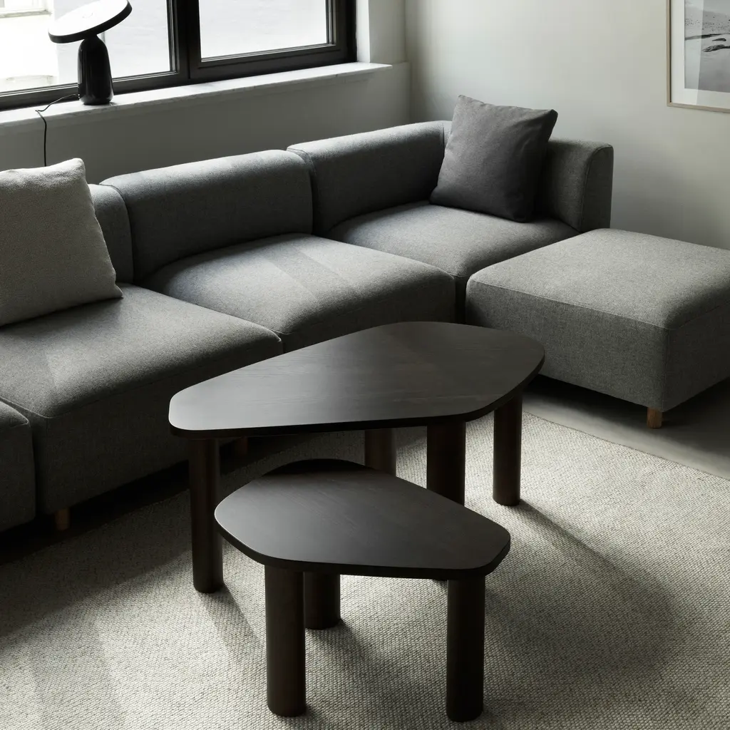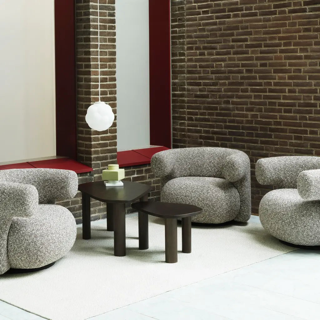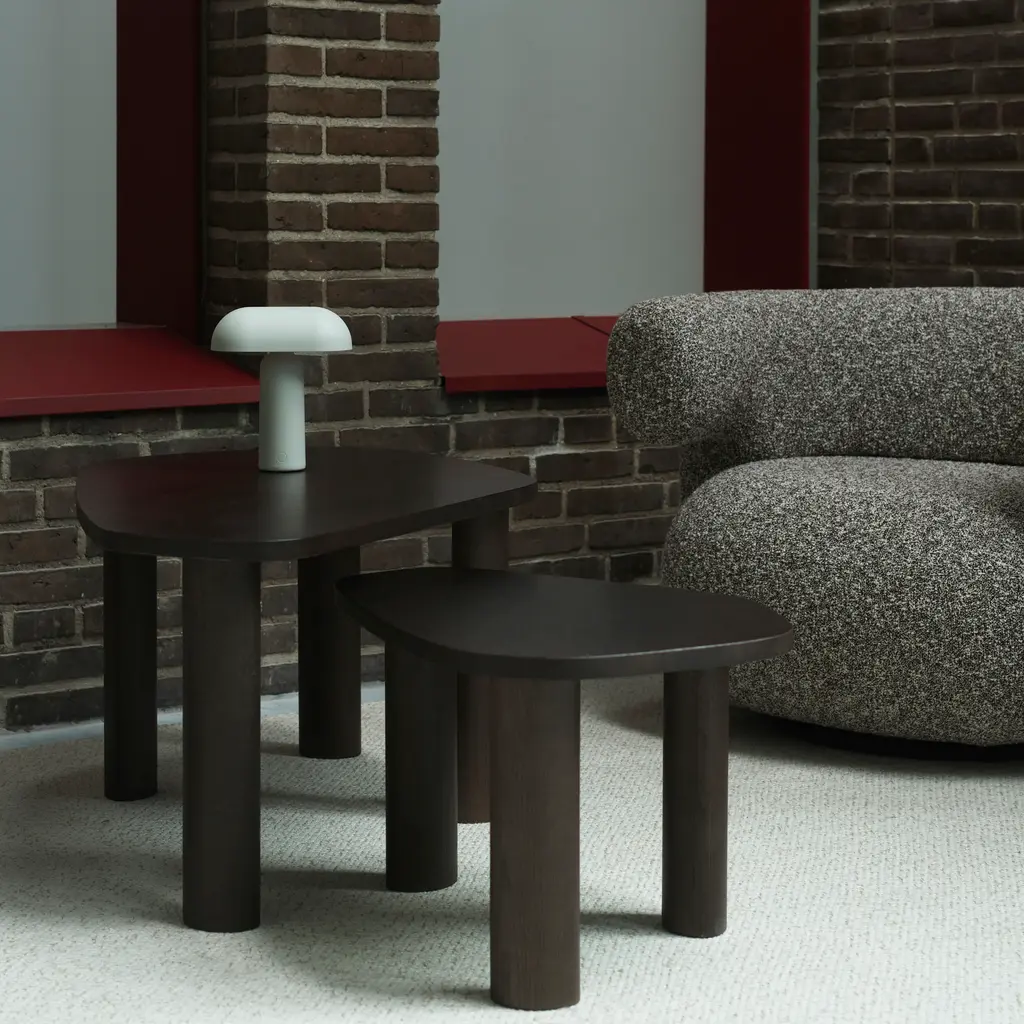 The Normann Copenhagen Sculp Coffee Table, designed by Simon Legald, features a flowing, organic silhouette that offers a modern twist on traditional forms. Crafted from solid ash wood with a deep brown stain, this table is available in two sizes, with the smaller variant designed to nest under the larger one, enhancing both functionality and aesthetic appeal. The design is noted for its hand-drawn, dynamic contours and unconventional, elliptical table legs, which provide a striking visual contrast while emphasizing the table's sculptural quality. This piece is particularly noted for its craftsmanship and the use of natural wood, giving it a warm, inviting feel suited to a variety of living spaces.
