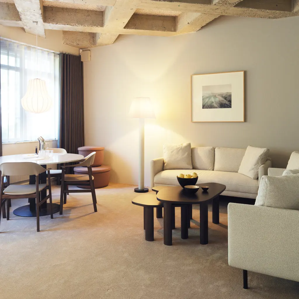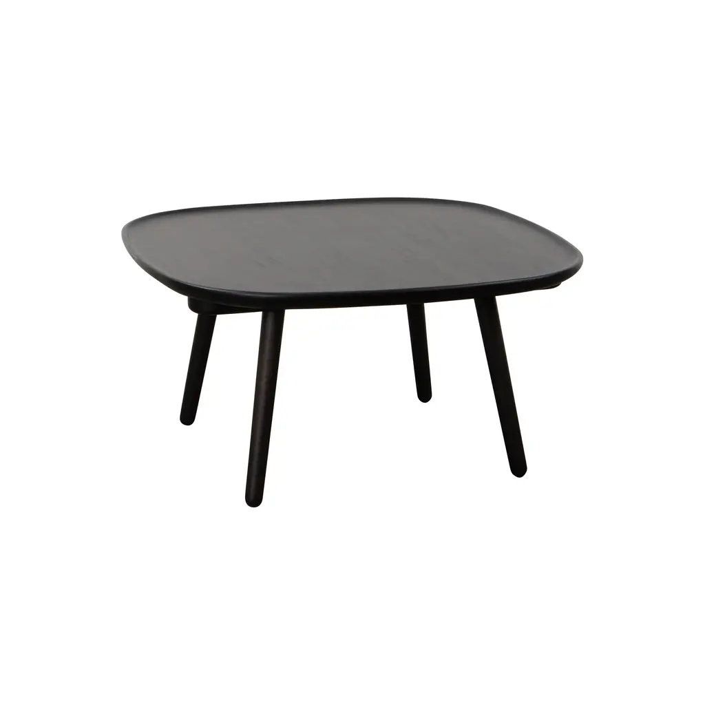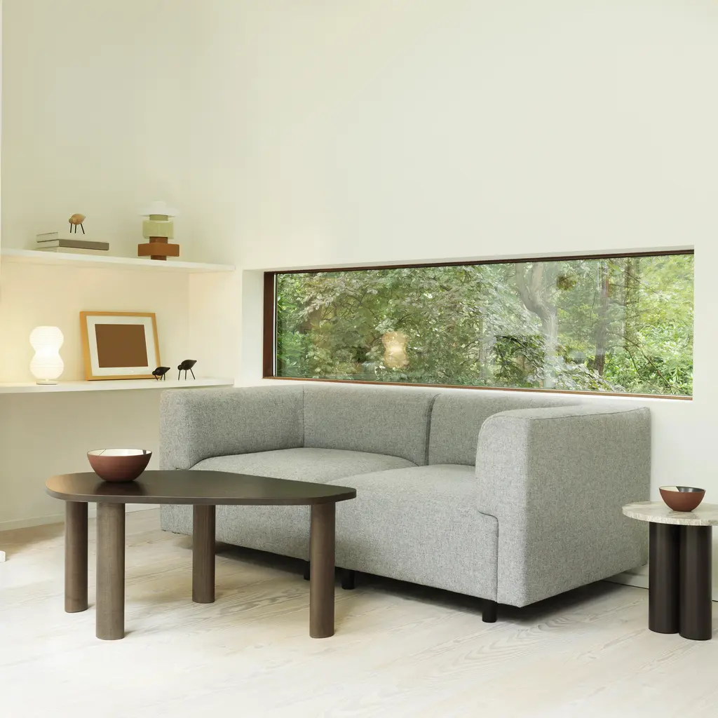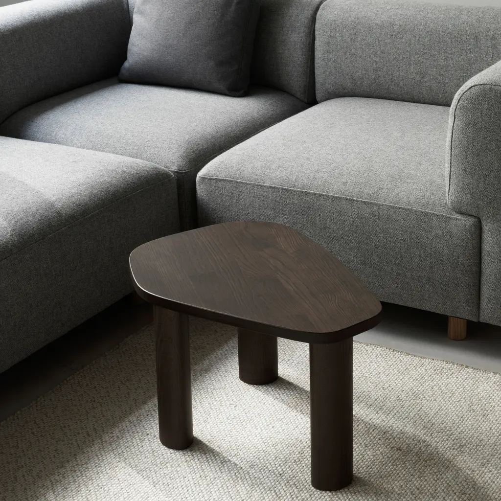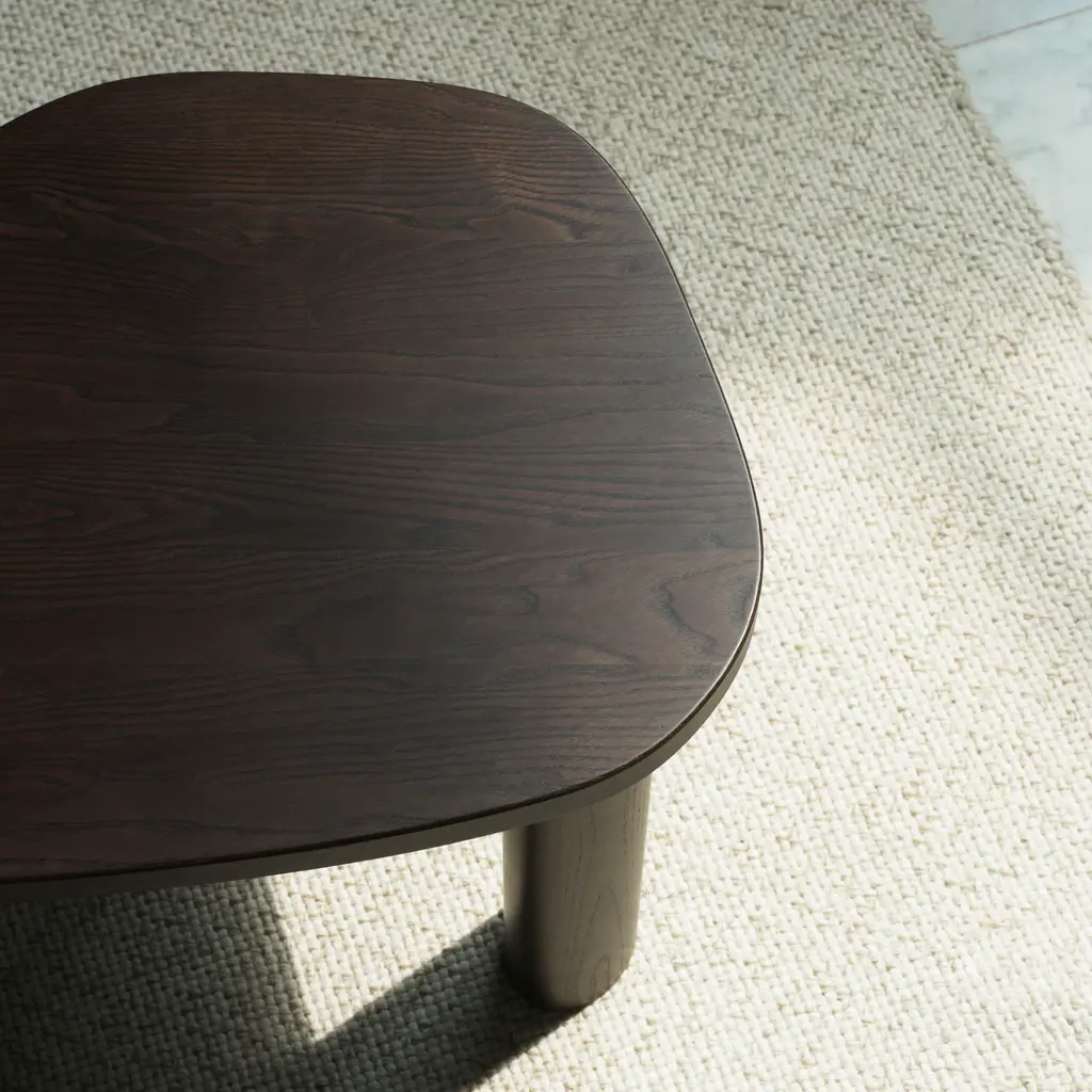 The Normann Copenhagen Sculp Coffee Table, designed by Simon Legald, features a flowing, organic silhouette that offers a modern twist on traditional forms. Crafted from solid ash wood with a deep brown stain, this table is available in two sizes, with the smaller variant designed to nest under the larger one, enhancing both functionality and aesthetic appeal. The design is noted for its hand-drawn, dynamic contours and unconventional, elliptical table legs, which provide a striking visual contrast while emphasizing the table's sculptural quality. This piece is particularly noted for its craftsmanship and the use of natural wood, giving it a warm, inviting feel suited to a variety of living spaces.