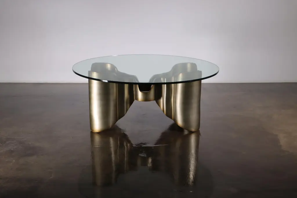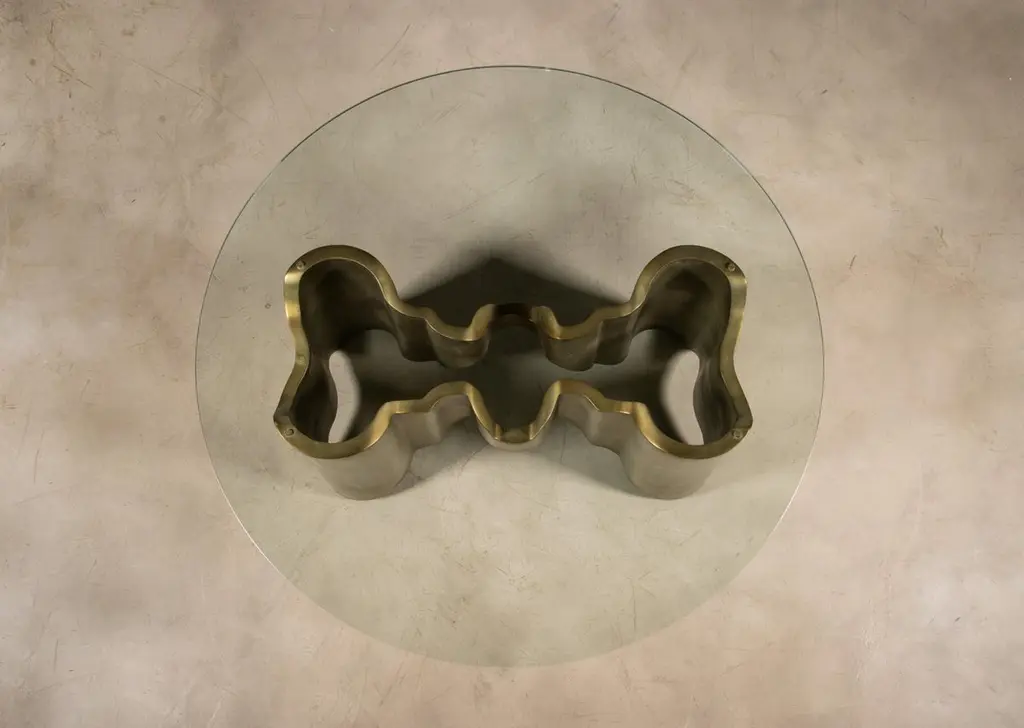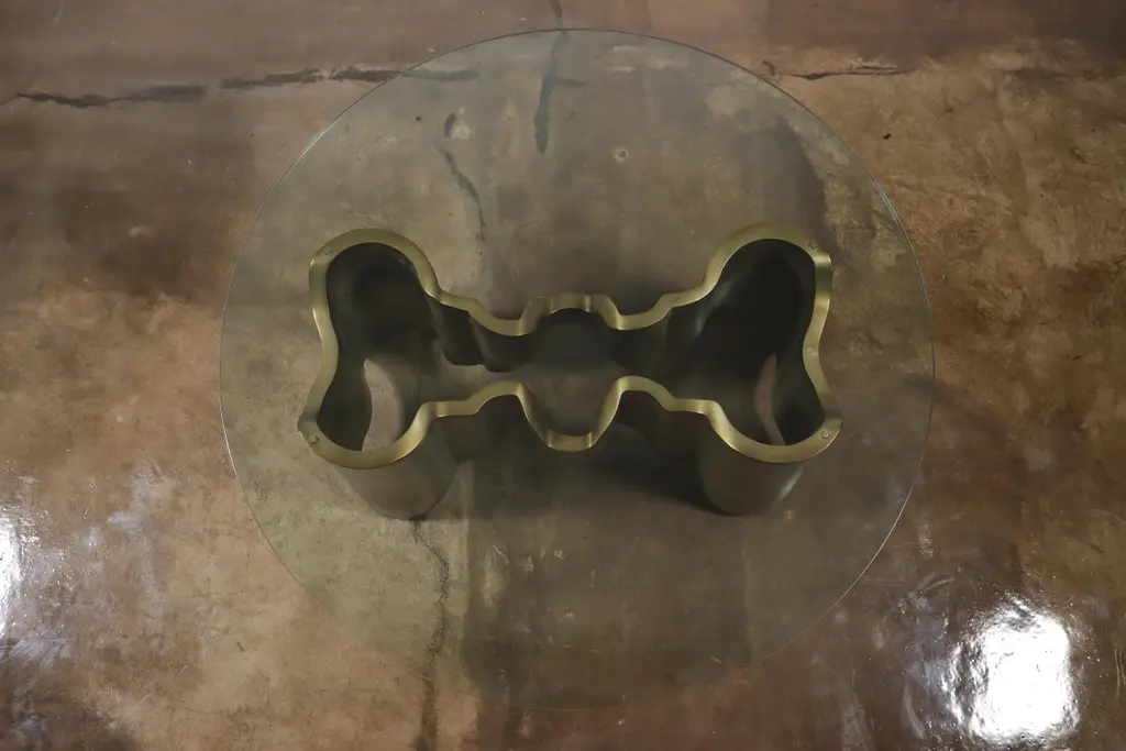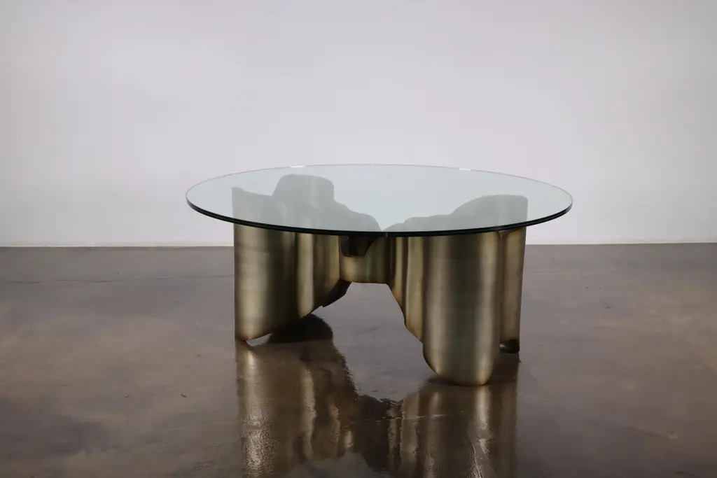 Sculptural Lacquered wood & glass coffee table by Costantini, Mariposa -In StockMeasurements are 42" round x 17" H Shown in a lacquered ombre finish but available in any color or wood. Other materials available are Argentine Rosewood, Oak, Maple, Cherry, Beech, Elm, Okume, Teak, African Teak, Bird’s Eye Maple, Black Maple, Bubinga, Cerused Oak, Cerused Gray Oak, Gray Oak, Ebony, Macassar Ebony, Striped Macassar Ebony, Walnut Burl, Sycamore, Walnut and Zebrawood. The top is also available in any type of stone; Carrara, Calcutta Gold, Nero Marquina, St Laurent, Blue Jeans, Onyx and more. Available in matte, semi-gloss, high gloss finish or lacquered. Available as shown or customizable to your desired size, shape, finish, and more.About Costantini Design Costantini has been a trusted source for custom furniture, objects and lighting for a global client base since 2002. Its founder and owner, William Stuart, is a designer and artist who began his career as a multimedia artist and sculptor, practices which continue to inform the work. With a studio showroom in New York and a team of artisans at their own workshop in Buenos Aires, the Costantini team is able to connect artisans and artists with acclaimed clientele around the world. Its artisans work across many disparate materials such as bronze, solid wood, fiberglass, steel, plaster, goatskin, leather, rush, iron, marble, sheepskin and more. Visit their New York or Buenos Aires locations by appointment.