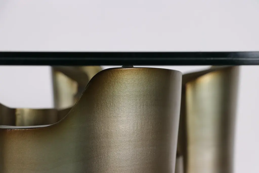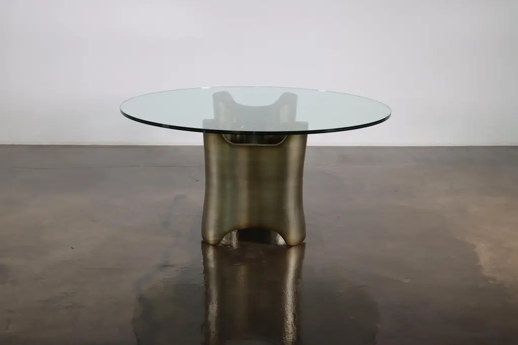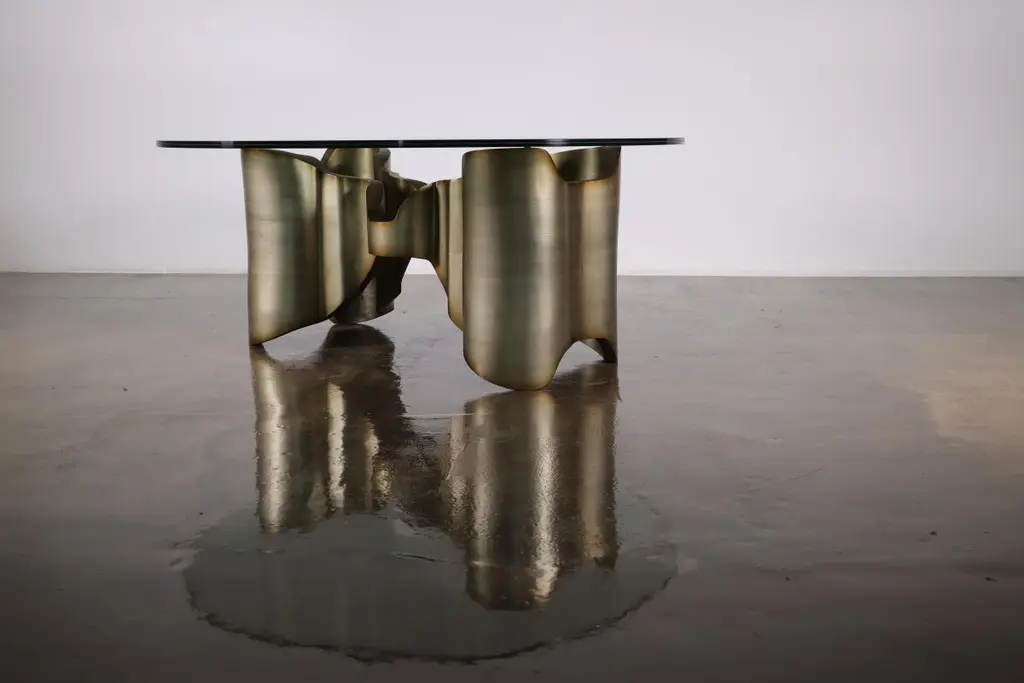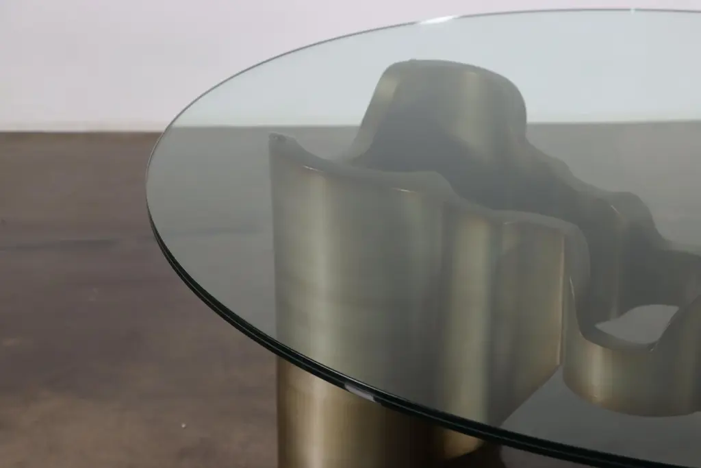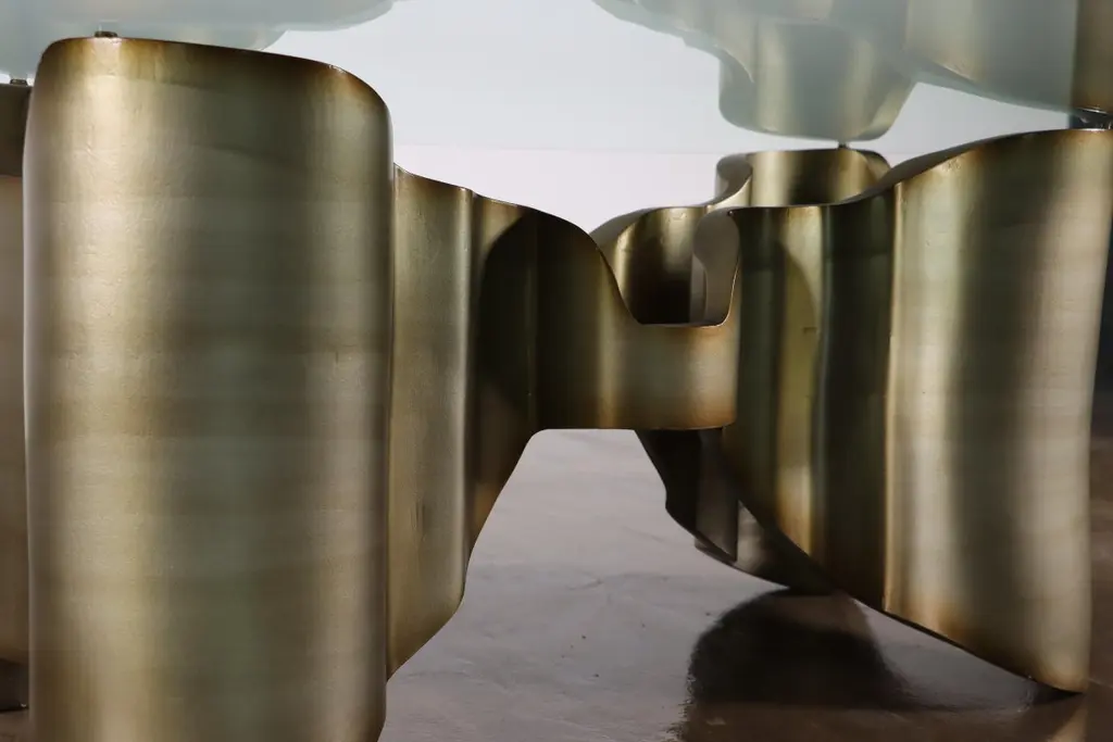 Sculptural Lacquered wood & glass coffee table by Costantini, Mariposa -In StockMeasurements are 42" round x 17" H Shown in a lacquered ombre finish but available in any color or wood. Other materials available are Argentine Rosewood, Oak, Maple, Cherry, Beech, Elm, Okume, Teak, African Teak, Bird’s Eye Maple, Black Maple, Bubinga, Cerused Oak, Cerused Gray Oak, Gray Oak, Ebony, Macassar Ebony, Striped Macassar Ebony, Walnut Burl, Sycamore, Walnut and Zebrawood. The top is also available in any type of stone; Carrara, Calcutta Gold, Nero Marquina, St Laurent, Blue Jeans, Onyx and more. Available in matte, semi-gloss, high gloss finish or lacquered. Available as shown or customizable to your desired size, shape, finish, and more.About Costantini Design Costantini has been a trusted source for custom furniture, objects and lighting for a global client base since 2002. Its founder and owner, William Stuart, is a designer and artist who began his career as a multimedia artist and sculptor, practices which continue to inform the work. With a studio showroom in New York and a team of artisans at their own workshop in Buenos Aires, the Costantini team is able to connect artisans and artists with acclaimed clientele around the world. Its artisans work across many disparate materials such as bronze, solid wood, fiberglass, steel, plaster, goatskin, leather, rush, iron, marble, sheepskin and more. Visit their New York or Buenos Aires locations by appointment.