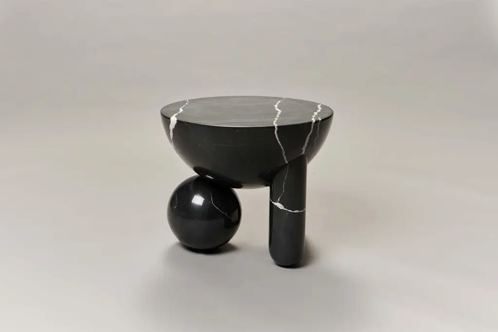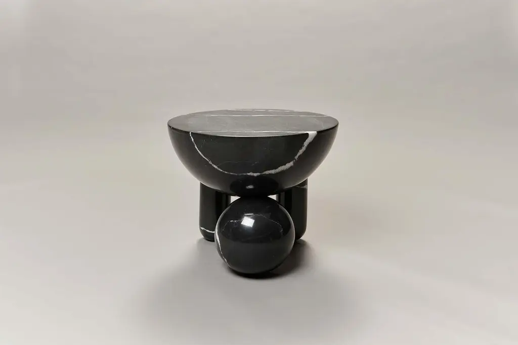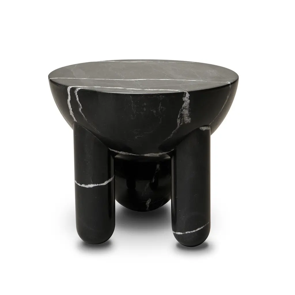 Profiterole small coffee table is 3D milled from nero marquina marble, supported by round dessert-like spheres and semi-cupped legs which support a rounded top. The coffee table also comes in white carrara marble, in either honed or hand polished finish.