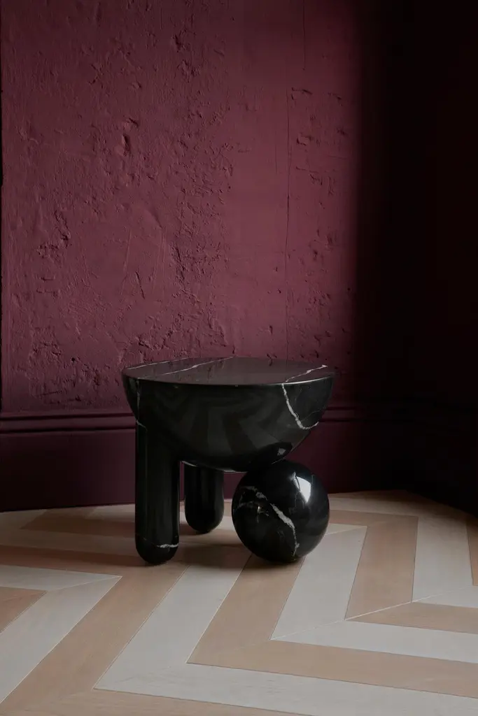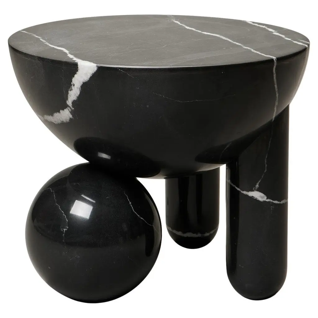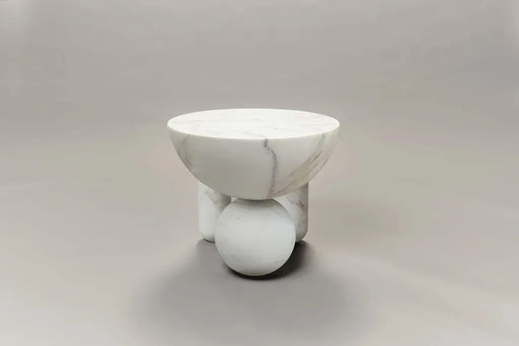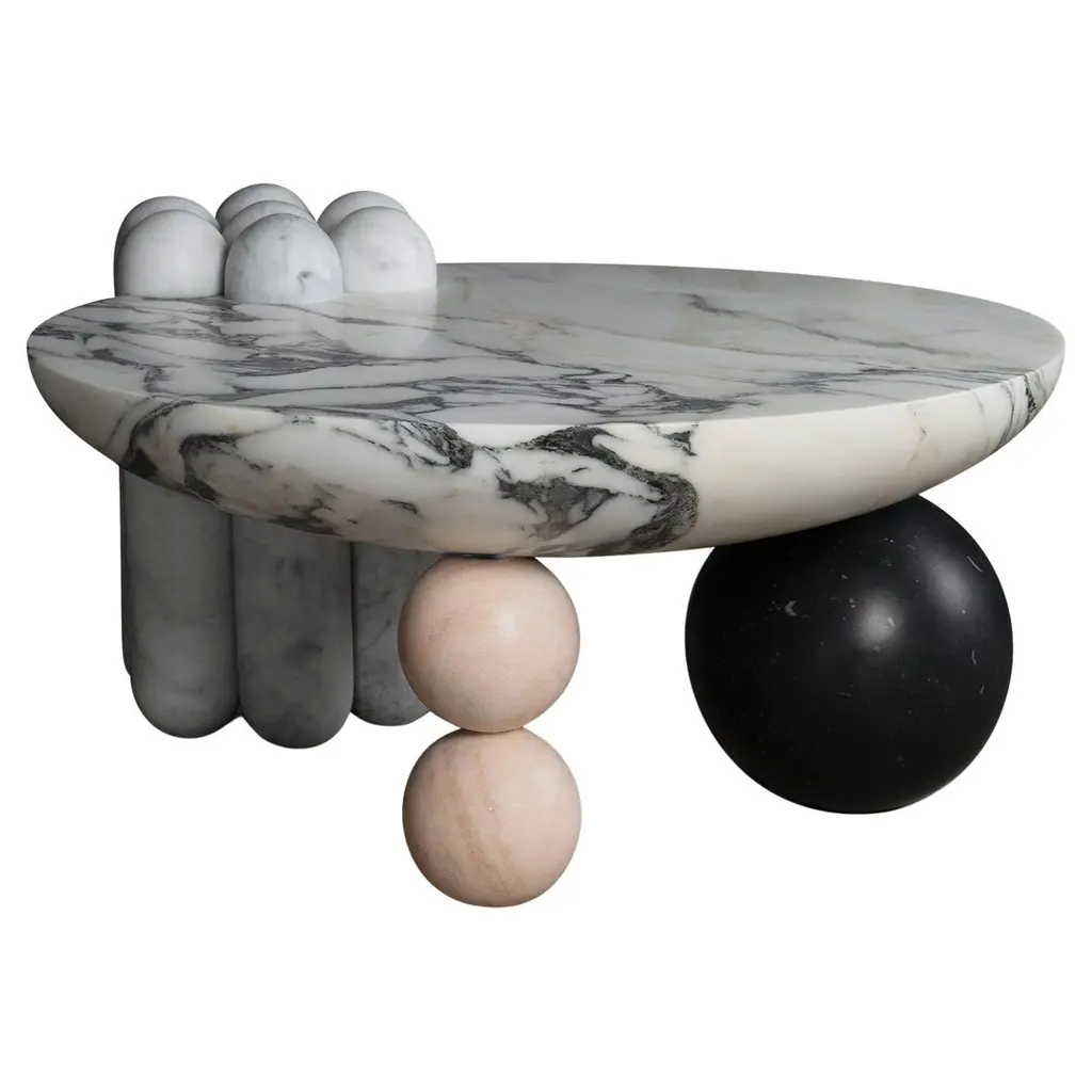 Profiterole small coffee table is 3D milled from calacatta oro marble, supported by round dessert-like spheres and semi-cupped legs which support a rounded top. The coffee table also comes in white carrara marble and black nero marquina, in either honed or hand polished finish.