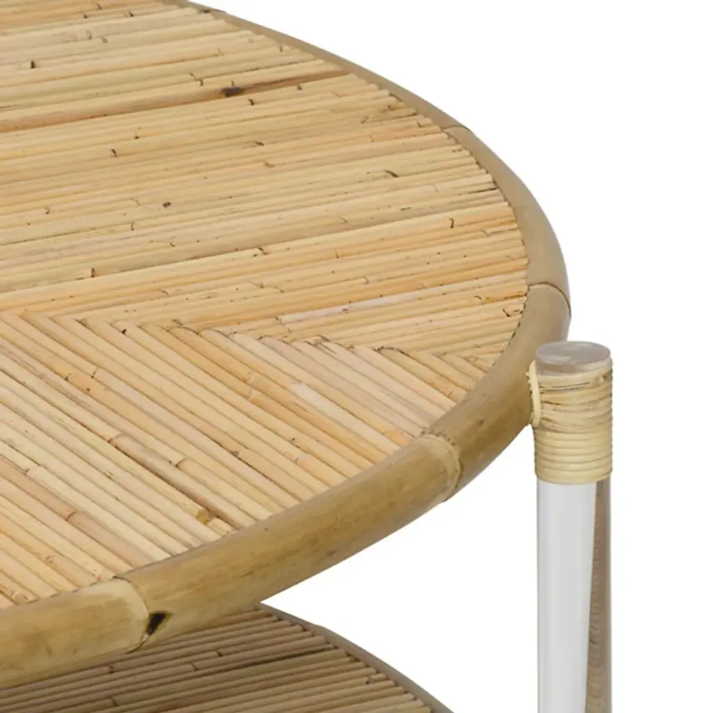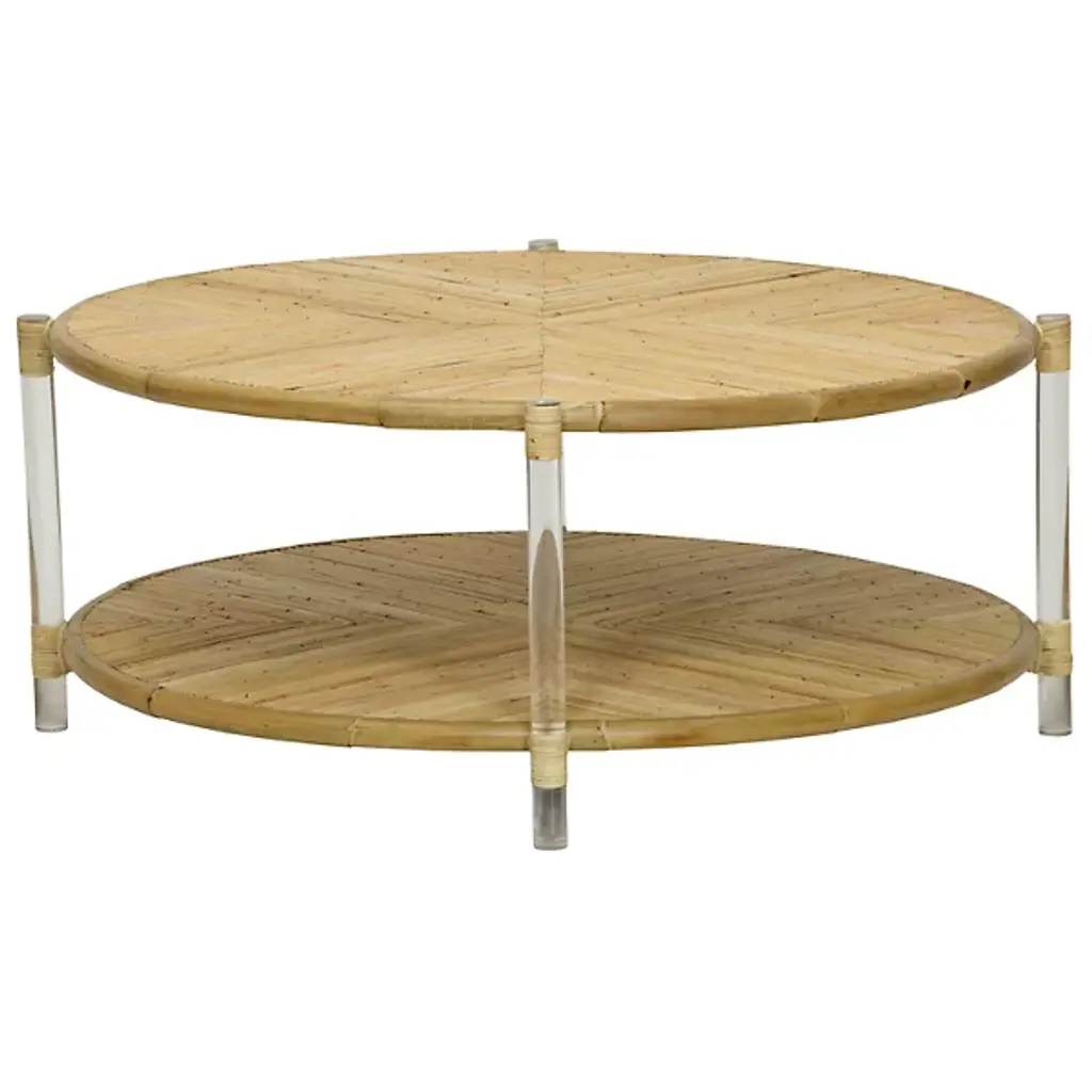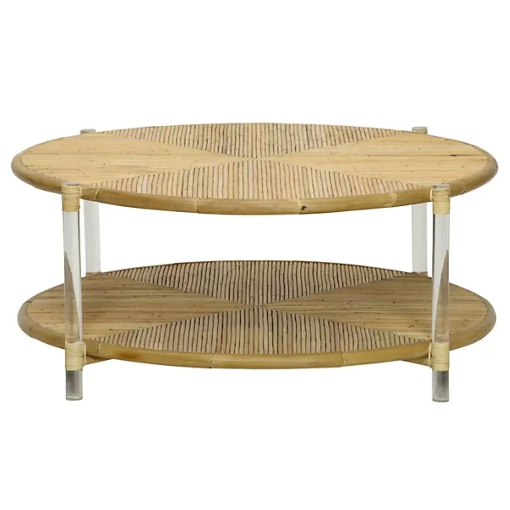 The Sea Cliff Coffee Table from Woven merges rattan craftsmanship with modern materials. Inlaid patterns on dual surfaces create interest from every angle, while acrylic supports maintain an open feel. The two-tier design offers practical storage without compromising its light presence. Each detail shows careful consideration, from the wrapped joints to the pattern placement. A perfect addition to coastal homes or any space seeking to combine natural materials with contemporary design.