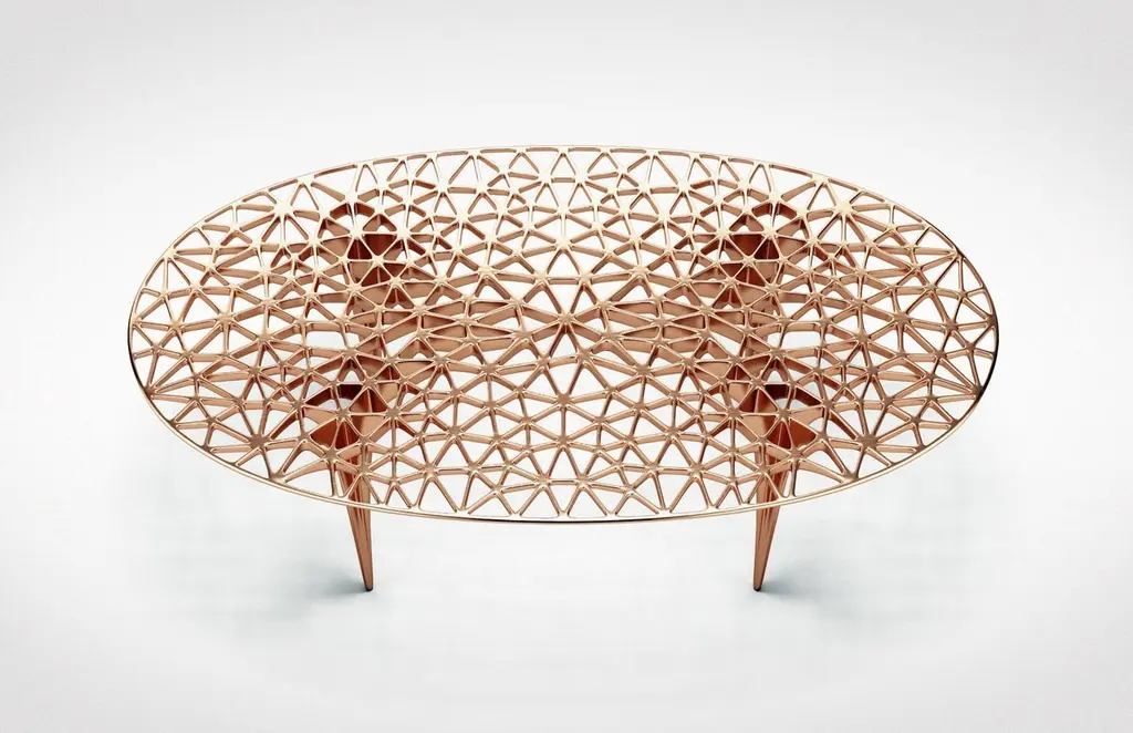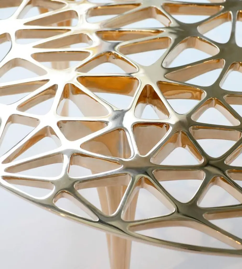A polished bronze coffee table inspired by the infamous red rocks of Sedona; the form references the peaks and plateaus of Sedona’s unique sandstone Formations. This design has a strong Silhouette and delicate, organic triangular detailing.Polished bronze, bronze table, round coffee table, cocktail table, glass top coffee table