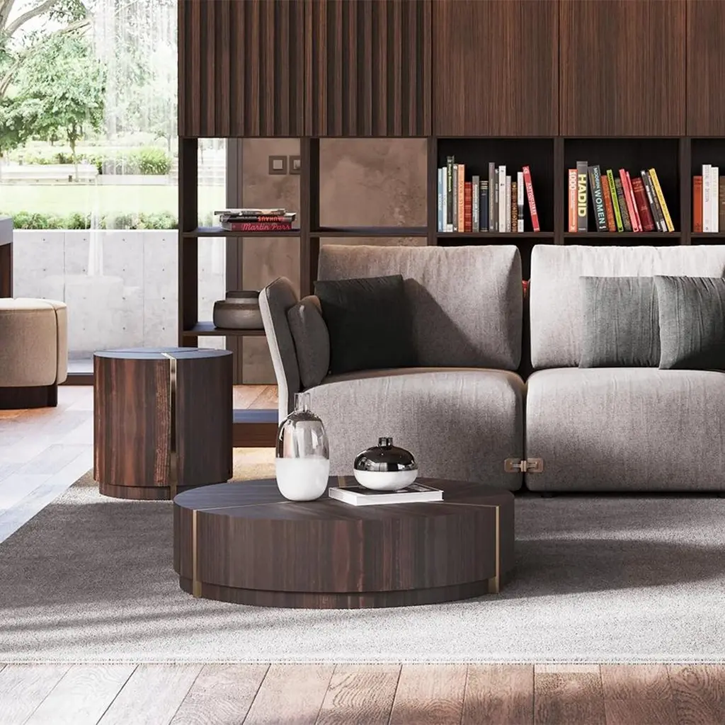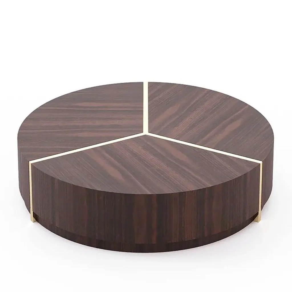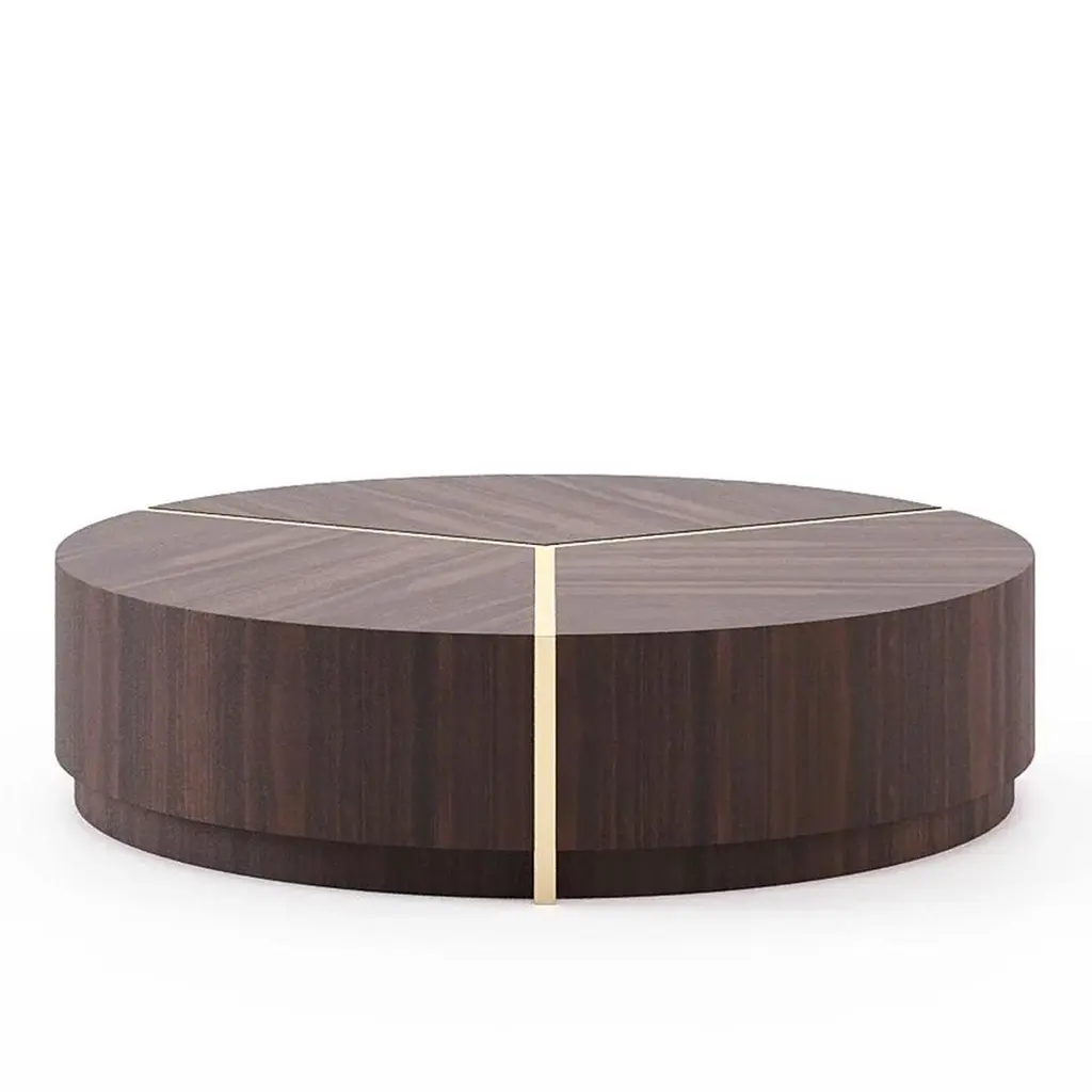 Coffee table Sega with structure in smocked eucalyptus veneeredwood in matte finish, with polished stainless steel trims in gold finish.Also available in ebony matte finish, or grey oak matte finish,or natural oak finish, or rosewood matte finish, or in walnutmatte finish, on request.
