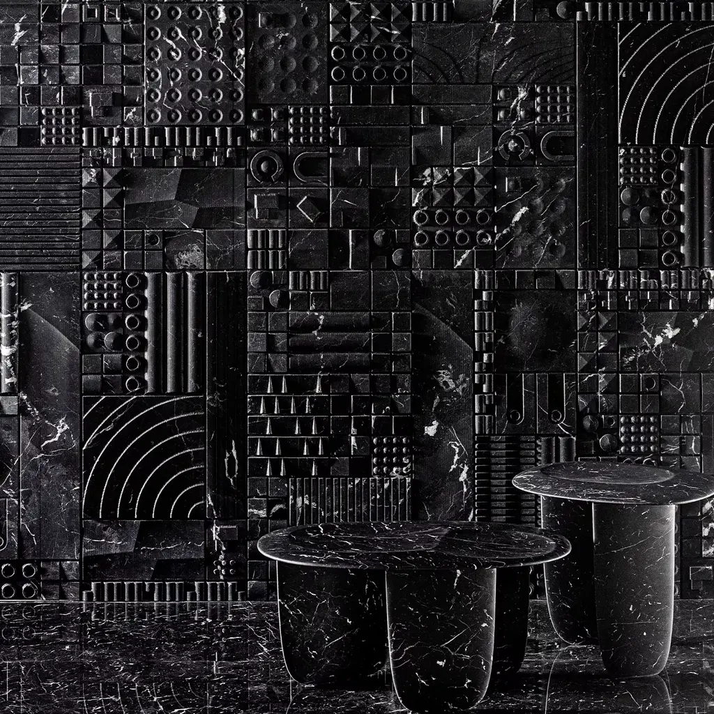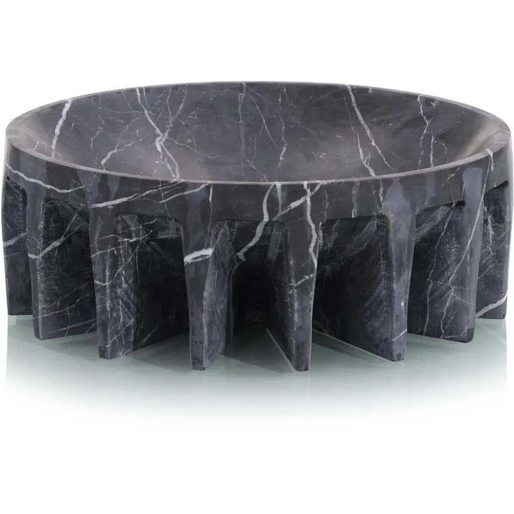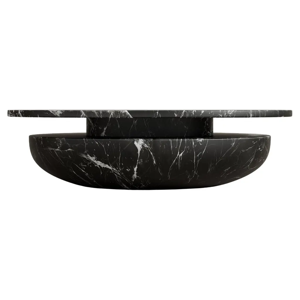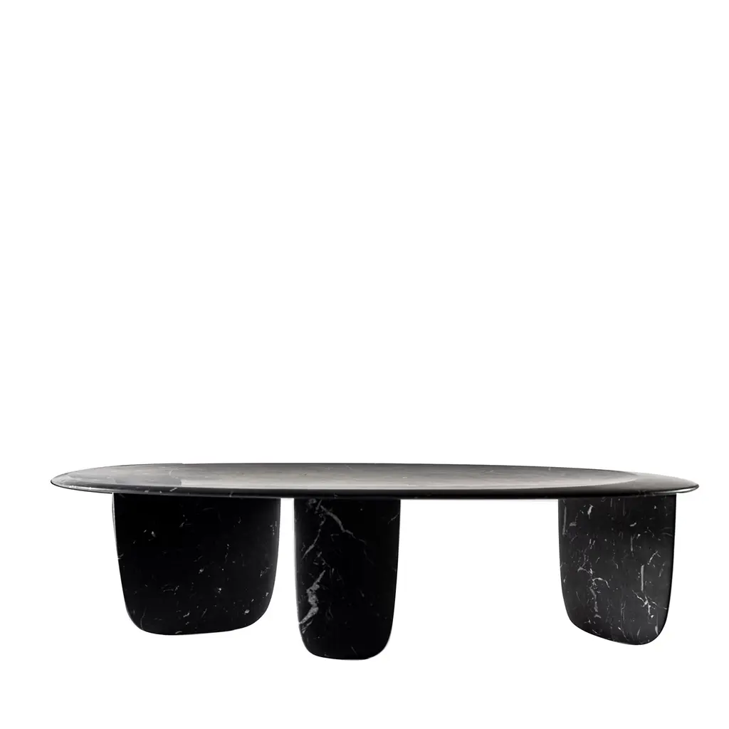 SESI B - coffee table in Nero Marquinia marble Small is a stone table recognizable by the unique curved lines which resemble the pebbles marked by the seawater, placed one on top of the other, like balancing building blocks on the seashore. It is named after the enigmatic, commemorative buildings shaped like truncated cones or more precisely like the typical Seso buildings found around the island. Please ask Concierge for details.