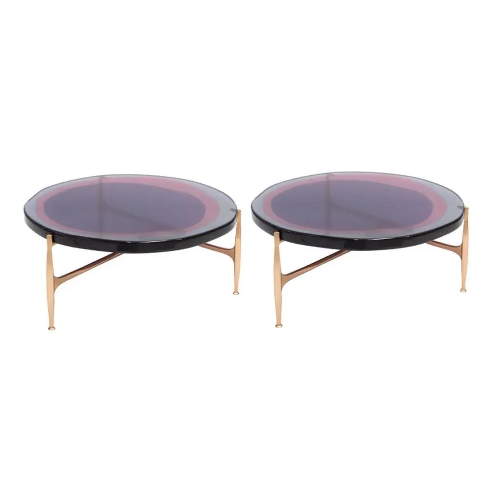 Set of 2 Agatha coffee tables by Draga & AurelDimensions: W 90 x D 90 x H 39.5 Top Ø 90 cmMaterials: Resin and bronzeThe Agatha coffee tables are featured by irregular circular tops of transparent andcolorful resin sit on a bronze frame with a staggered placement, inspired by clustersof wildflowers.The table tops’ process of creating requires a special technique of casting resinentirely made by hand in the Draga & Aurel laboratory of Como. Playing with vibrantcolor combinations, also incorporating any random mistakes and accidents, thematerial is melted into several layers creating fluid, deep, unique table tops. Thestructure in bronze is made by casting. Thanks to a handcrafted, artistic process thecoffee tables are featured by a special matte effect in earth-colored.Founded in 2007 in the town of Como, Italy, Draga & Aurel is a multidisciplinary design studio that works along the spectrum of furniture, textile and interior design. Draga Obradovic began her career in the fashion industry, first working in London and Milan as a textile designer before eventuallysettling in Como. Aurel K. Basedow graduated from Milan’s Accademia di Belle Arti with a degree in Fine Arts, having previously trained as a carpenter and woodworker. Thanks to their sympathetic methods, combined with an artist’s approach to material and composition Draga & Aurel are widelyrecognized for their clever reinvention of bespoke vintage design pieces.Their showing at 2009 Salone del Mobile introduced the duo to the world stage; it followed the partnerships with several companies that have pushed the pair’s domain beyond the reinvention of singular vintage pieces. While interior projects have expanded their sought after aesthetic into the realm of hospitality and lifestyle. In occasion of the 2019 Milan Design Week the design duo presented Transparency Matters, an exhibition of limited edition pieces, entirely fabricated by hand in their Como atelier.