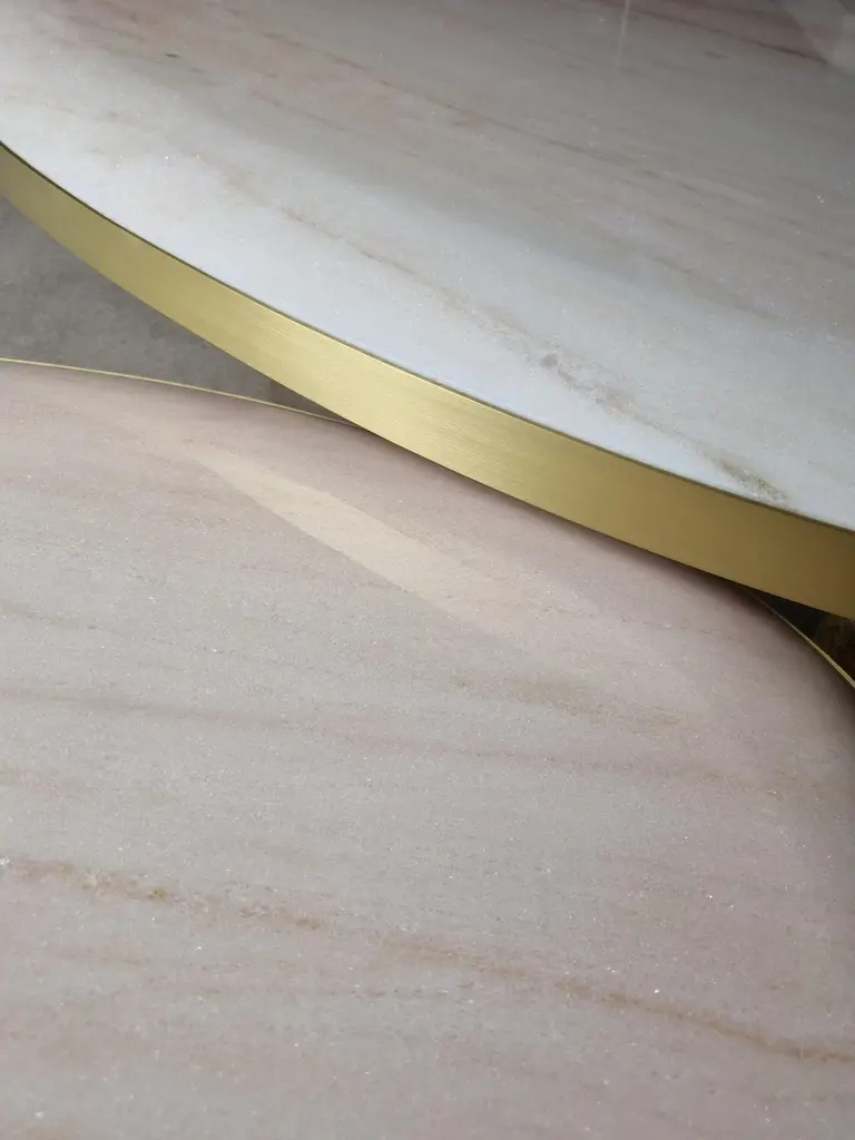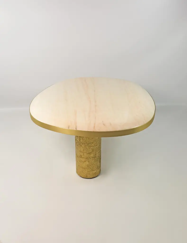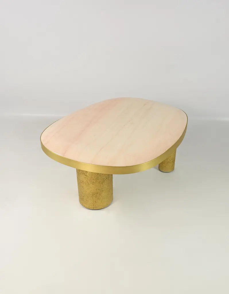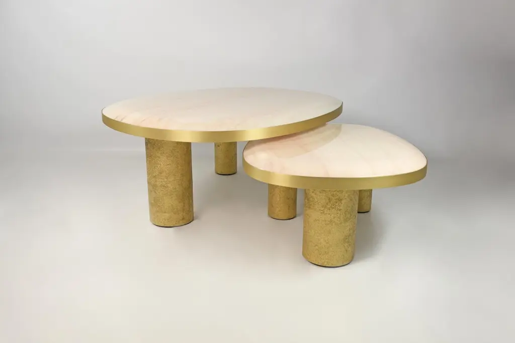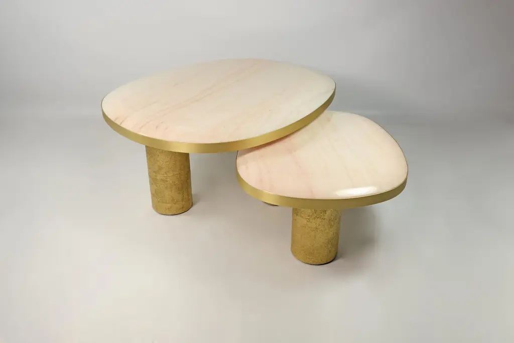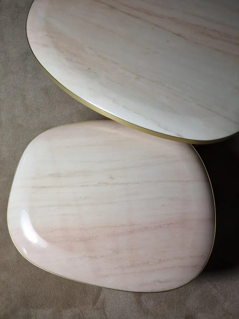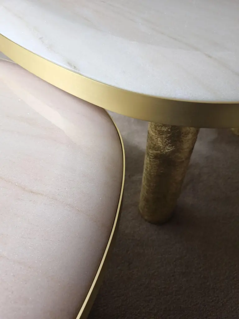 The set of 2 ovoid coffee tables is made of a luxurious polished marble top. The Rosa Aurora marble has a very subtile colour from the cream to the light pink with soft veins.The edges of the top are in brushed brass.Each table has three cylinder legs made of gilded semi raw glass fiber.The top of the tables is slightly cambered on the edges, and it gives a really nice organic style . The dimensions of the tables are:39,37" x 31,5" x 15,7" (100x80x40cm)27,5" x 22,4" x 12,6" (70x57x32cm)Care instructions:Keep the materials dry and protected from heat surfacesTo clean, simply wipe with a dry clean clothDo not use any cleaning agent on the surfaceThis piece is handmade by our talented master craftsmen.Ginger Brown is a family-owned company based in Normandy, France that has been creating collections of furniture and decorative accessories since 2001. Referring to the great period of early 20th century furniture makers, Ginger Brown strives to make each piece unique. Each piece of furniture, entirely handcrafted, is unique and created in collaboration with specialized artisans who use ancestral techniques to transform and sublimate raw materials. Mainly based on leather sheathing (shagreen, parchment) or marquetry (mother-of-pearl, fibers, stones), the collections are constantly evolving and can be adapted to the personalized demands of the clients.Whether futuristic, organic or classic, Ginger Brown’s creations are inspired by nature and architecture, and appeal as well names in international interior design. Ginger Brown also offers custom-made products to its clients.