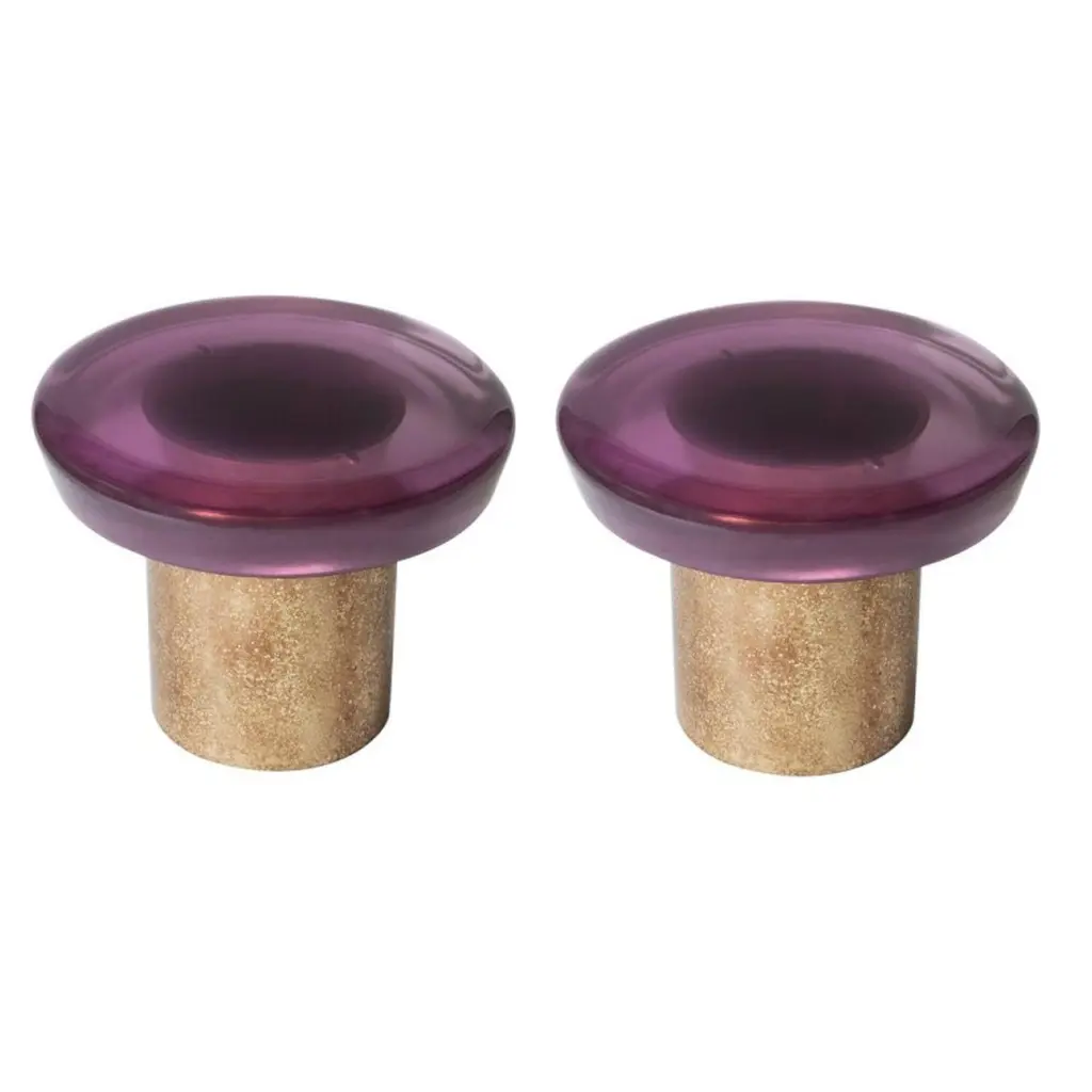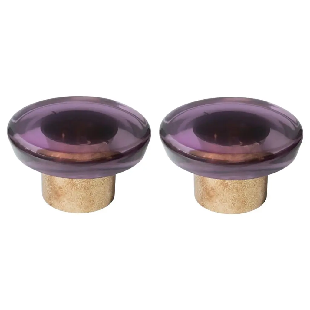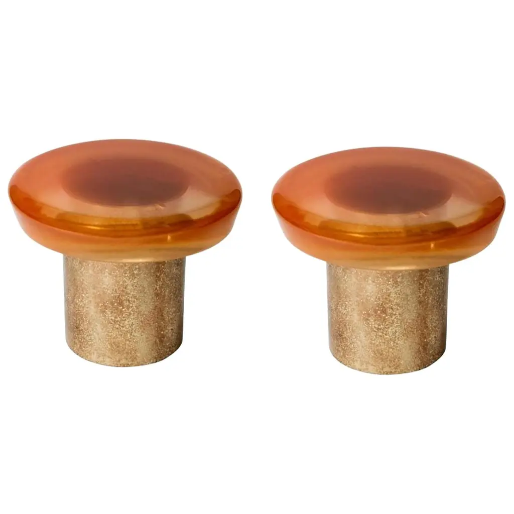Set of 2 Jade coffee tables by Draga & Aurel.Dimensions: W 50, D 50, H 38, top Ø 50 cm.Materials: Resin and bronze.Also available: W 50, D 50, H 28, top Ø 50 cmFormed from a combination of reflective resin and solid brass, the Jade coffee tables look like precious gems.The surface is made by hand in resin of 10 cm high: each one takes over a week to cast. Thanks to a handcrafted surface treatment, special brass veins characterize the structure of the coffee tables.Inspired by the magical mineral color palette of Transparency matters, these coffee tables are featured by ethereal transparency, luxurious sensitivity, and a reflective surface that plays poetically with the light, reflecting your gaze as a functional work of art.Founded in 2007 in the town of Como, Italy, Draga & Aurel is a multidisciplinary design studio that works along the spectrum of furniture, textile and interior design. Draga Obradovic began her career in the fashion industry, first working in London and Milan as a textile designer before eventuallysettling in Como. Aurel K. Basedow graduated from Milan’s Accademia di Belle Arti with a degree in Fine Arts, having previously trained as a carpenter and woodworker. Thanks to their sympathetic methods, combined with an artist’s approach to material and composition Draga & Aurel are widelyrecognized for their clever reinvention of bespoke vintage design pieces.Their showing at 2009 Salone del Mobile introduced the duo to the world stage; it followed the partnerships with several companies that have pushed the pair’s domain beyond the reinvention of singular vintage pieces. While interior projects have expanded their sought after aesthetic into the realm of hospitality and lifestyle. In occasion of the 2019 Milan Design Week the design duo presented Transparency Matters, an exhibition of limited edition pieces, entirely fabricated by hand in their Como atelier.