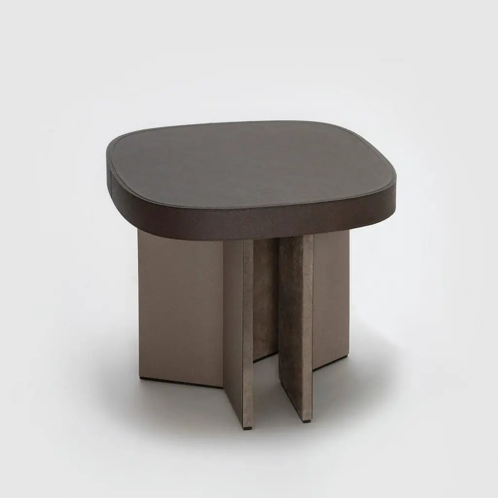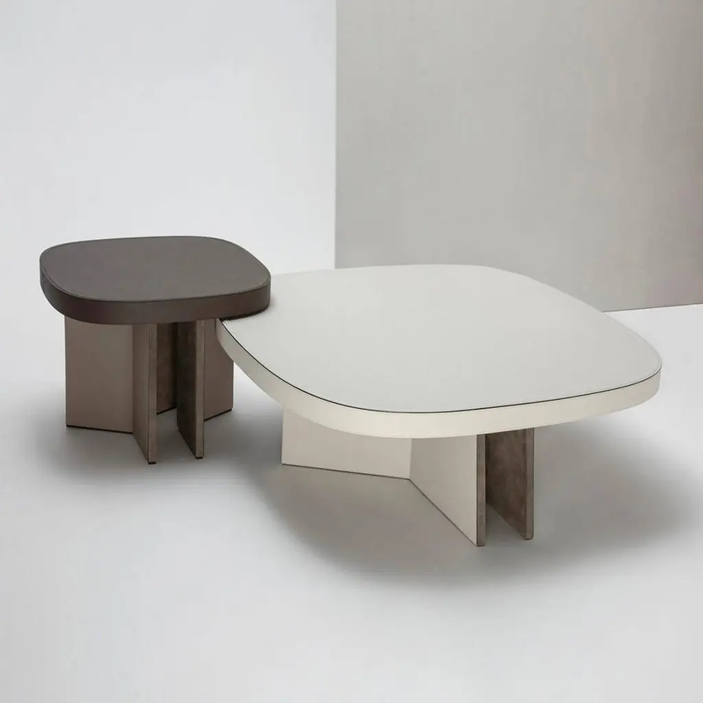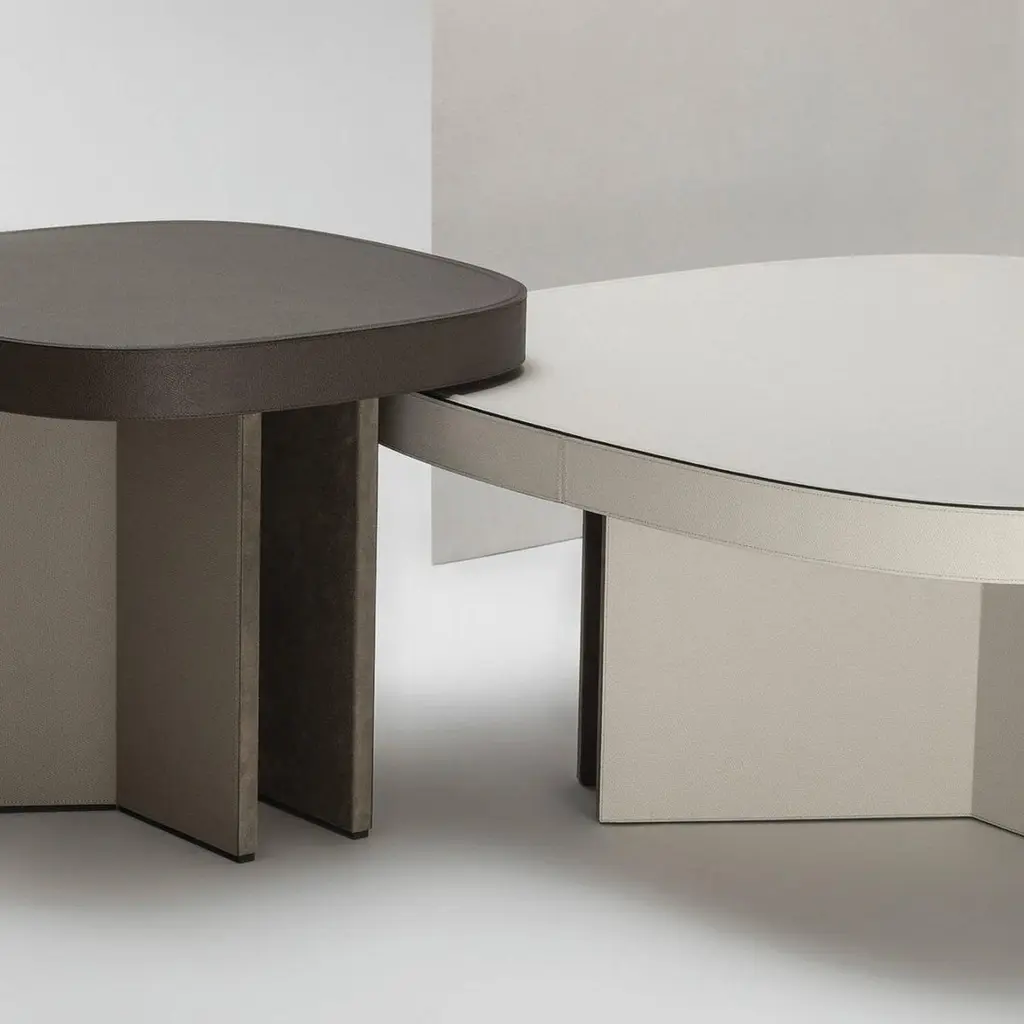 Set of 2 contemporary leather coffee tables - bivio by Stephane Parmentier for Giobagnara.Bivio (meaning “junction” in Italian) collection is characterized by an architectural base made of three folded wooden slabs lined in suede and leather. Combined with tops of various shapes, these elements possess a restrained beauty as well as a strong presence that reminds the futuristic shapes of Villa Girasole, an icon of the 20th century Italian architecture.Design: Stéphane ParmentierMaterial: Golf, suede or nappa leather, fully leather covered.Dimensions:Small: cm 50.5 x 50.5 h. cm 40Large: cm 90 x 90 h. cm 34Made by hand, in Italy.These items are made to order. Please choose the finish that you want for your pieces.