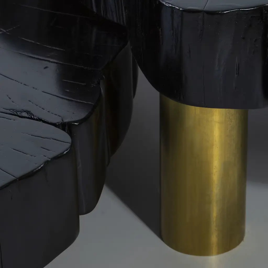 A naturally treated rustic silhouette creates a piece that stands out for its unique simplicity. Obtained from an authentic part of a century-old cypress tree, this pair of coffee tables naturally sports precise details and fissures enhanced by applying black lacquer on the sides. Finally, it is the natural brass feet that give the ultimate touch of classic and exceptional elegance to this piece of furniture