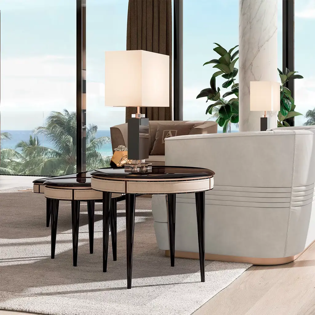 Retro-chic allure and superb craftsmanship make these three coffee tables a stunning addition to both classic and modern interiors, where they can be combined together or placed around a living room to create a cohesive look. Their wooden legs and top have a striking ebony veneer with a glossy finish, complementing the side inserts in beige leather and the brass-finished metal details. Zoe is d70 x H60, Chloe is d70 x H38, Jade is d50 x H50 cm. Other finishes are available, please ask the Concierge for details.