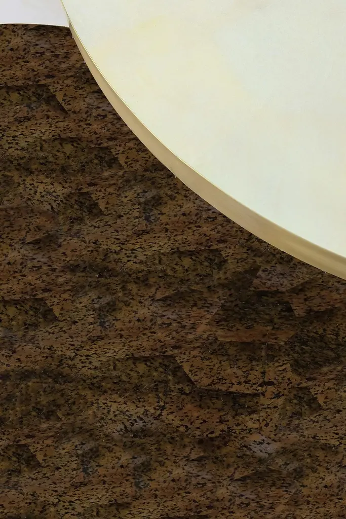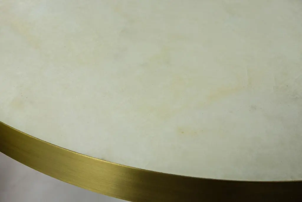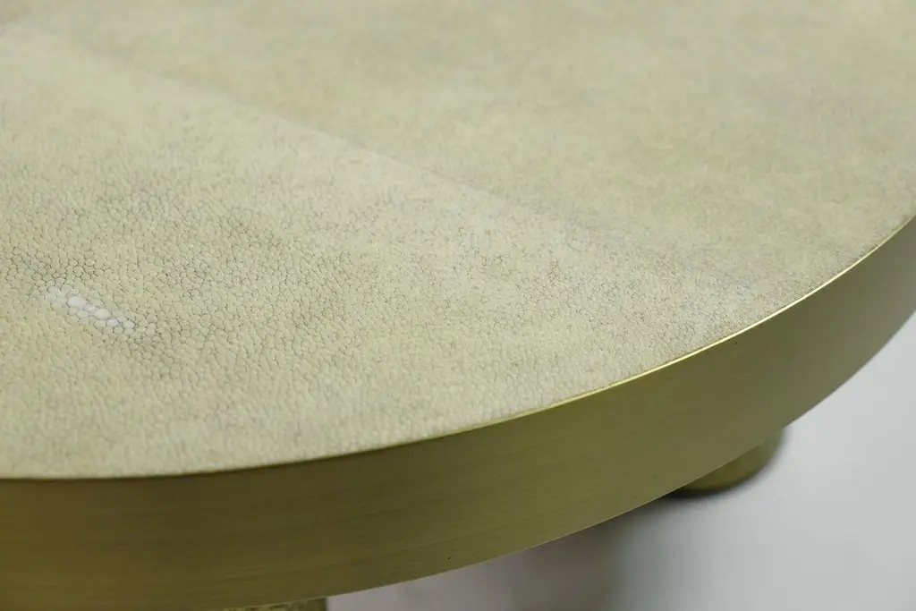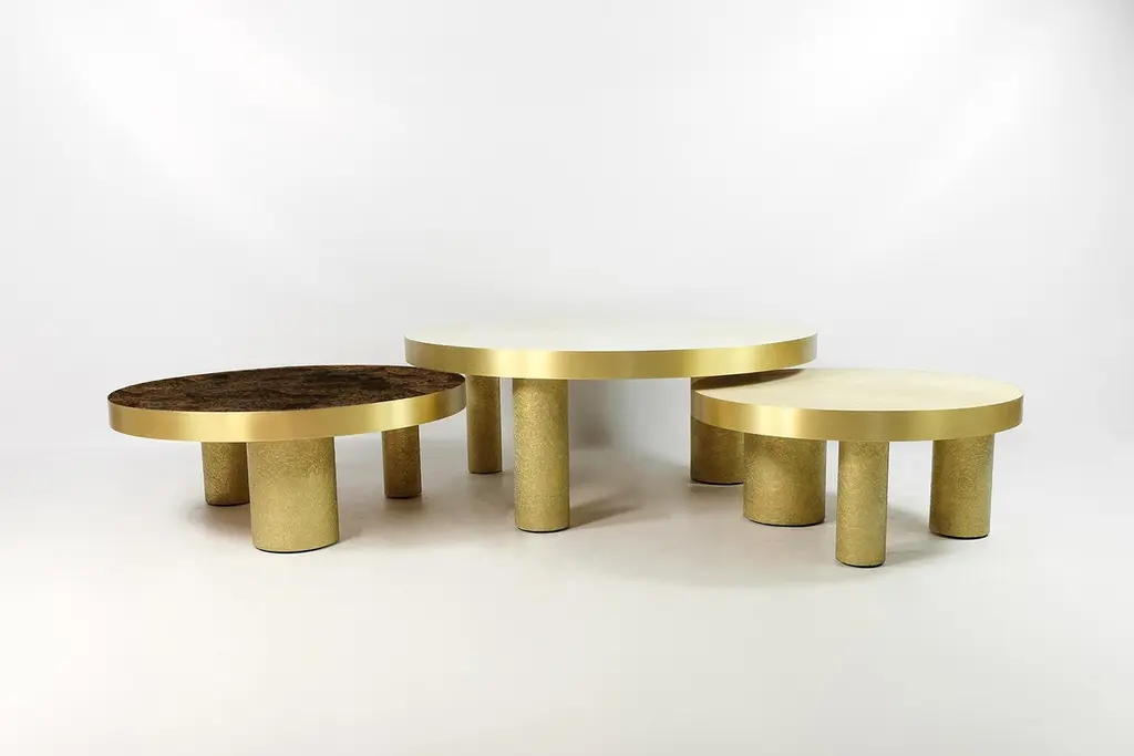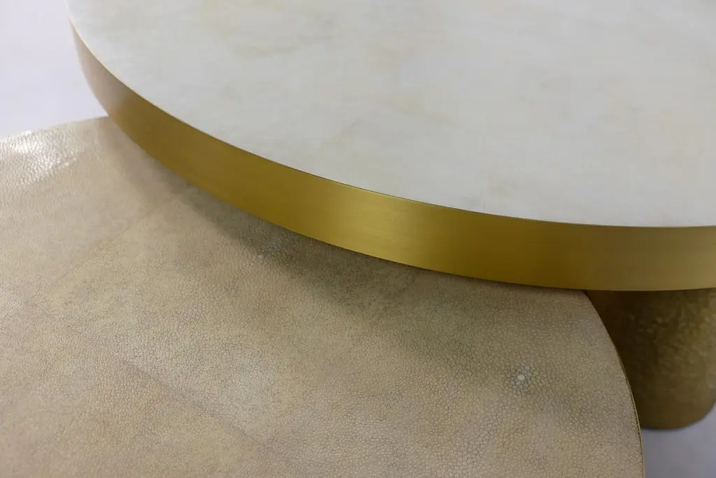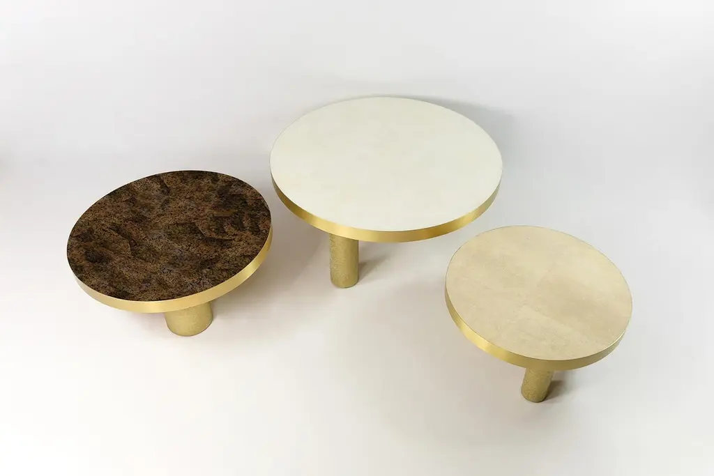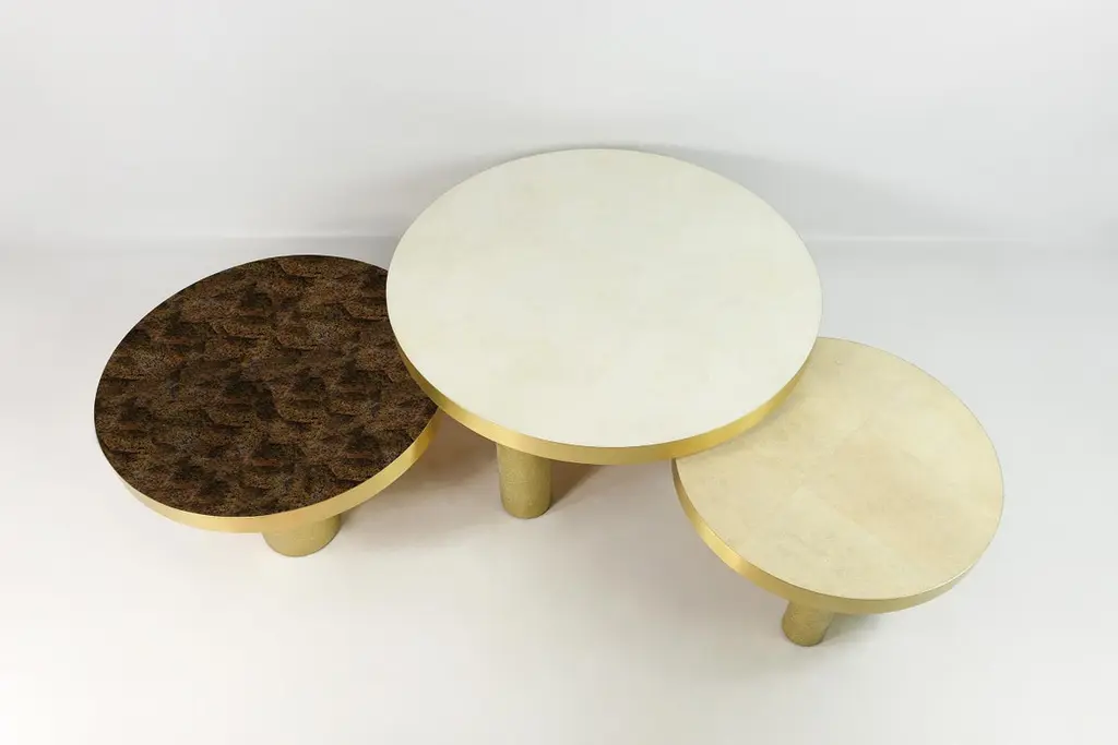 This set of 3 round coffee tables is made of various inlaid materials.These modular tables can be setted up following your wishes.The center piece is covered with a polished white rock crystal marquetry, the side tables are inlaid with natural shagreen and polished golden stone marquetry.These 3 tables have a brushed brass edge and they are mounted on gilded textured tubular feet.The dimensions of each table is: Diameter 35.4" x height 13.77" (diameter 90 x height 35cm)Diameter 27.55" x height 10.6" (Diameter 70 x height 27cm)Diameter 23.6" x 10.6" (Diameter 60 x height 27cm)We can customize the dimensions and finishes of these tables. Care instructions:Keep the materials dry and protected from direct sunlight and heat surfacesTo clean, simply wipe with a dry clean clothDo not use any cleaning agent on the surface.