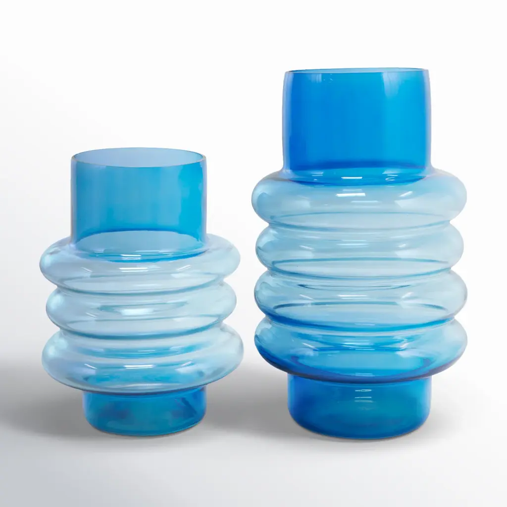 Stack 880 by Niccolò Devetag is a collection of colorful blown glass coffee tables featuring a modular design. The three blue glass elements can be stacked to form tables of varying heights and arrangements, allowing for versatile customization. The design emphasizes the interplay of light and color, producing captivating reflections and enhancing any interior space. The durability and endless recyclability of the glass combine tradition and modern aesthetic in a flexible, contemporary piece.