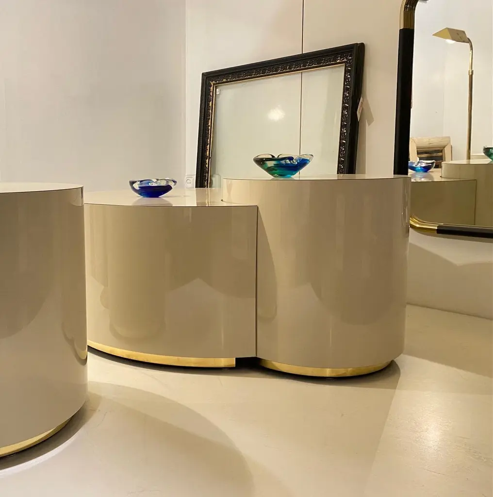 Luna High Gloss Laminate Collection - Coffee table / Side Tables / Auxiliary TablesLuna Table Set in High Gloss Laminate is a stunning collection of moon-inspired tables, meticulously handcrafted in Spain from your choice of satin brass or stainless steel. These tables are a delightful addition to your home or commercial space, whether arranged as central coffee tables or scattered as matching side tables, they infuse a touch of retro sophistication into any room.Customization options:Configuration: tailor your set to your preference, whether you desire two tables, or more, we can create any configuration to suit your spaceMaterial: premiun high-gloss laminateShape: full moon or waning crescent Size: standard size or specify your desired dimensionsAdvanced customization options for an extra cost: Materials: You can choose natural oak or walnut wood veneers, or opt to fully cover the table with a sheet of satin brass or stainless steelMarquetry: Incorporates an elegant brass or stainless steel marquetry design on the tabletopPlinth: You can add a plinth for a special design touchMetalwork: Choose between natural brass trim, or finished with a patina in aged brass or blackened gunmetalWonderful for home interiors, living room areas - as well as commercial settings: cafes, hotel lobbies, beauty salons.