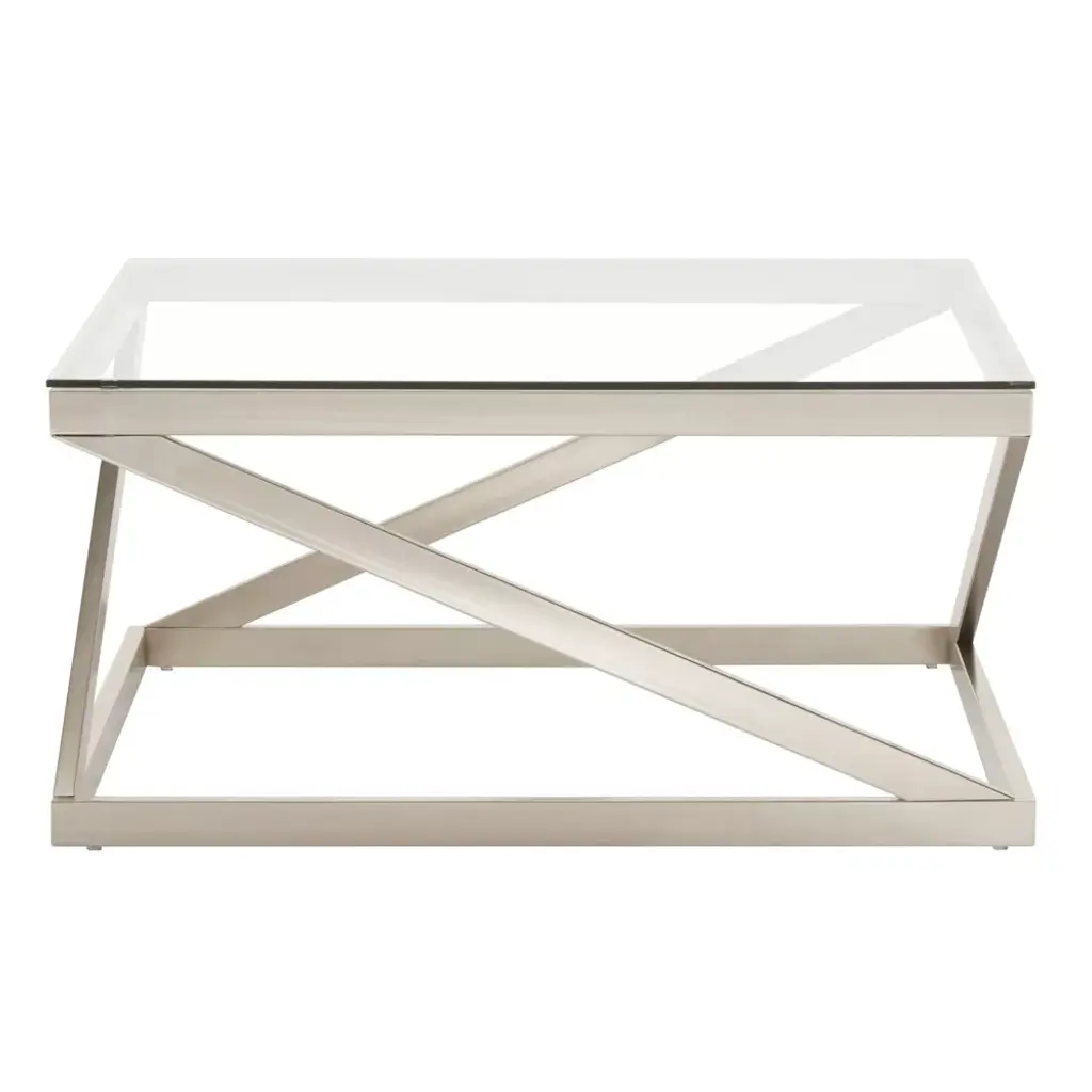 The perfect addition to a modern themed living space, the brushed nickel coffee table displays some serious unique style. A clear glass table top makes for the perfect surface to display home goods and decor. A brushed nickel x-cross table base provides stability and sleek design detail that's sure to stand out in any room in your home.