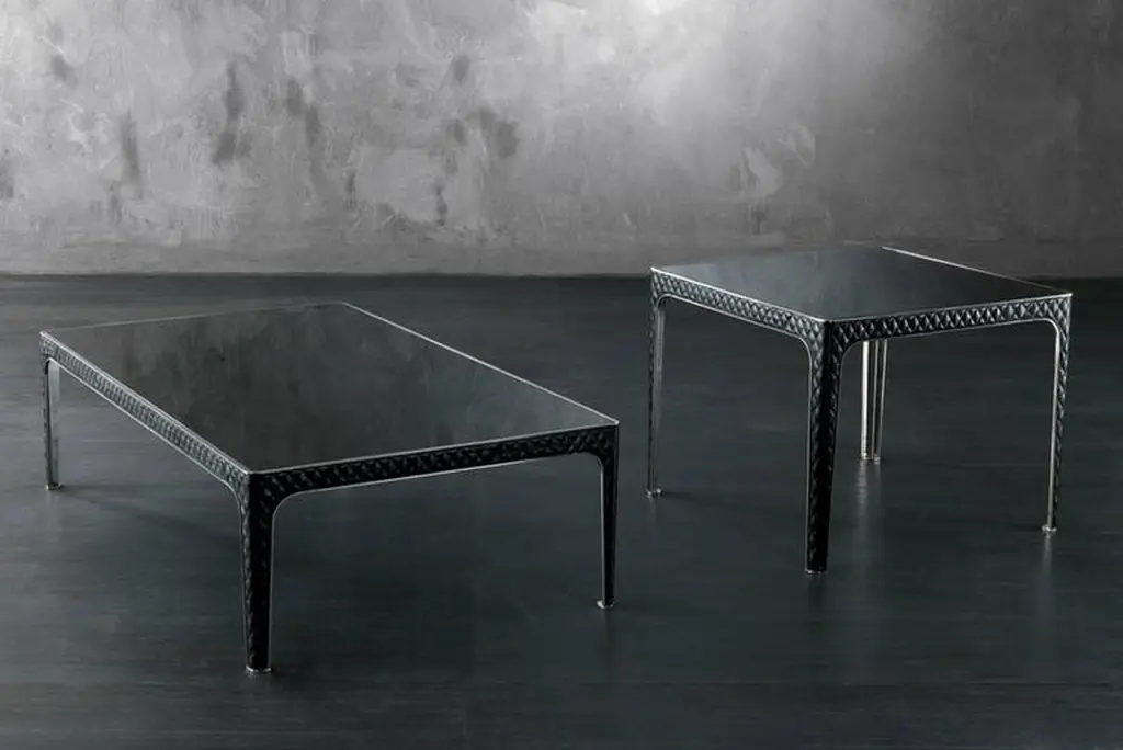 Coffee table with structure in polished stainless steelwith black glass top. Legs covered with capitonated black genuine leather (Cat C).Available in:L90,9xD90,9xH38,8cm, price: 7900,00€.L130,9xD130,9xH38,8cm, price: 9500,00€.Also available with top covered with leather,bronze structure, on request.