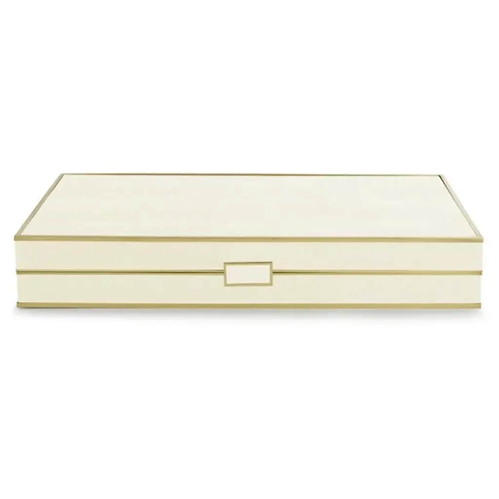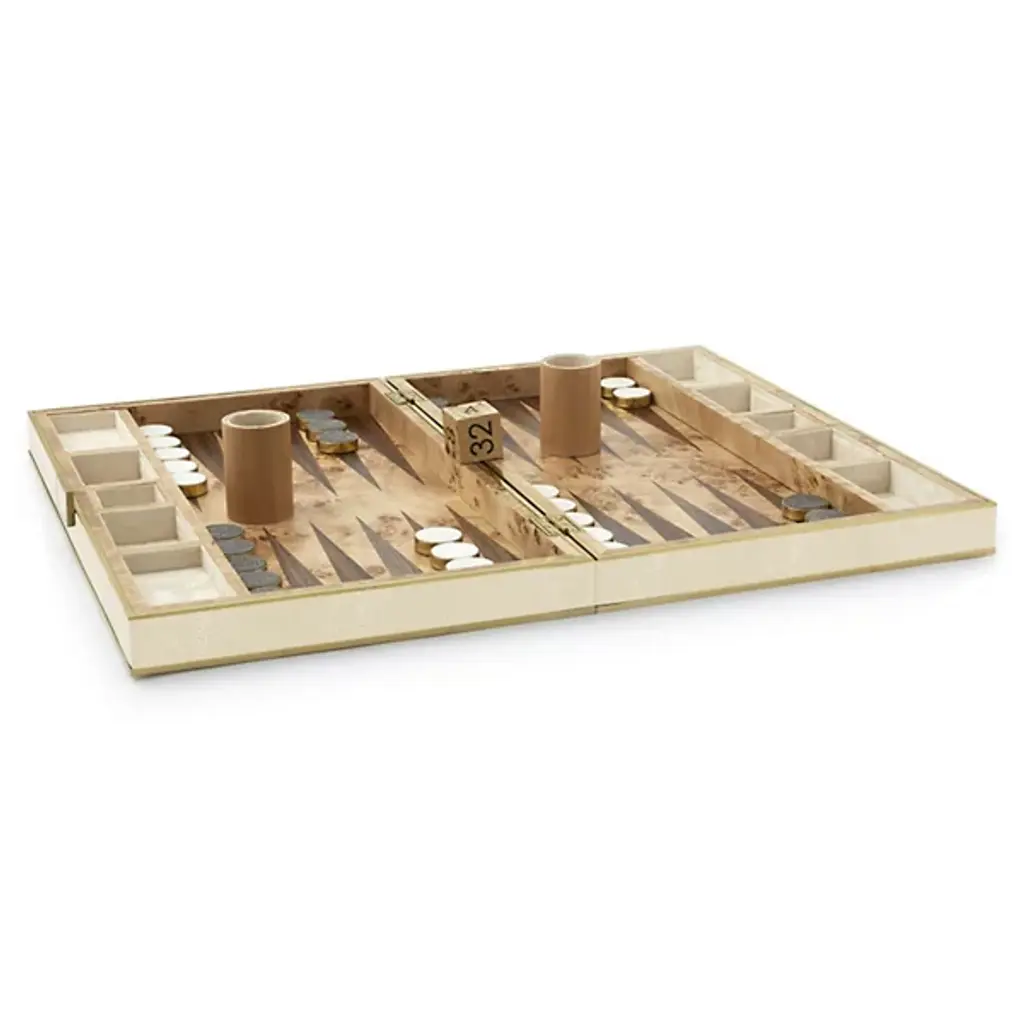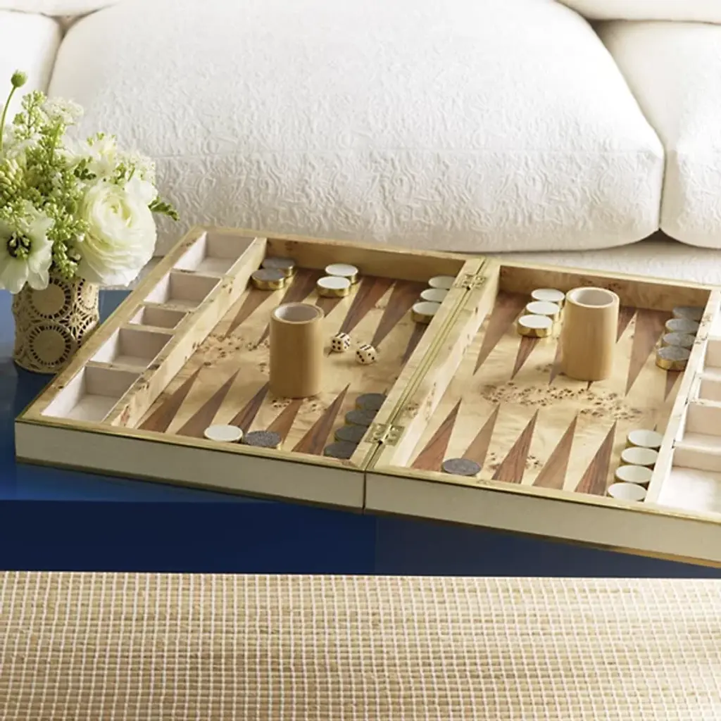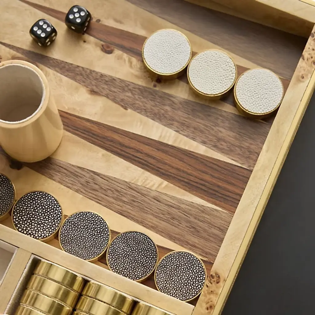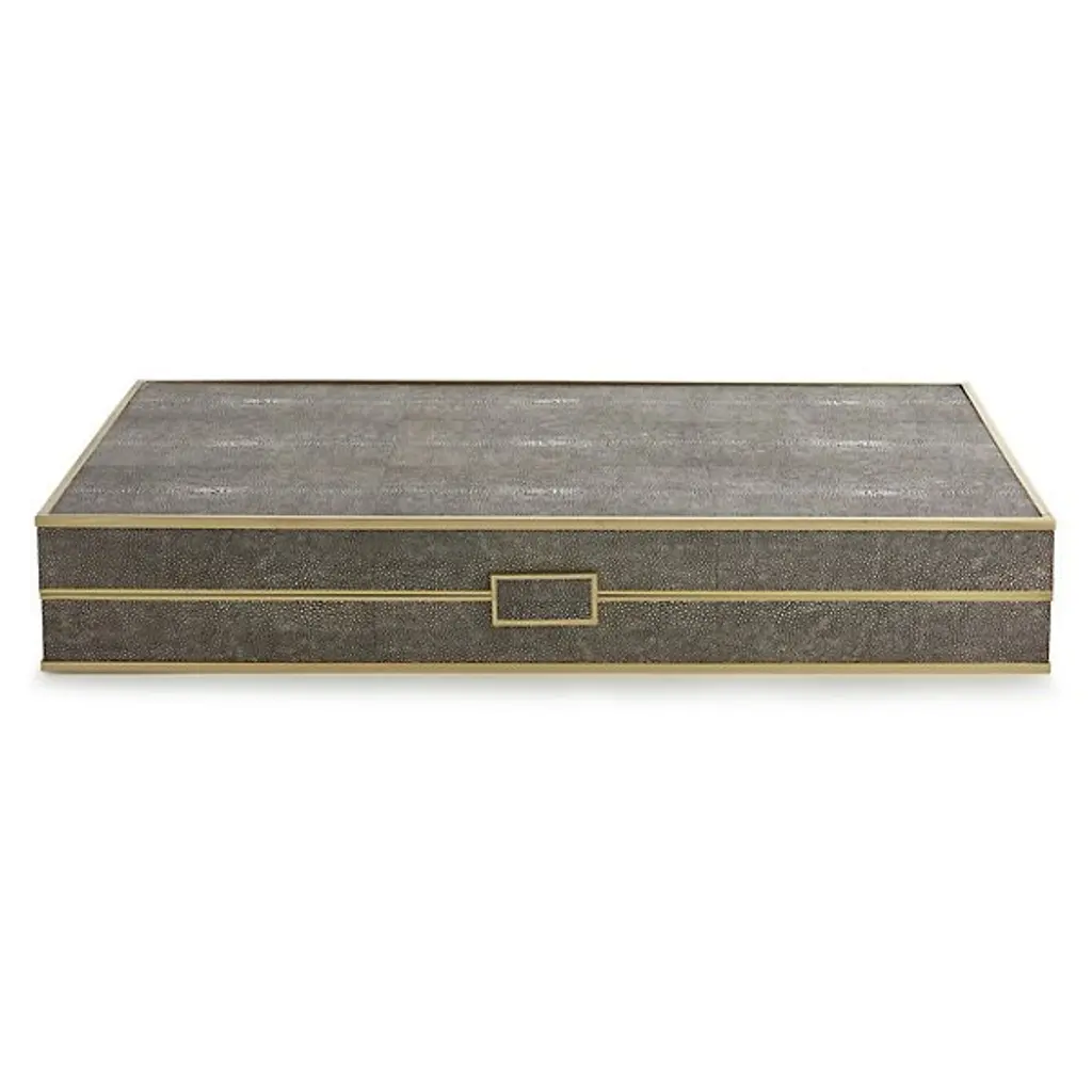 The Shagreen Backgammon Set with Dice from AERIN brings this ancient strategy game into modern homes with luxurious embossed shagreen construction that feels rich and substantial. The traditional backgammon board layout provides the familiar triangular point pattern that serious players expect, while the premium materials elevate the entire gaming experience. This set includes all necessary playing pieces and dice stored within the case, making it ready for immediate play. When closed, the case becomes an attractive decorative object that enhances any bookshelf, coffee table, or game room display.