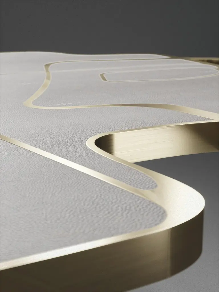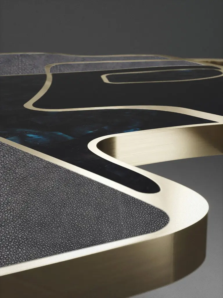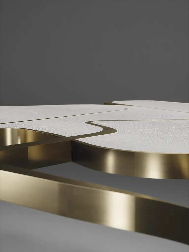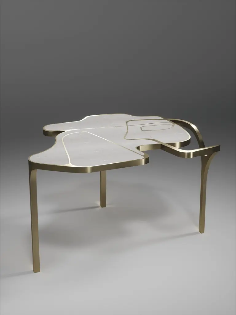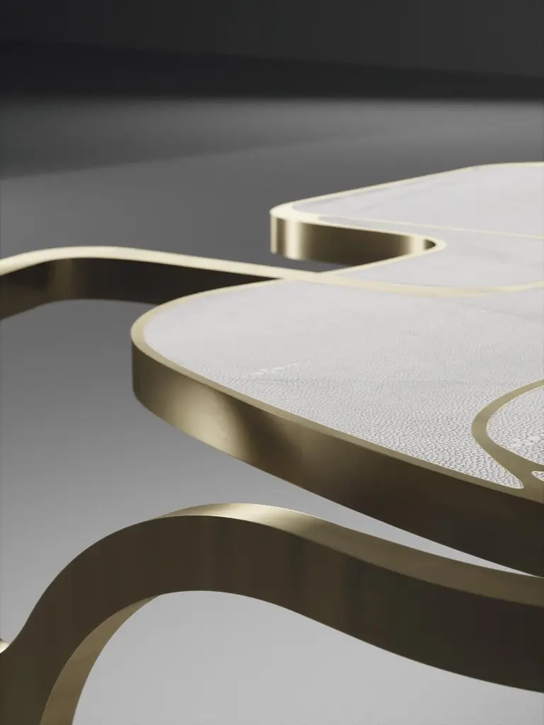 The Paris based label has distinguished themselves since their launch, with their iconic use of shagreen mixed with brass and other exotic materials. All furniture is handcrafted by skilled artisans, ultimately making each piece unique, designed in Paris and produced in the Philippines.The Cocteau coffee table by R&Y Augousti is a truly one of a kind piece. The sculptural and ethereal piece has abstract forms, shapes and figures within it that one could interpret in different ways. The bronze-patina brass inserts in the cream shagreen inlaid surface "melt" organically into the floating frame and base to create this overall beautiful amorphous shape. The finish of the shagreen is authentic as it is hand-dyed by our artisans. The dimensions of this piece are 69.2 x 62.8 x 40 cmAll R&Y Augousti pieces are handmade by artisans, ultimately making each piece unique. Wipe clean with soft dry cloth.Acclaimed design duo Ria & Yiouri Augousti have established themselves since the 1990s as pioneers of modern-vintage style through their luxurious Art Deco inspired collections.The Paris based label has distinguished themselves since their launch, with their iconic use of shagreen mixed with brass and other exotic materials. All furniture is handcrafted by skilled artisans, ultimately making each piece unique. All shagreen-covered items should be kept out of direct sunlight, color variants may occur on the stingray and other exotic finishes, but this showcases the Parisian label's commitment to creating authentic luxurious products using natural components.