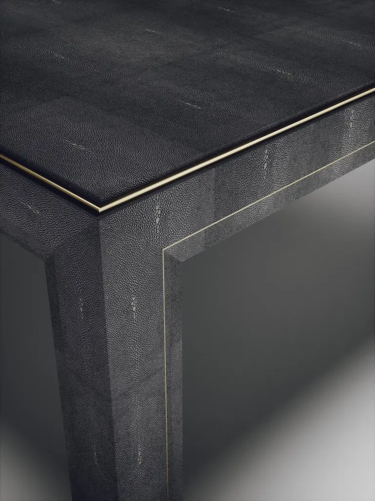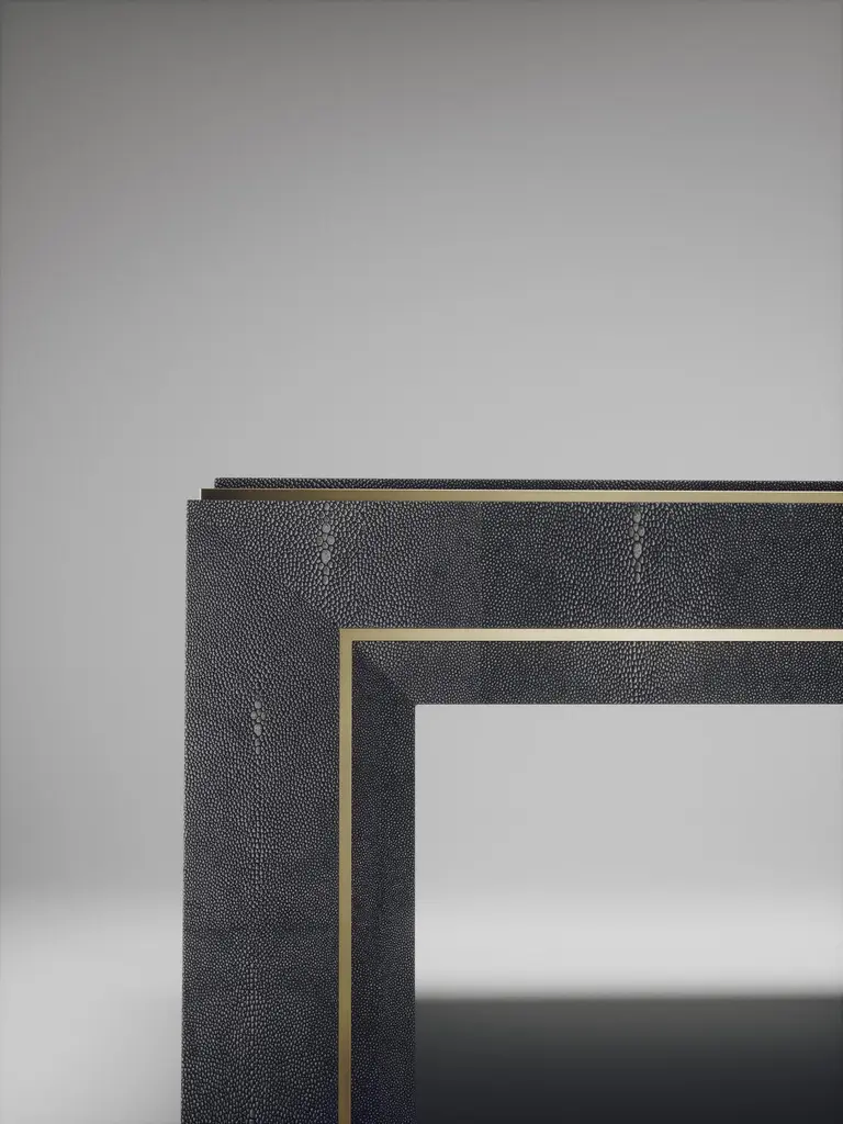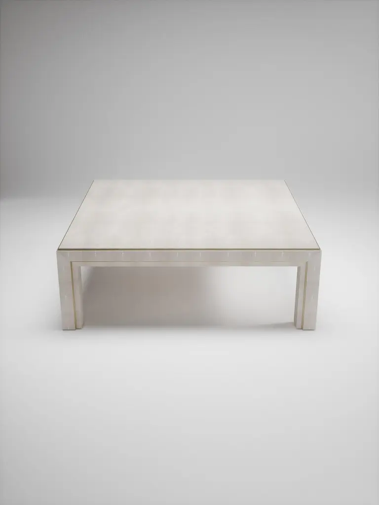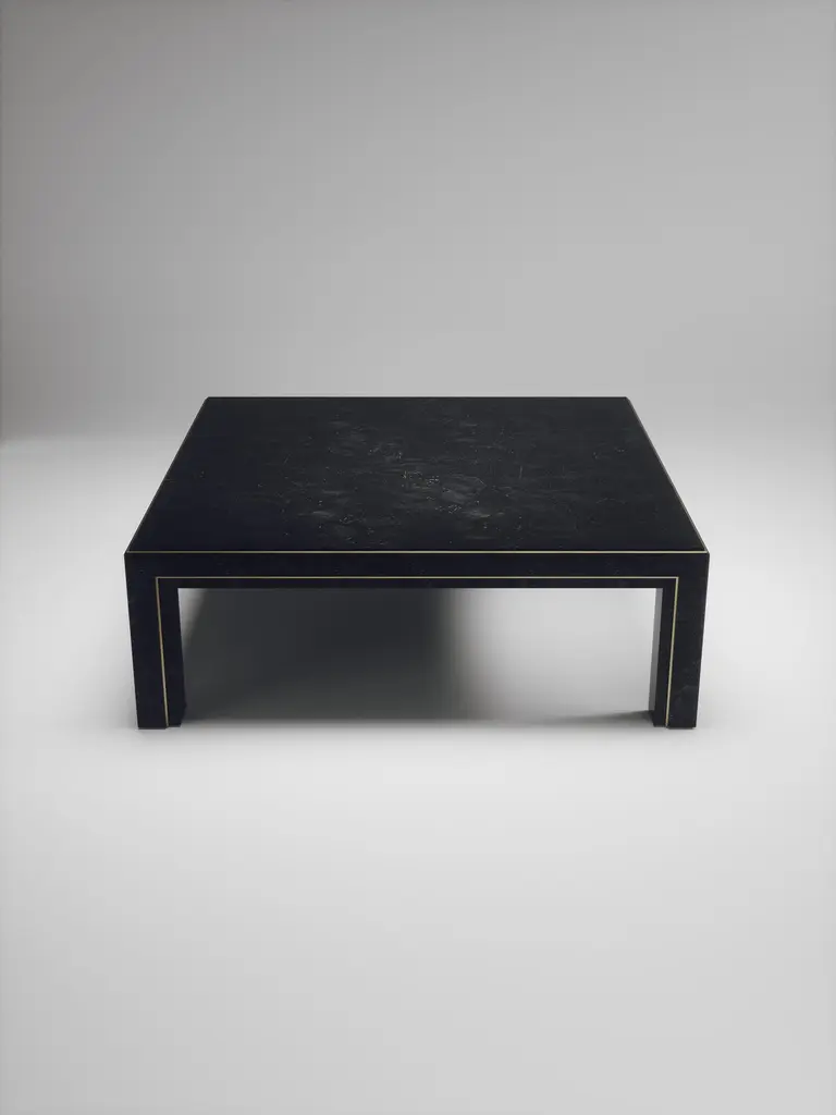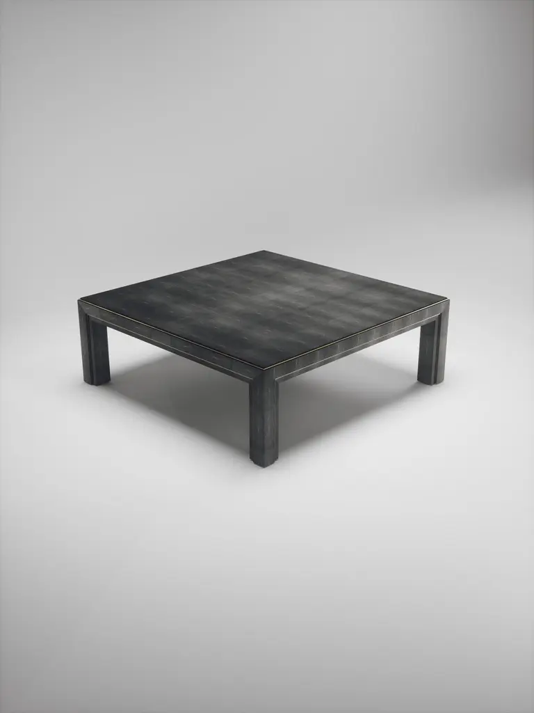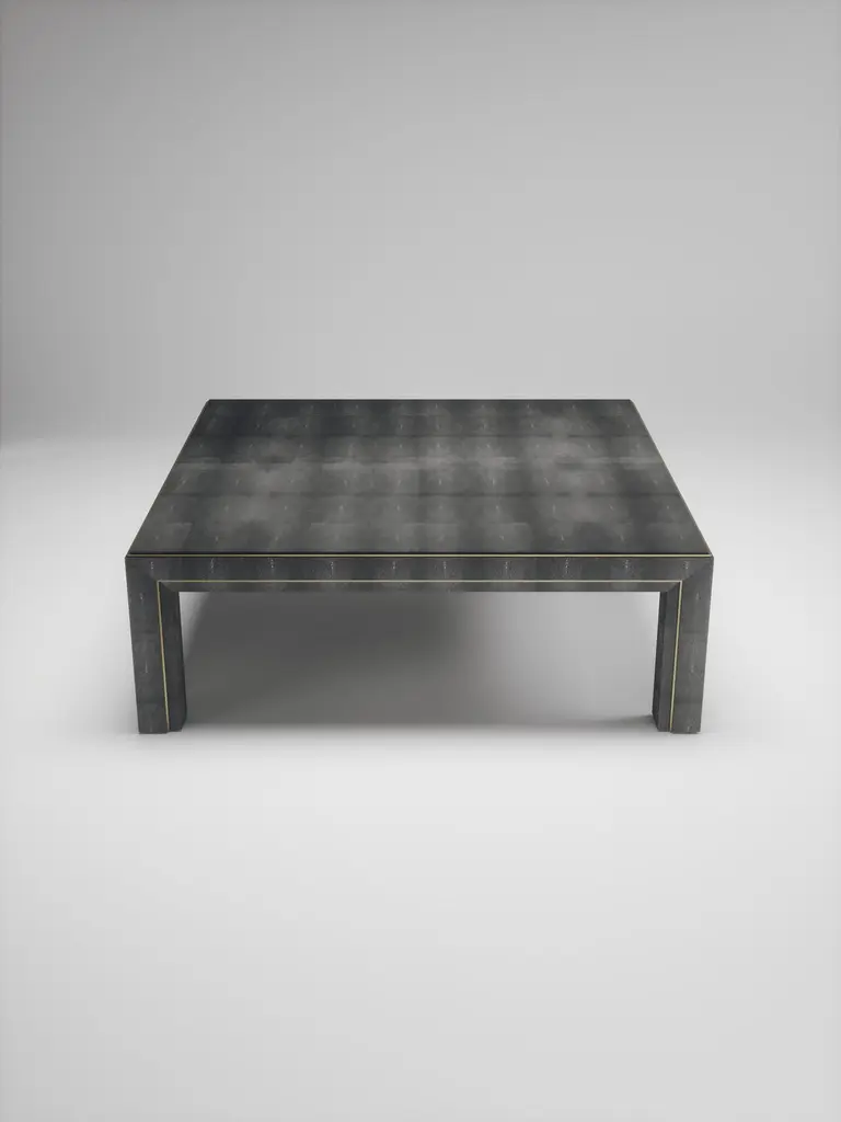 The Paris based label has distinguished themselves since their launch, with their iconic use of shagreen mixed with brass and other exotic materials. All furniture is handcrafted by skilled artisans, ultimately making each piece unique, designed in Paris and produced in the Philippines.The Paris based label has distinguished themselves since their launch, with their iconic use of shagreen mixed with brass and other exotic materials. All furniture is handcrafted by skilled artisans, ultimately making each piece unique, designed in Paris and produced in the Philippines.The parsons coffee table by R&Y Augousti is classic and elegant staple piece for your home. The clean lines of the overall piece, inlaid in coal black shagreen, are accentuated by the discreet bronze-patina brass indentation detail giving it a luxurious pop. This piece is truly versatile, available in other finishes, see images at end of slide. Custom finishing/sizing available on request. The finish of the shagreen is authentic as it is hand-dyed by our artisans. The dimensions of this piece are 47.25" x 47.25" x 16"All R&Y Augousti pieces are handmade by artisans, ultimately making each piece unique. Wipe clean with soft dry cloth.Acclaimed design duo Ria & Yiouri Augousti have established themselves since the 1990s as pioneers of modern-vintage style through their luxurious Art Deco inspired collections.The Paris based label has distinguished themselves since their launch, with their iconic use of shagreen mixed with brass and other exotic materials. All furniture is handcrafted by skilled artisans, ultimately making each piece unique. All shagreen-covered items should be kept out of direct sunlight, color variants may occur on the stingray and other exotic finishes, but this showcases the Parisian label's commitment to creating authentic luxurious products using natural components.