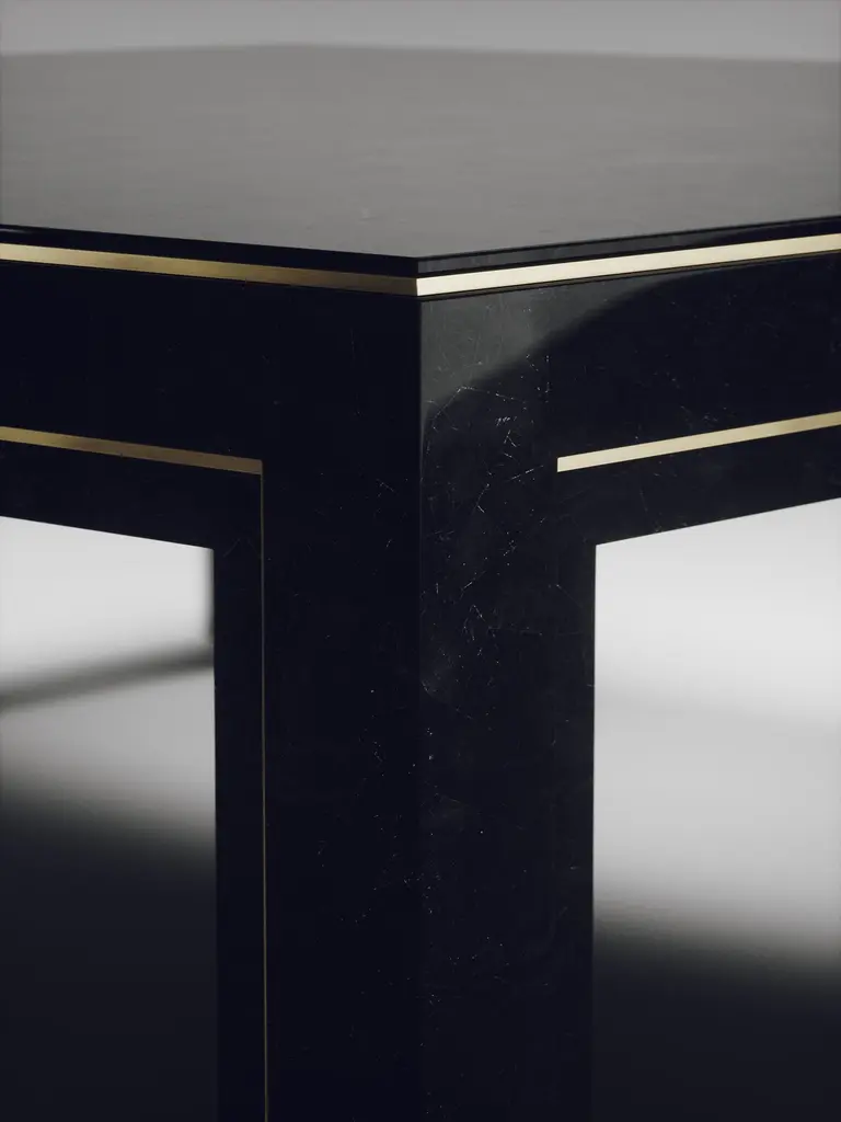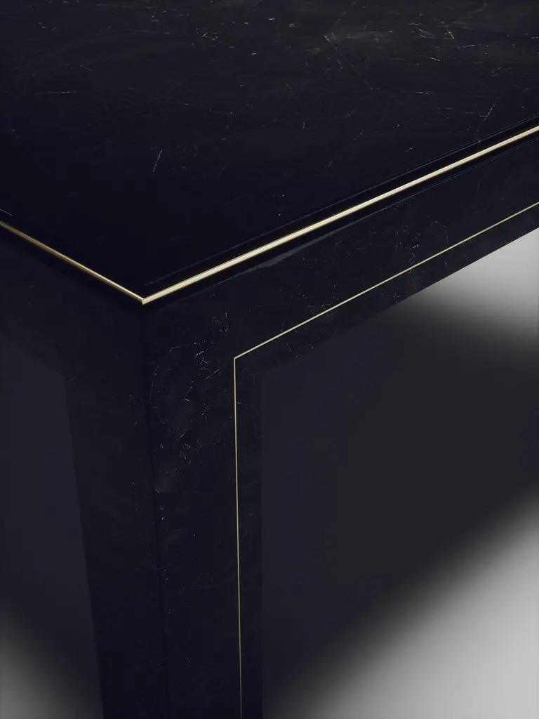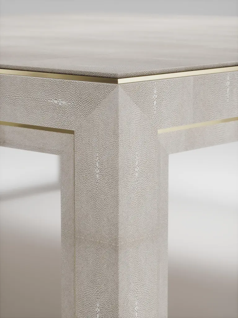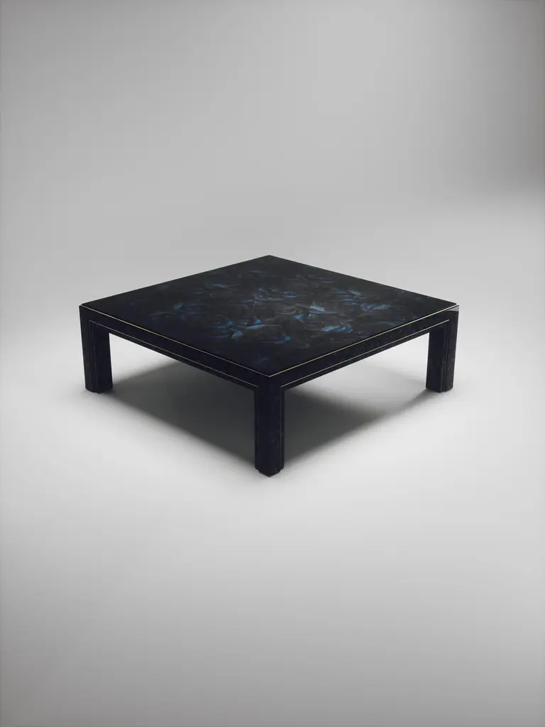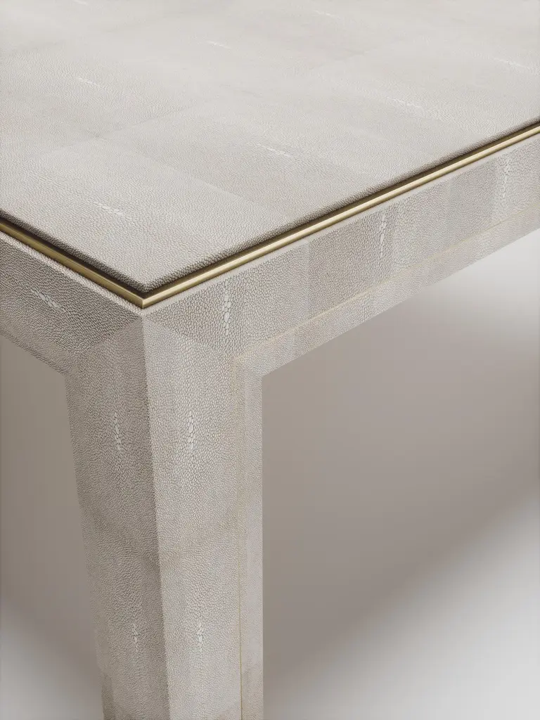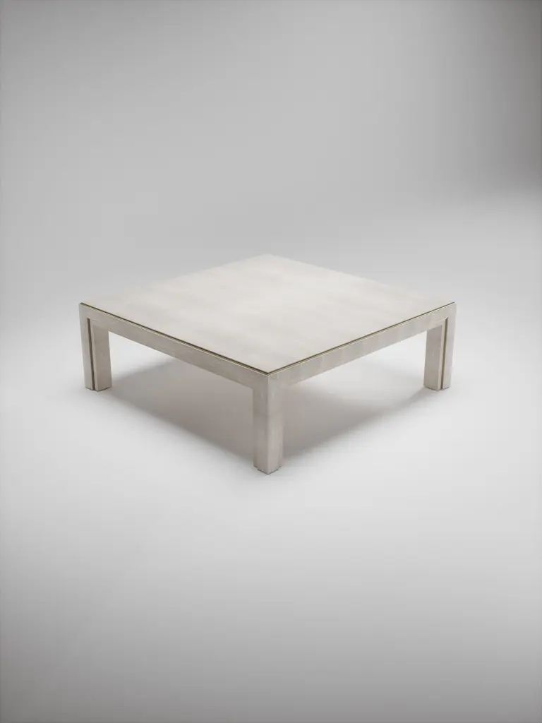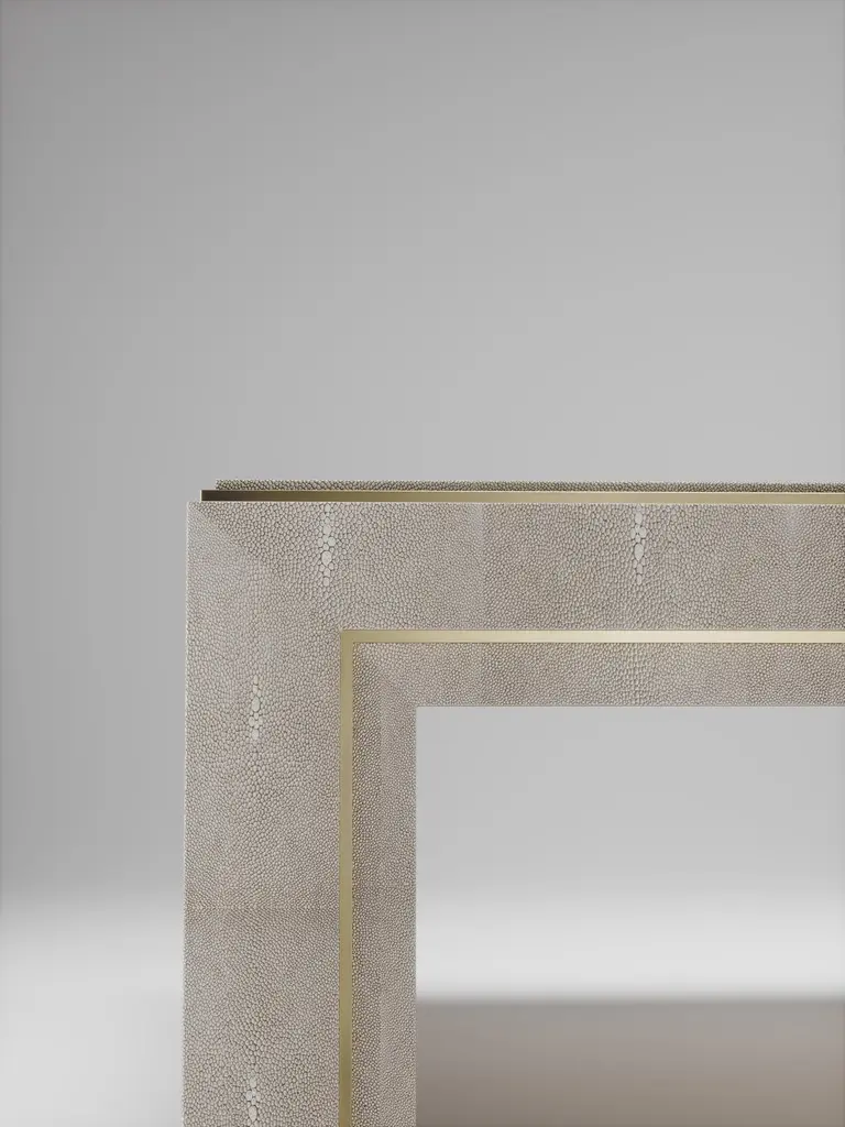 The Paris based label has distinguished themselves since their launch, with their iconic use of shagreen mixed with brass and other exotic materials. All furniture is handcrafted by skilled artisans, ultimately making each piece unique, designed in Paris and produced in the Philippines.The Paris based label has distinguished themselves since their launch, with their iconic use of shagreen mixed with brass and other exotic materials. All furniture is handcrafted by skilled artisans, ultimately making each piece unique, designed in Paris and produced in the Philippines.The parsons coffee table by R&Y Augousti is classic and elegant staple piece for your home. The clean lines of the overall piece, inlaid in coal black shagreen, are accentuated by the discreet bronze-patina brass indentation detail giving it a luxurious pop. This piece is truly versatile, available in other finishes, see images at end of slide. Custom finishing/sizing available on request. The finish of the shagreen is authentic as it is hand-dyed by our artisans. The dimensions of this piece are 47.25" x 47.25" x 16"All R&Y Augousti pieces are handmade by artisans, ultimately making each piece unique. Wipe clean with soft dry cloth.Acclaimed design duo Ria & Yiouri Augousti have established themselves since the 1990s as pioneers of modern-vintage style through their luxurious Art Deco inspired collections.The Paris based label has distinguished themselves since their launch, with their iconic use of shagreen mixed with brass and other exotic materials. All furniture is handcrafted by skilled artisans, ultimately making each piece unique. All shagreen-covered items should be kept out of direct sunlight, color variants may occur on the stingray and other exotic finishes, but this showcases the Parisian label's commitment to creating authentic luxurious products using natural components.
