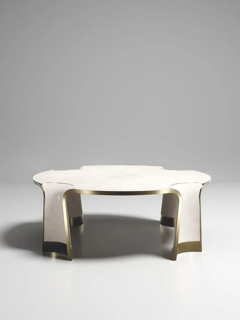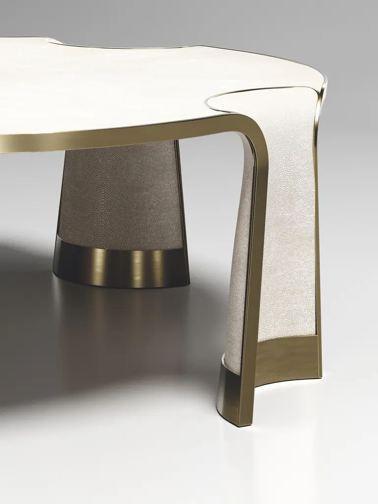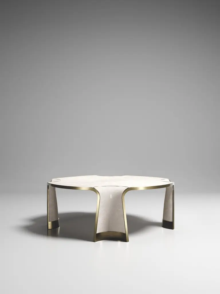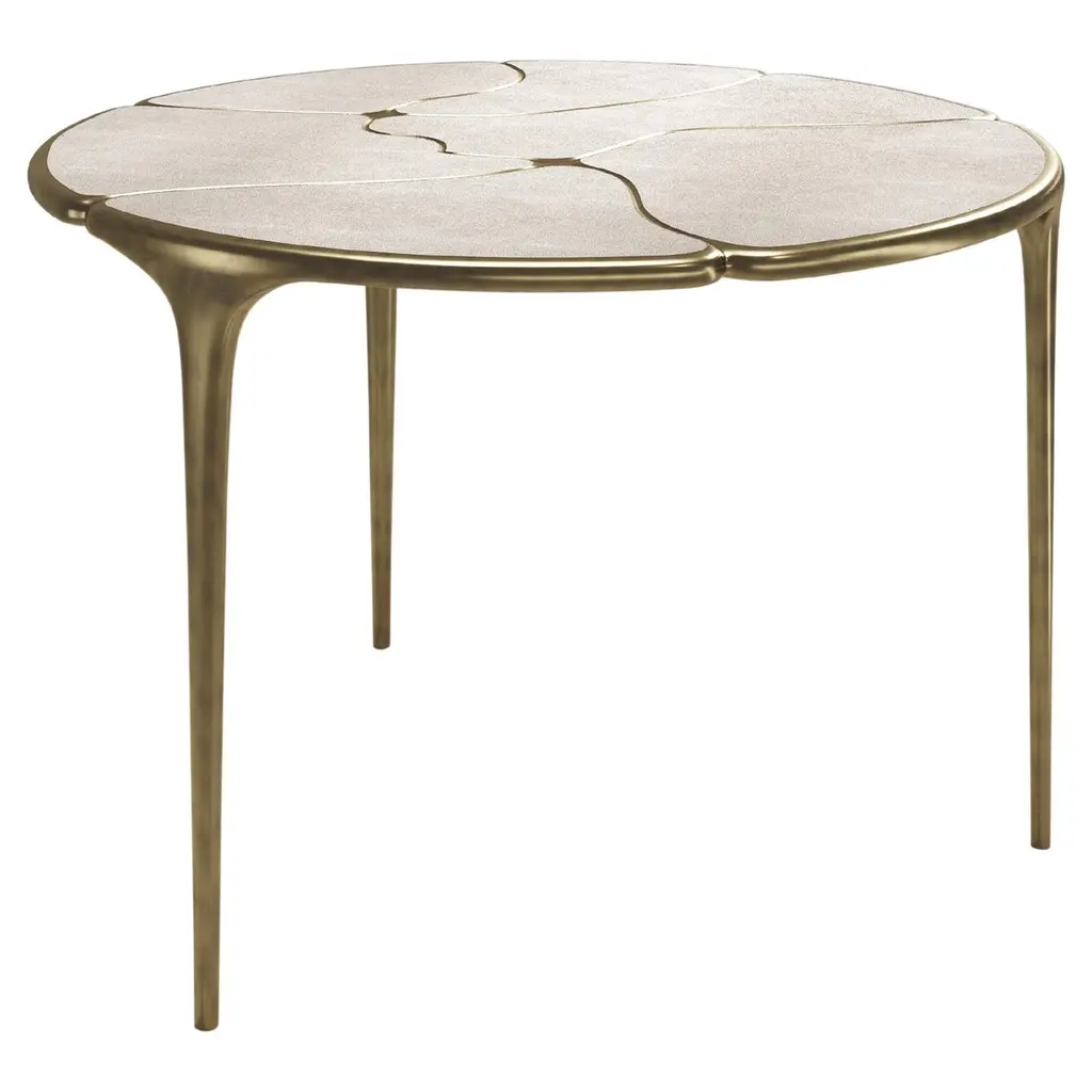 The Paris based label has distinguished themselves since their launch, with their iconic use of shagreen mixed with brass and other exotic materials. All furniture is handcrafted by skilled artisans, ultimately making each piece unique, designed in Paris and produced in the Philippines.The Nymphea round coffee by R & Y Augousti in shagreen with bronze-patina brass details explores the brand's iconic DNA of bringing old world artisanal craft into a contemporary and utterly luxury feel. This table is done in a cream shagreen finish Available in other finishes. Part of the Augousti Nymphea capsule, see images of the collection at end of slide. Custom sizing/finishing on requestThe dimensions of this piece are:Measures: 111.2 diameter x 40 cmAll R & Y Augousti pieces are handmade by artisans, ultimately making each piece unique.Wipe clean with soft dry cloth.Acclaimed design duo Ria & Yiouri Augousti have established themselves since the 1990s as pioneers of modern-vintage style through their luxurious Art Deco inspired collections.The Paris based label has distinguished themselves since their launch, with their iconic use of shagreen mixed with brass and other exotic materials. All furniture is handcrafted by skilled artisans, ultimately making each piece unique. All shagreen-covered items should be kept out of direct sunlight, color variants may occur on the stingray and other exotic finishes, but this showcases the Parisian label's commitment to creating authentic luxurious products using natural components.