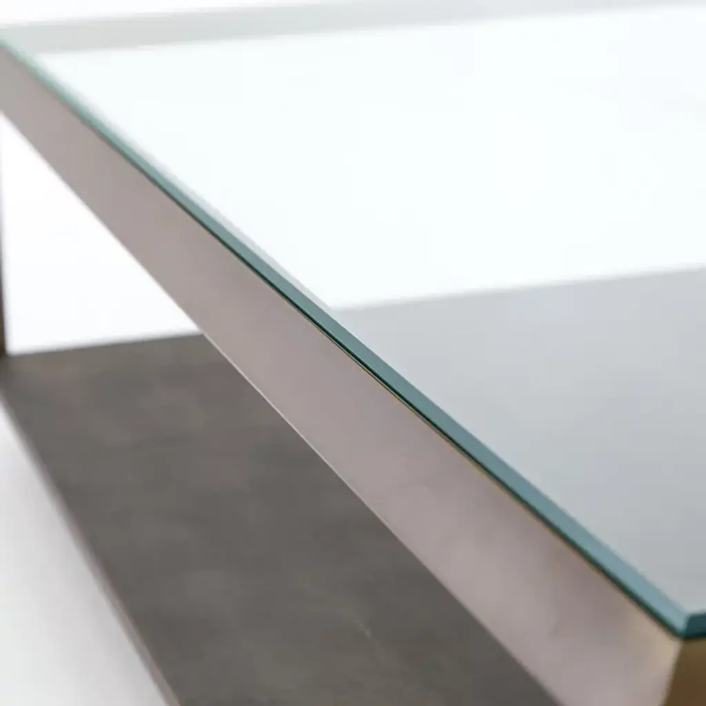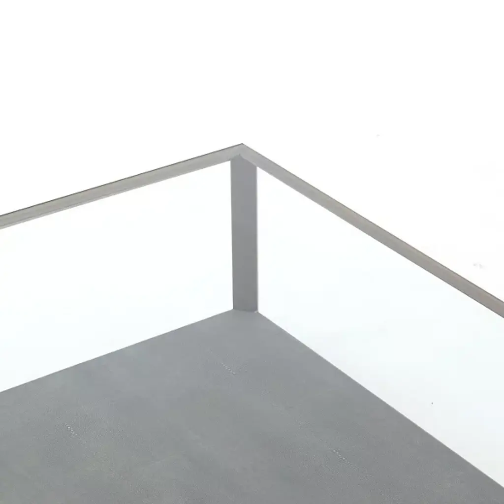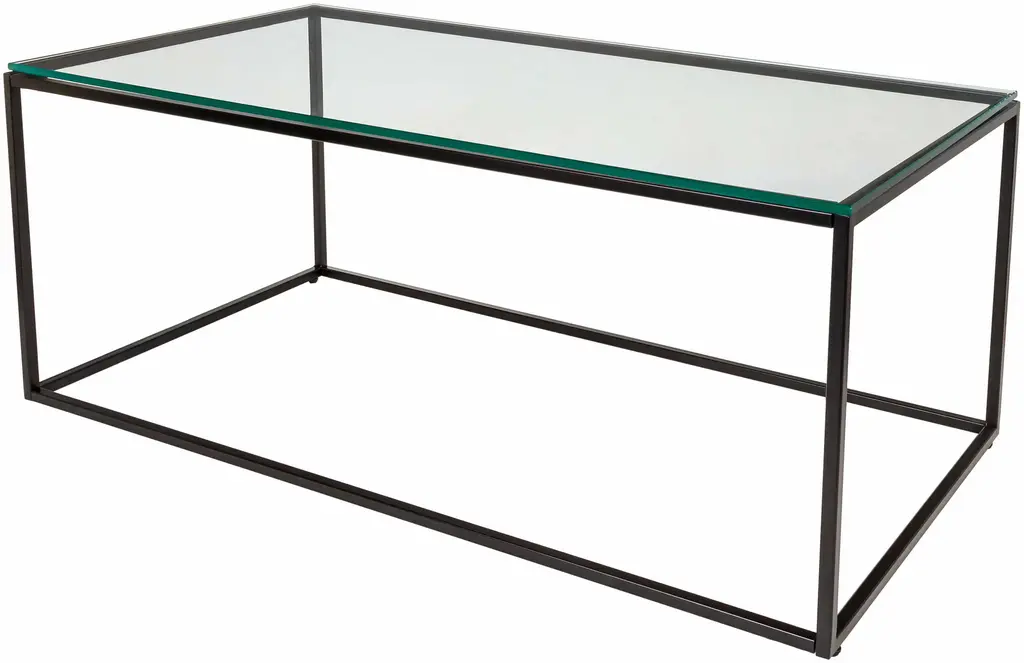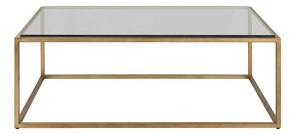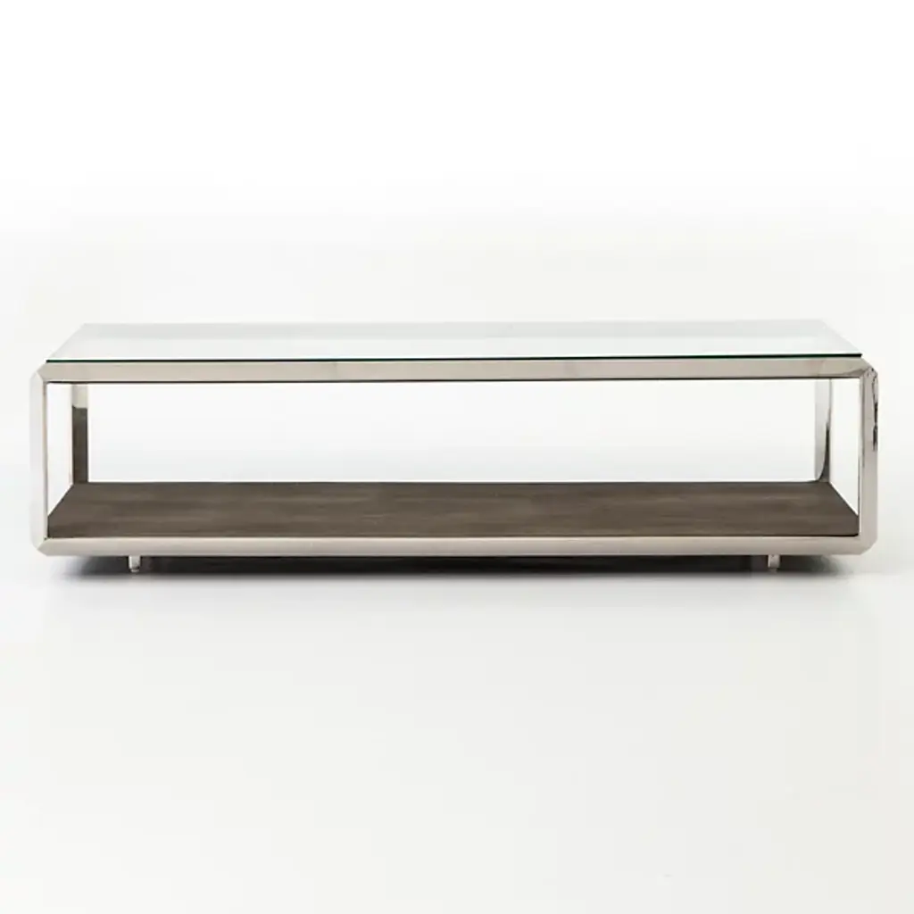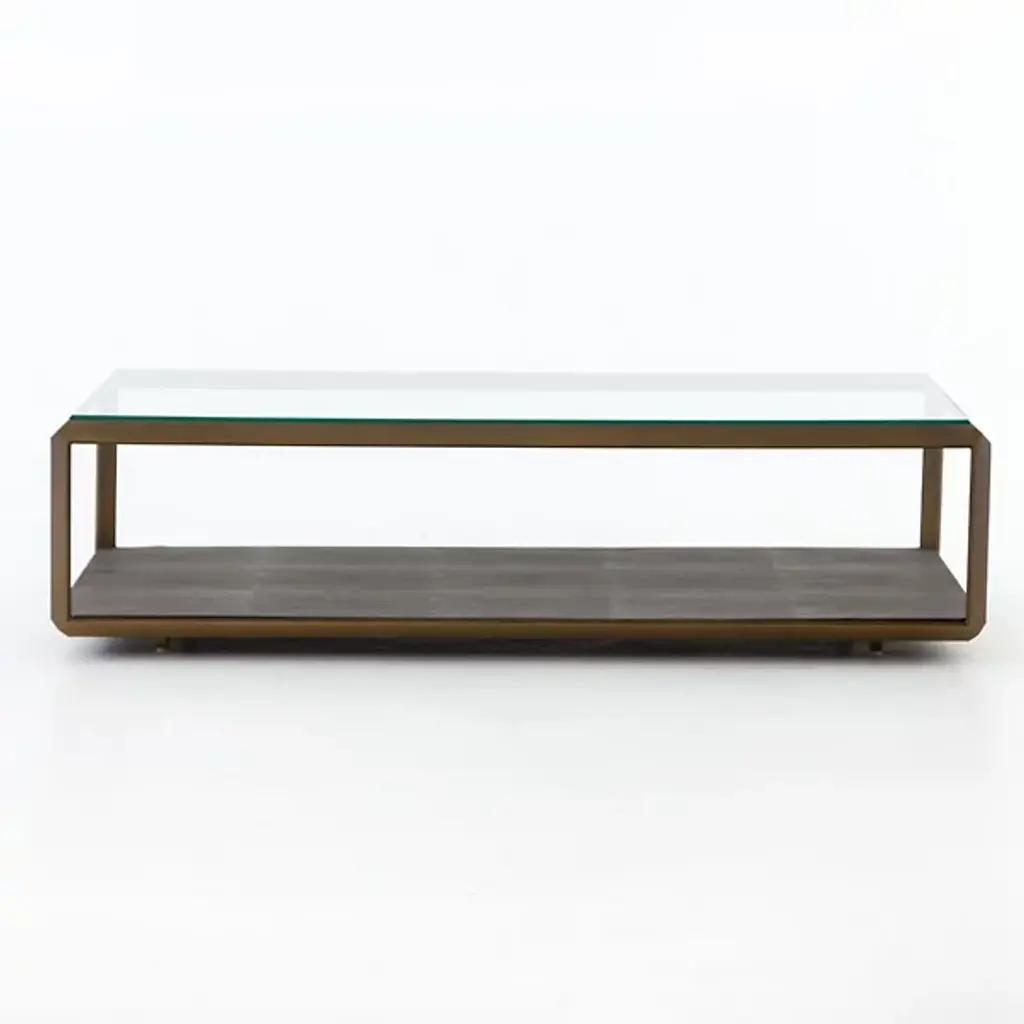 The Shagreen Shadow Box Coffee Table from Four Hands reinvents the traditional coffee table. Its chic design features a glass top supported by a metal frame, creating an airy appearance. The lower shelf offers additional storage or display space, enhancing functionality. The table's clean lines and unfussy aesthetic allow it to complement various interior styles. Its unique construction invites creative use of the space between the glass top and lower shelf, perfect for showcasing decorative objects or storing frequently used items within easy reach.