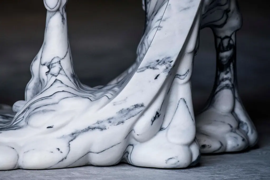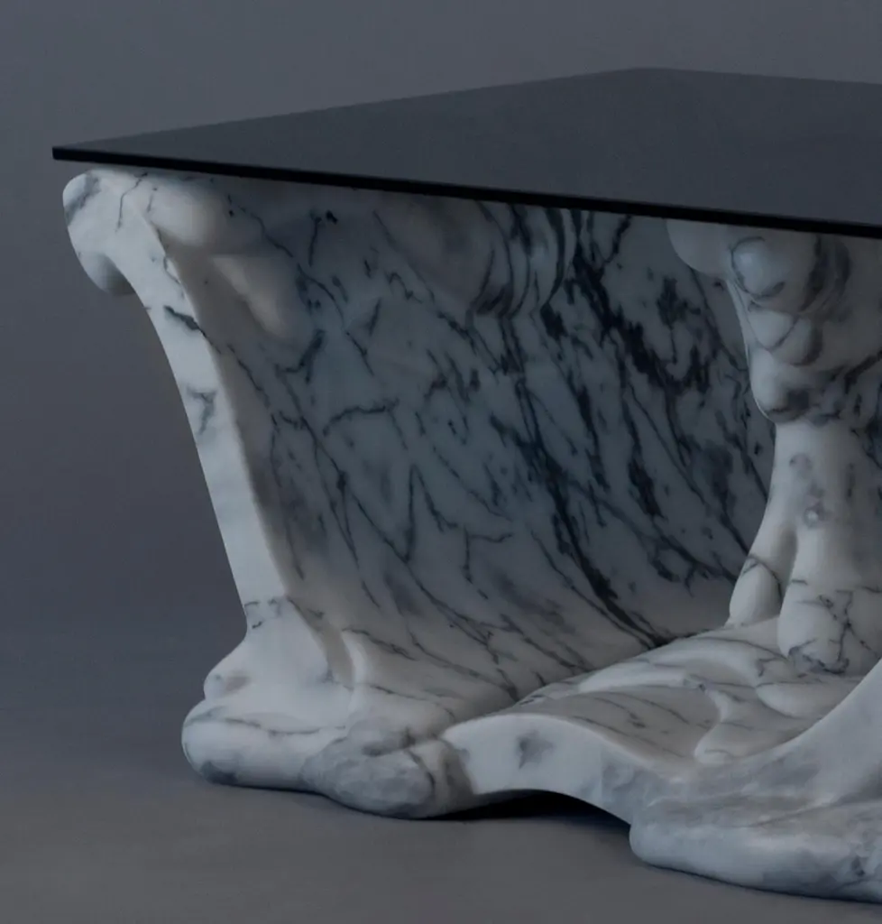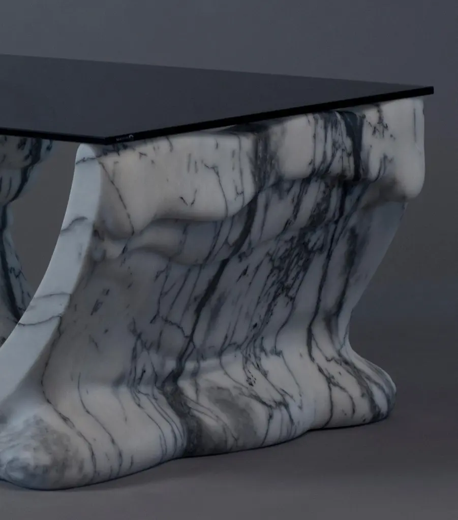 Shape Coffee Table in Marble & Tempered Glass by MANTA Handmade Stone DesignLimited Edition of 5 Pieces.Dimensions: D 60 x W 119 x H 42,5 cm. Materials: Pele de Tigre marble and tempered gray glass.Weight: 150 kg.MANTA is the design brand of Gargula Gótica, based in Portugal.Anchored in over 25 years of masterful craftsmanship, it combines the expertise of international stonemasons and sculptors with the vision of renowned designers and architects, which results in extraordinary art objects and distinctive pieces of furniture that transcend function.MANTA follows a consistently curated design philosophy - sensual, timeless, and deeply connected to the power of nature.Organic forms, curved lines, and an exceptional material aesthetic mergeinto sculptural, unique compositions that not only furnish a space but transform it, lending every room a subtle tension between refined sensuality and playful lightness.MANTA understands furniture as poetry made of stone, as silent protagonists in the interplay of light, structure, and emotion.Between sculpture and function, an aesthetic emerges that touches - subtle, elegant, and full of meaning.The collections have been presented at international exhibitions, design fairs, and galleries, and have received numerous awards for their sustainable choice of materials, precise craftsmanship, and the harmonious interplay of lightness, depth, and texture.MANTA - the power of natural processes, transformed into sculptural design.