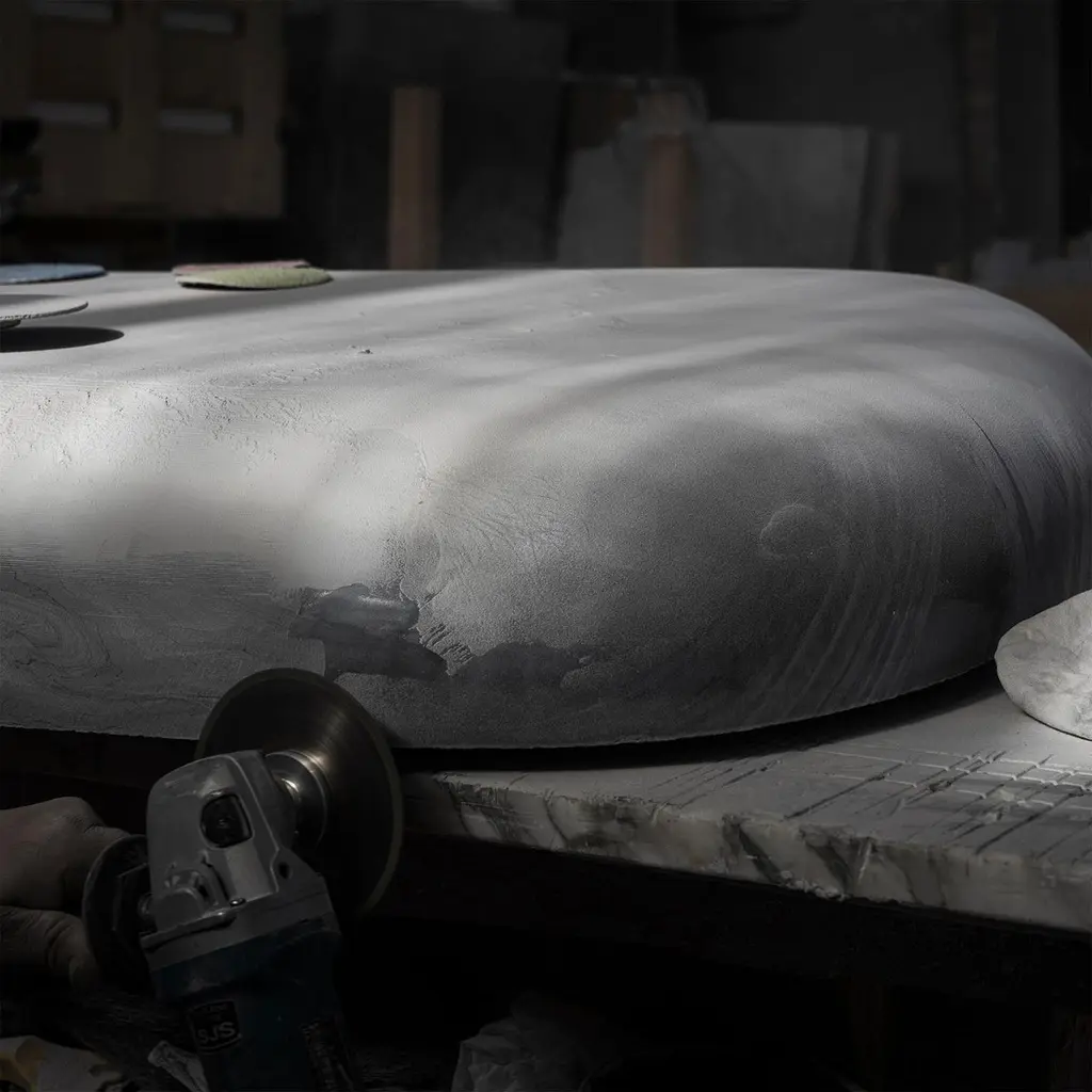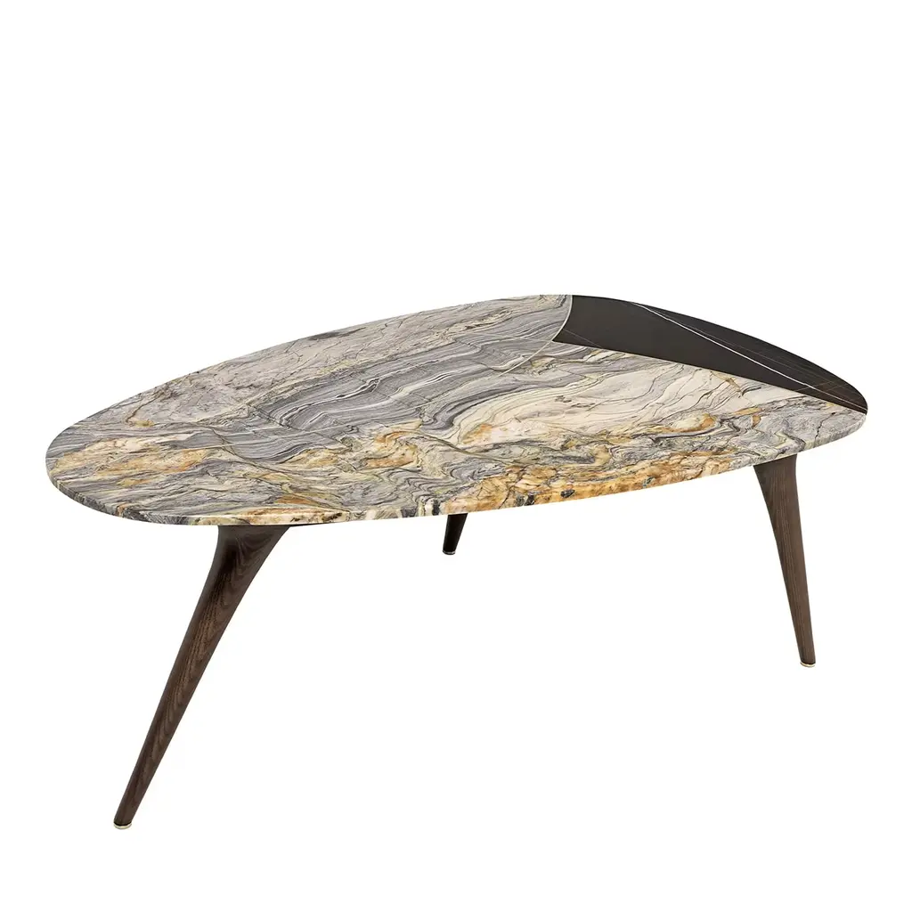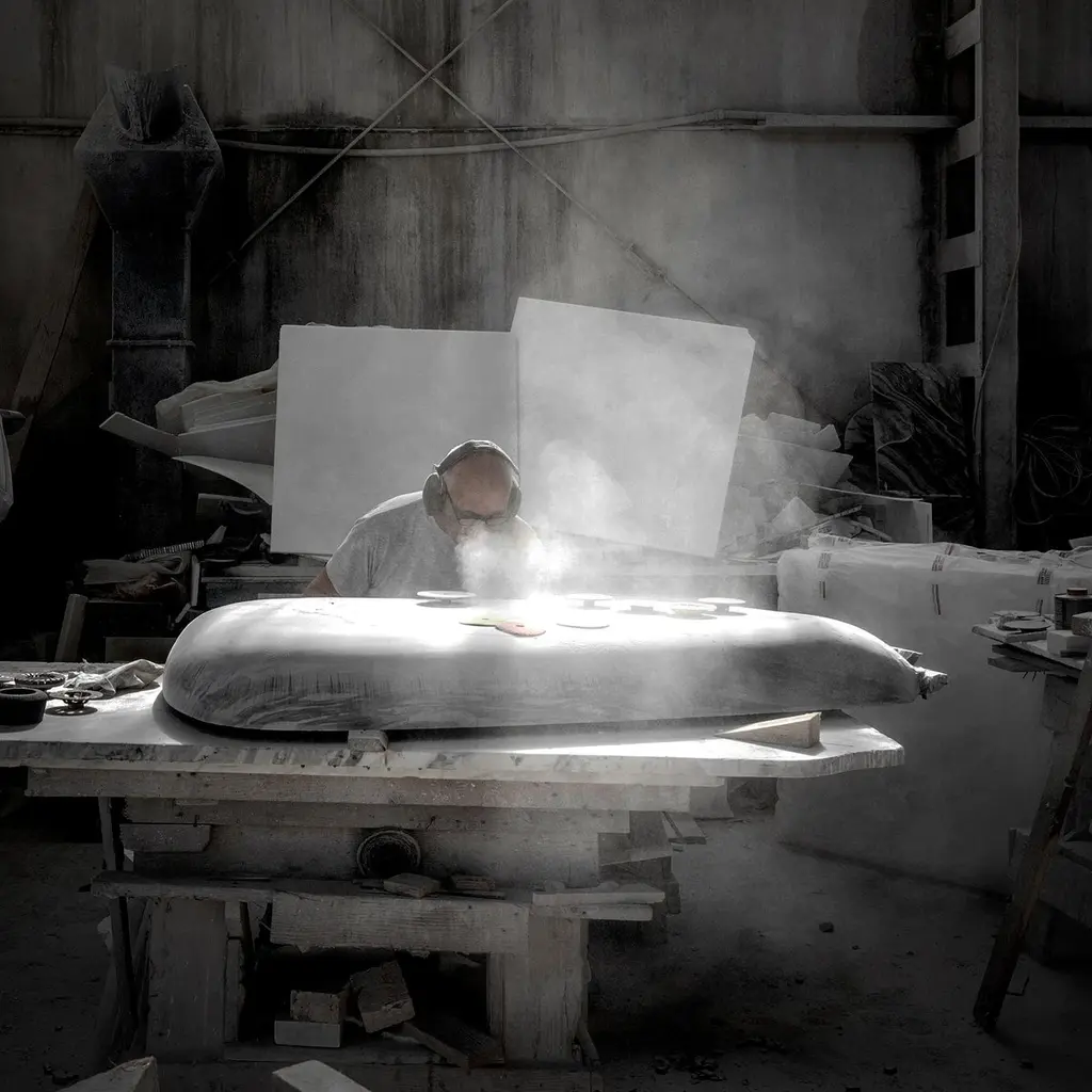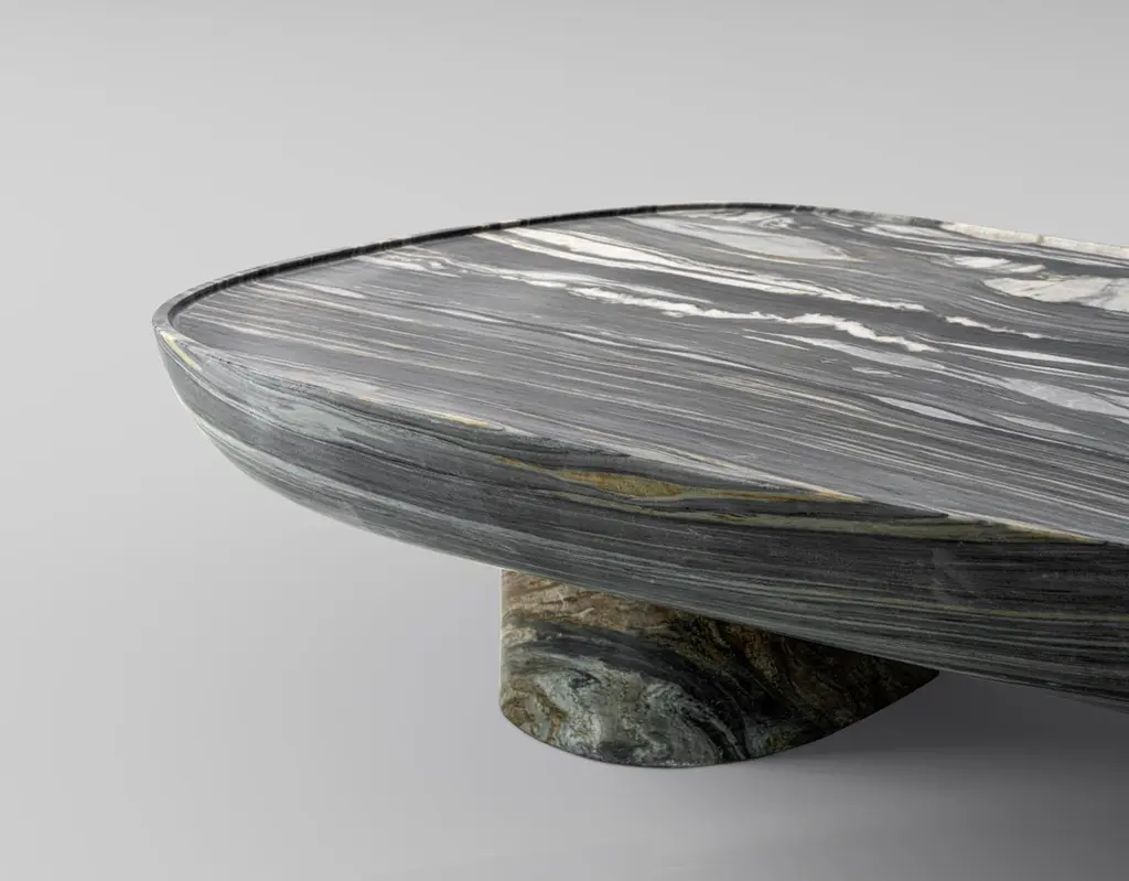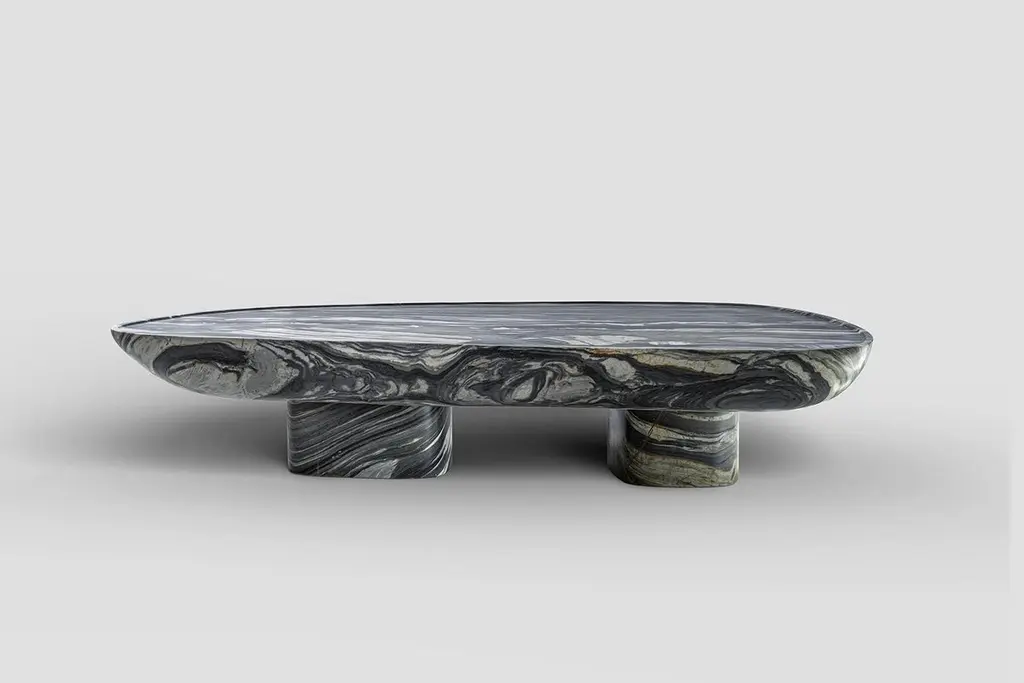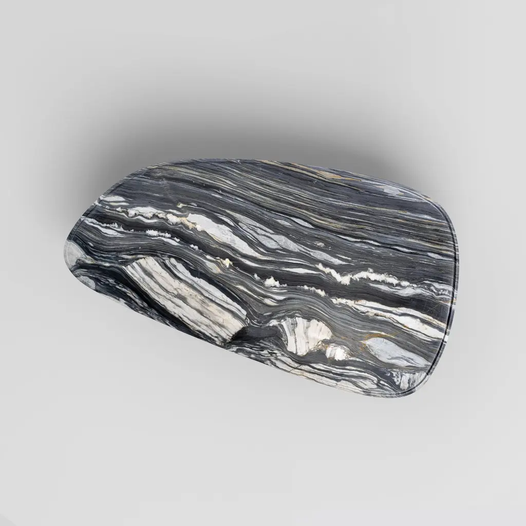 Shell coffee table is sculpted from a single, monolithic block of Calacatta Midnight marble. Its organic, fluid silhouette captures a sense of natural softness despite the solidity of stone.The rich interplay of deep charcoal, silver-grey, and warm gold veins creates a mesmerizing surface. Each flowing pattern is unique, making the table a true one-of-a-kind piece.The honed finish enhances the depth and luminosity of the marble’s intricate veining. Its organic form invites the eye to explore from every angle. The stone’s rare quality and dramatic coloration add a strong visual presence to any space. Minimal in structure yet rich in material character, it balances elegance with natural power.The craftsmanship celebrates the stone’s geological beauty through refined shaping. A timeless piece, it stands as both functional furniture and sculptural art.Shell is 100% crafted in Italy
