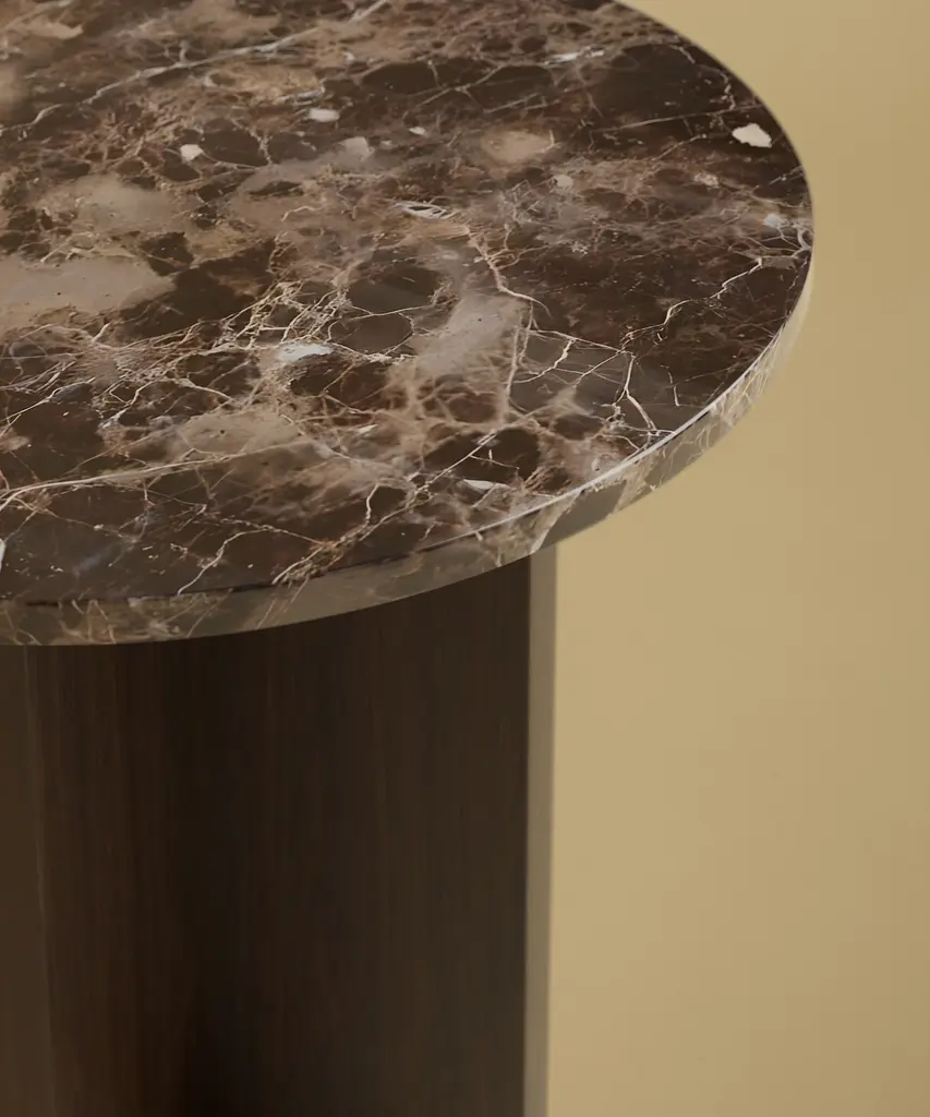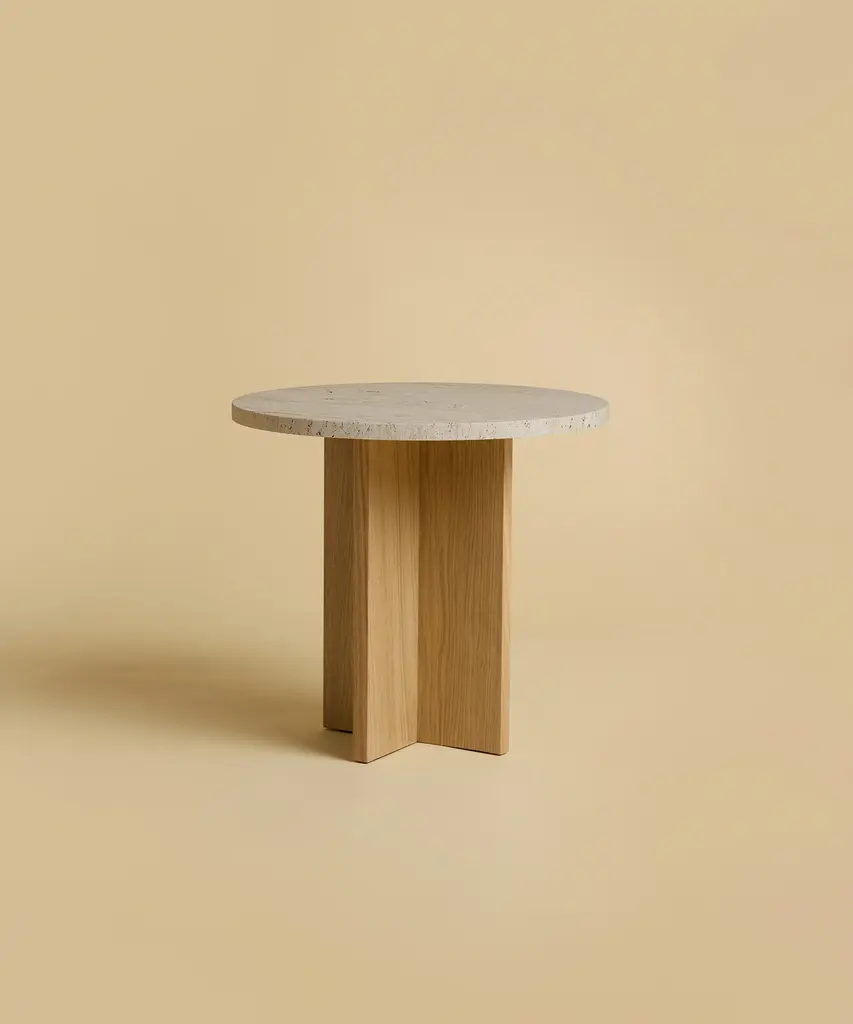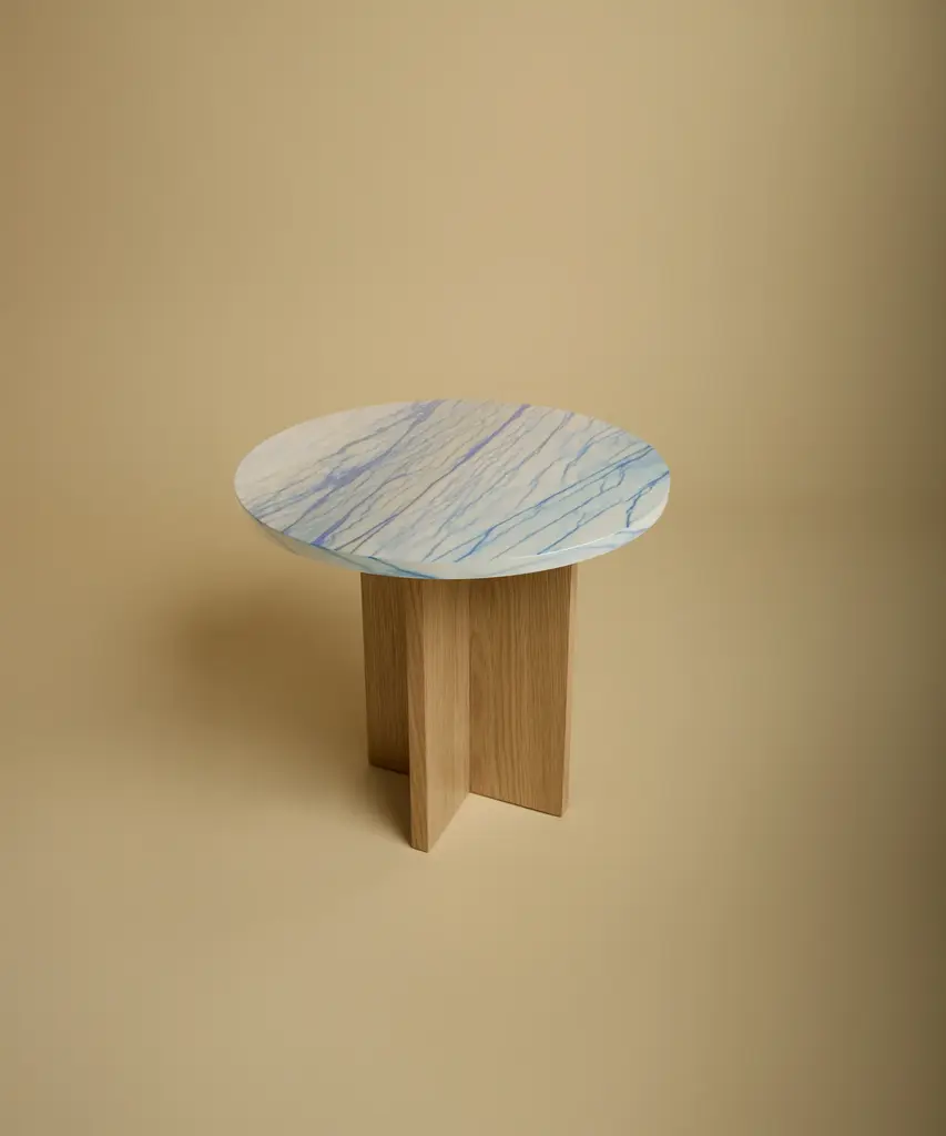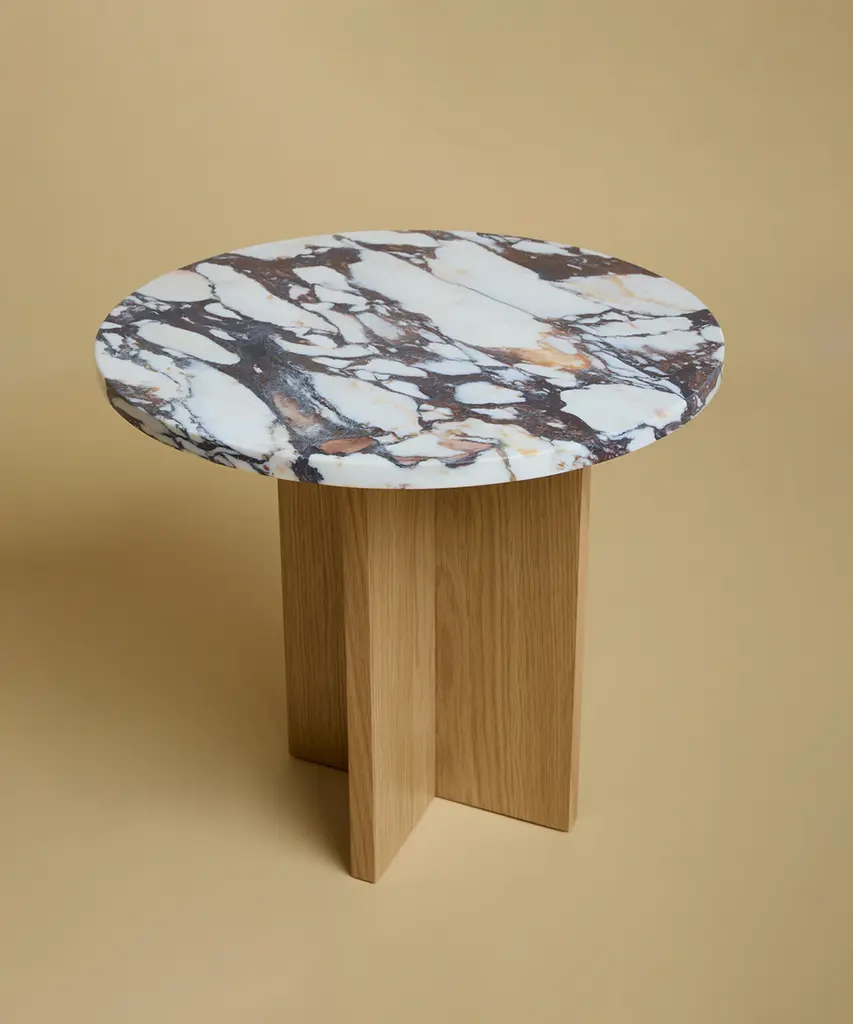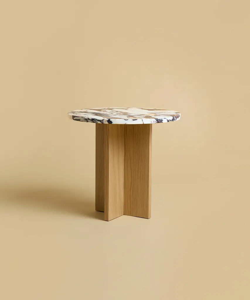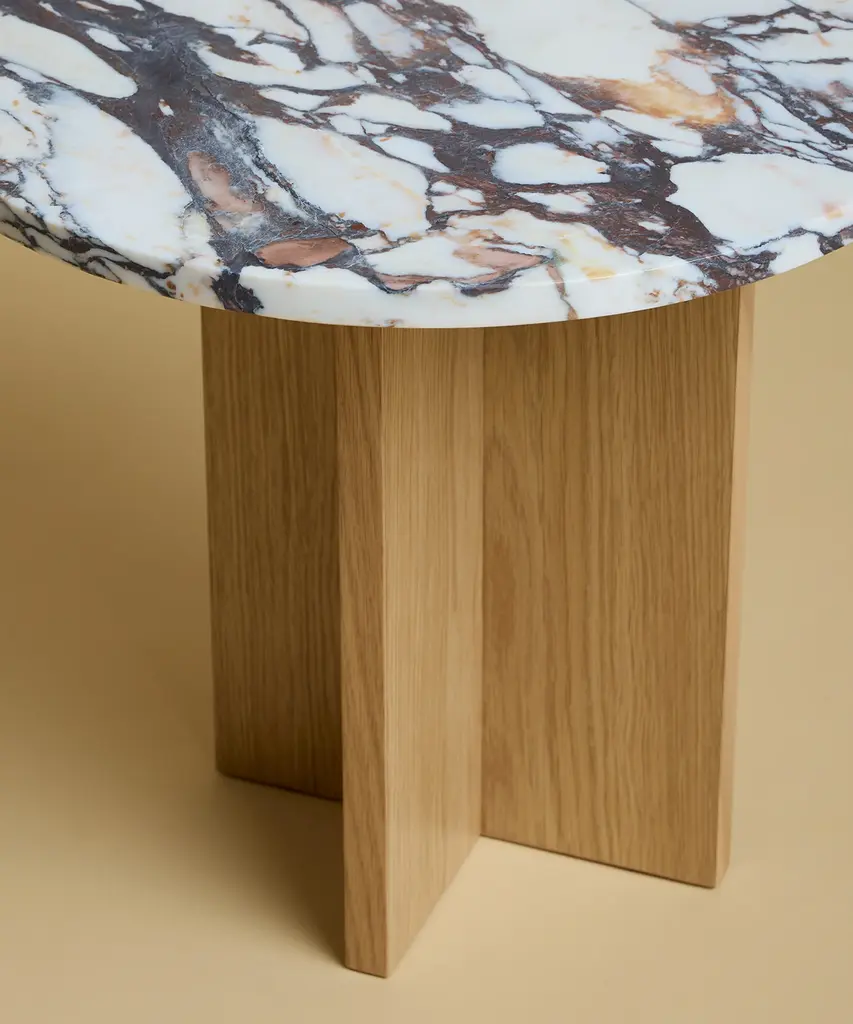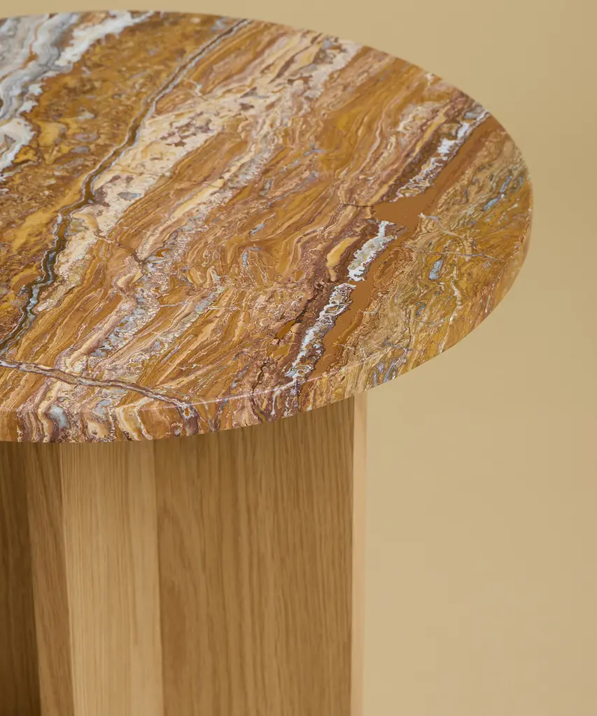 The Sherman coffee table is produced with an oak wood base and a Calacatta Viola marble or Orange Travertine marble top. The top is circular, while the base is obtained by gluing oak planks perpendicular to each other. Founded by Emanuela Terraneo and Alessandro Pozzi, Lebanto designs and produces modern and refined furniture in Cantù, Italy.