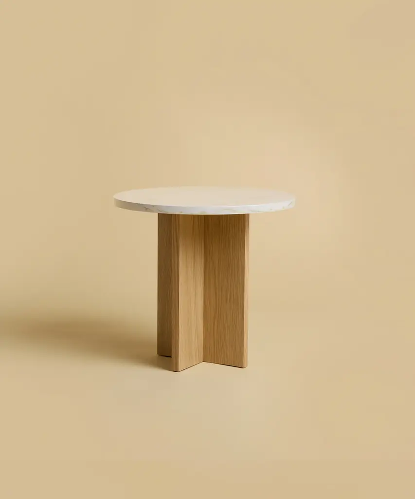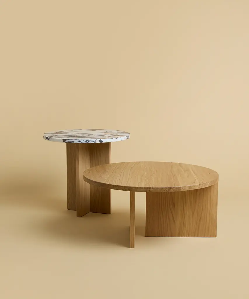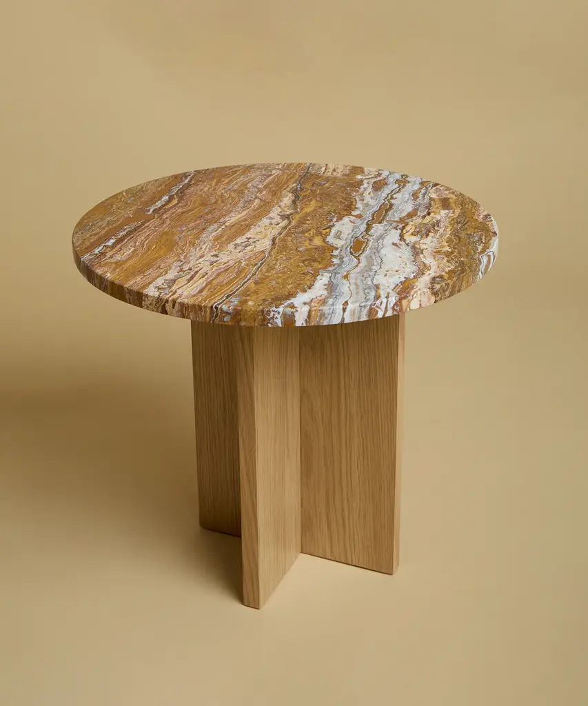 The Sherman coffee table is produced with an oak wood base and a Calacatta Viola marble or Orange Travertine marble top. The top is circular, while the base is obtained by gluing oak planks perpendicular to each other. Founded by Emanuela Terraneo and Alessandro Pozzi, Lebanto designs and produces modern and refined furniture in Cantù, Italy.