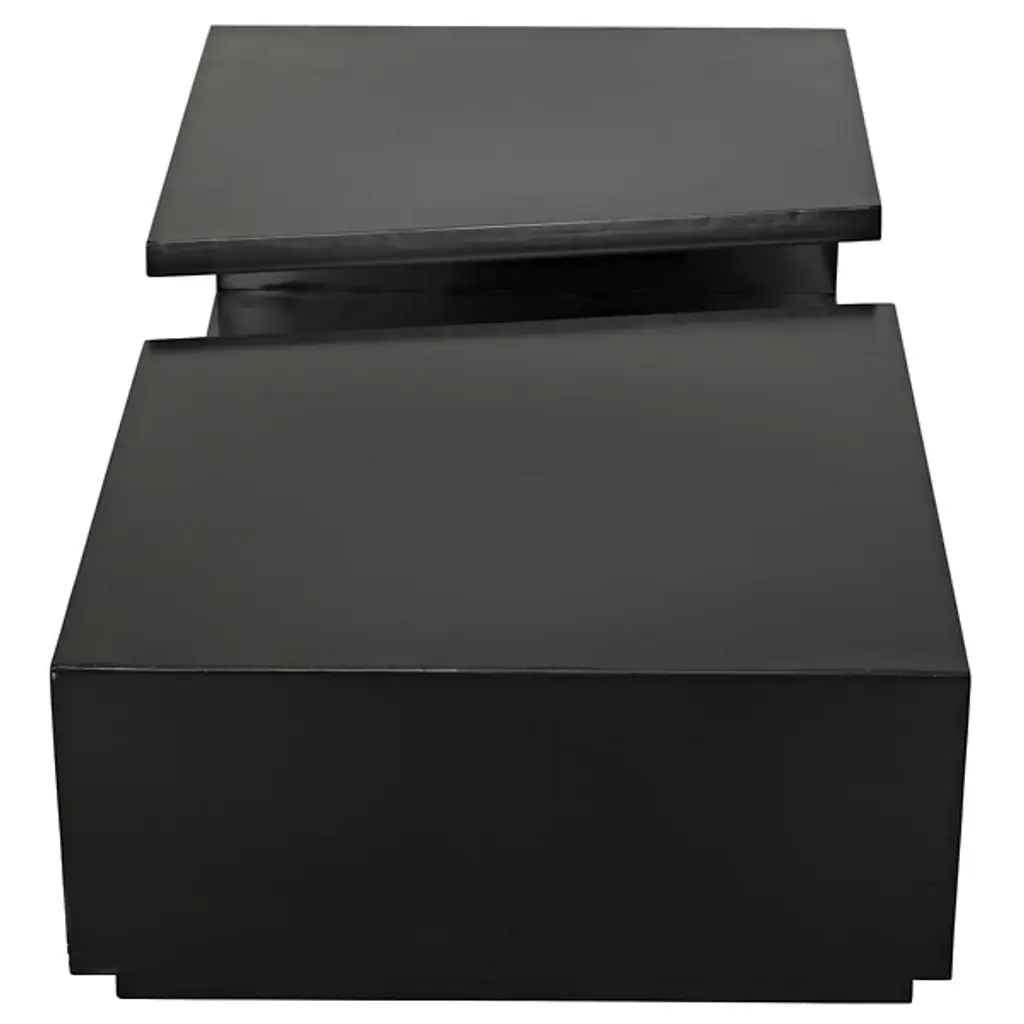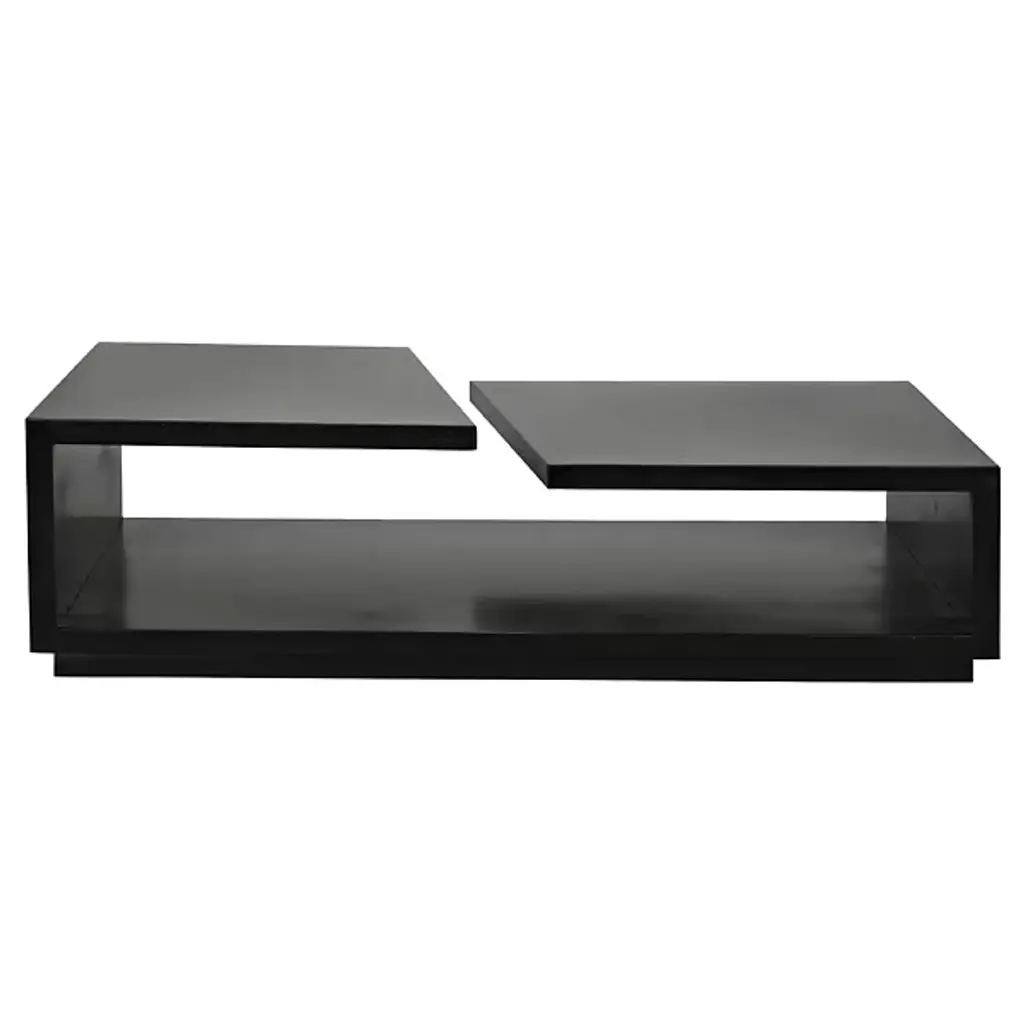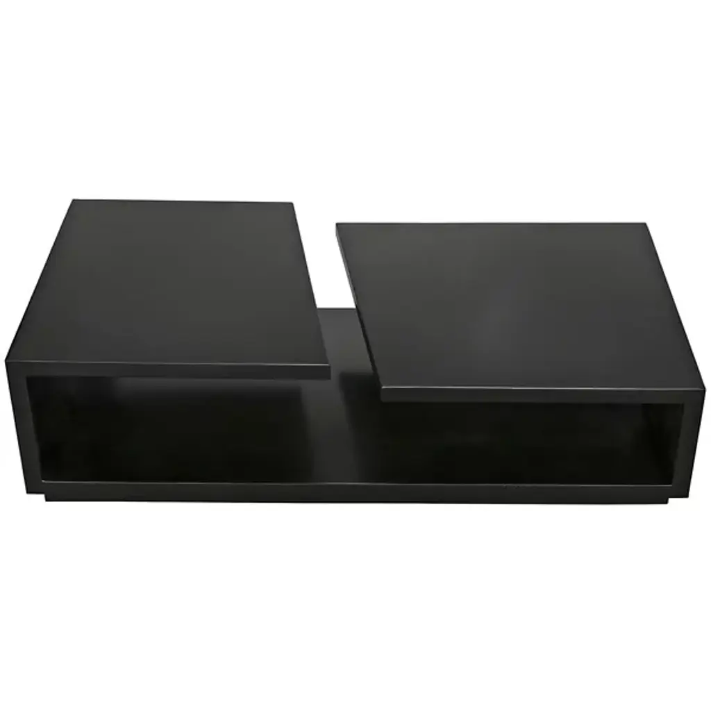 The Shift Coffee Table from Noir achieves geometric intrigue through its offset rectangular design, where two steel surfaces create an asymmetrical composition. The matte black finish unifies both levels while the displaced arrangement generates visual tension between the upper and lower planes. The open space beneath provides practical storage while maintaining the table's architectural character. This approach to coffee table design updates simple geometric forms into dynamic furniture that challenges traditional symmetry through careful proportion and unexpected spatial relationships.