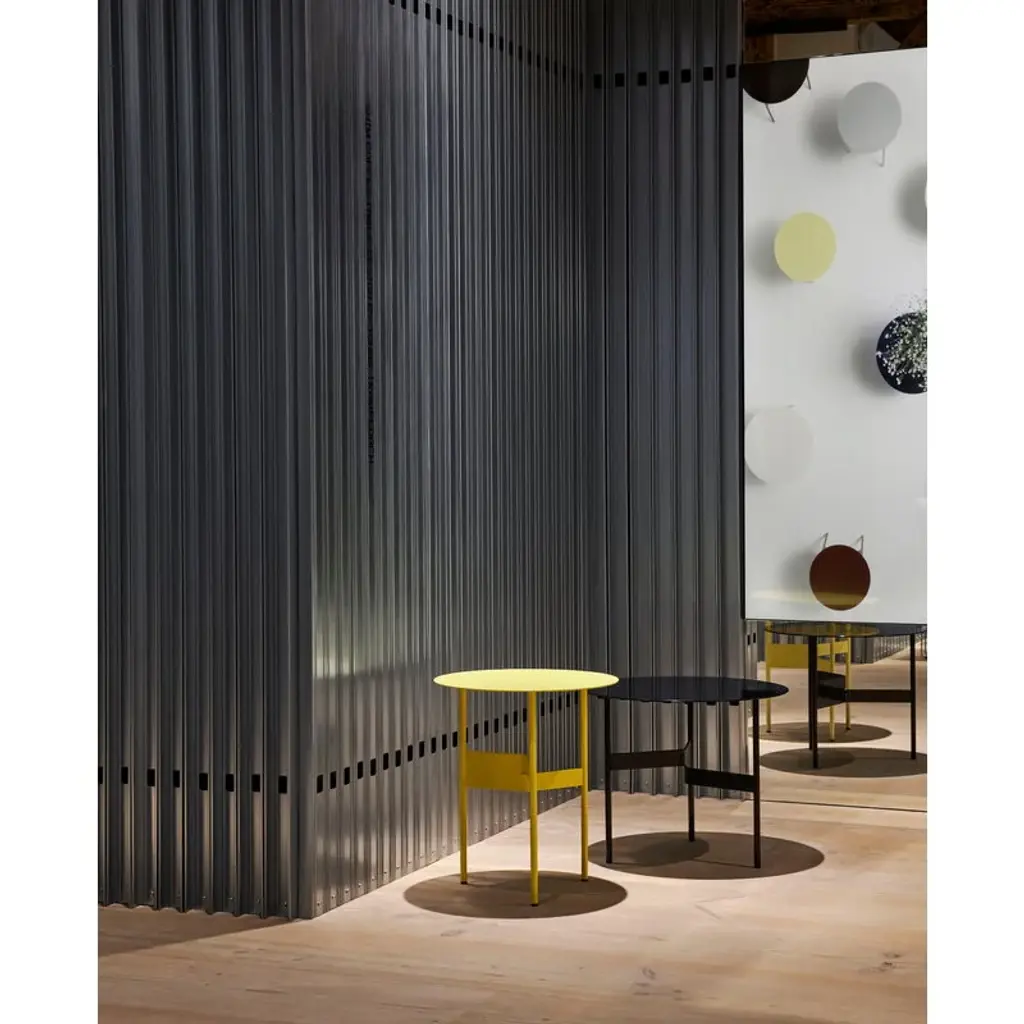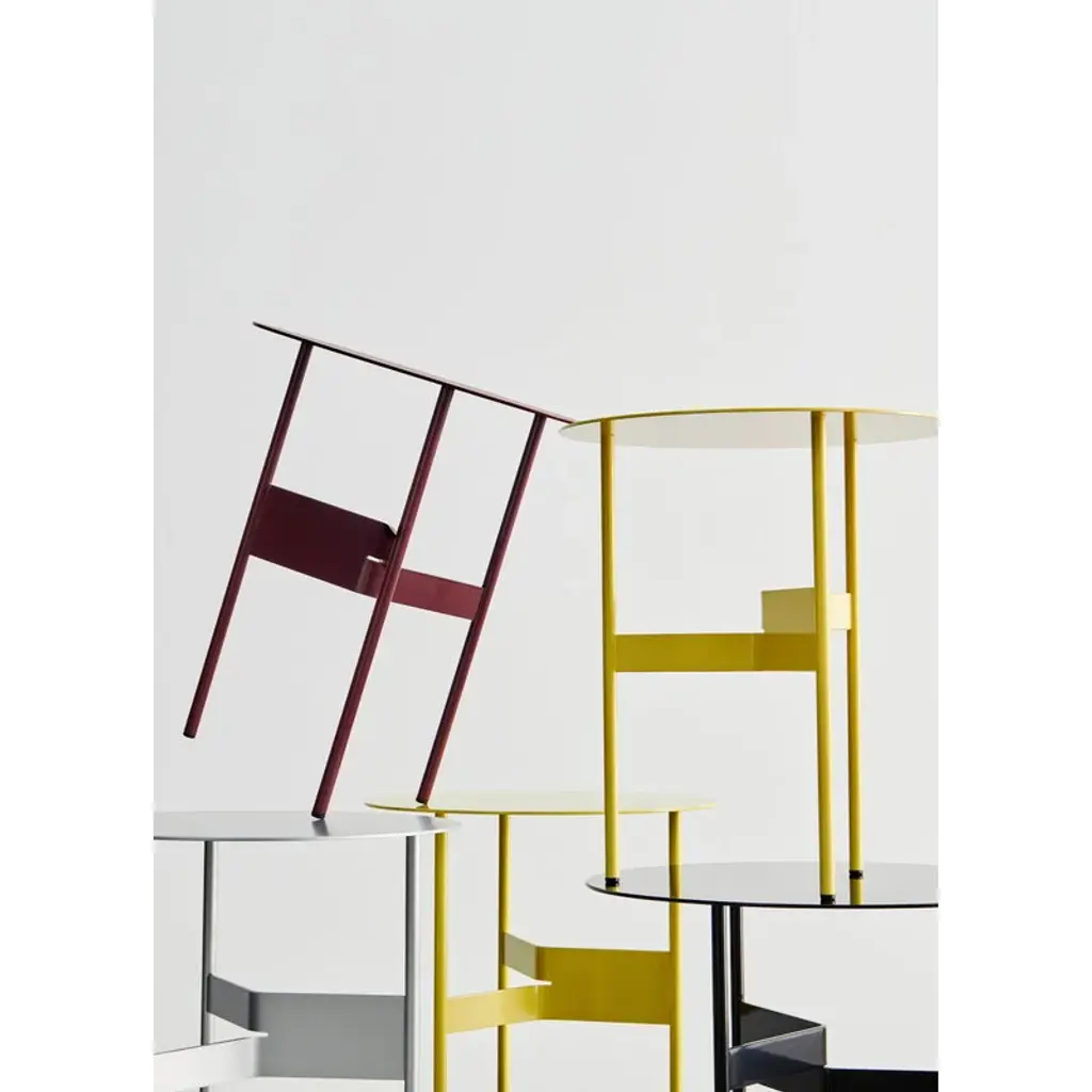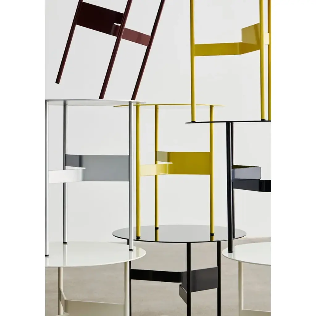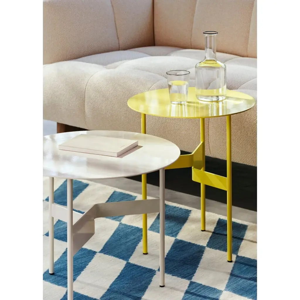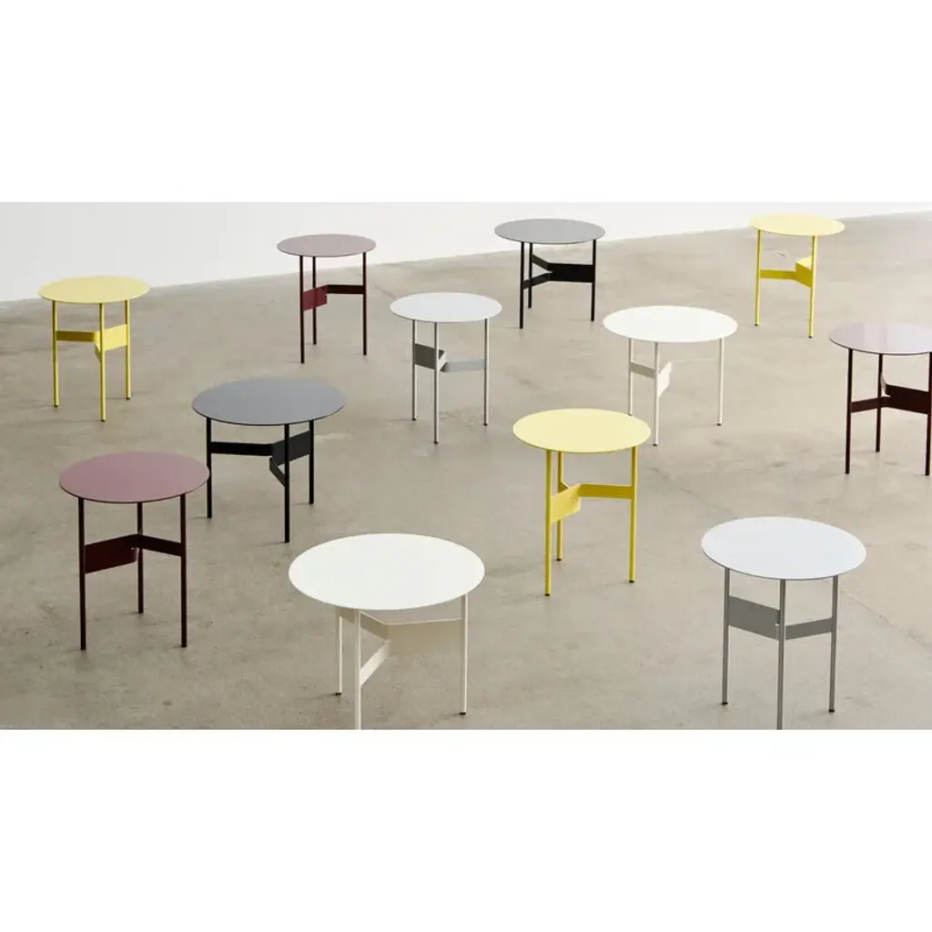 The HAY Shim coffee table is a sleek and characterful metal table standing on three legs, making it an ideal addition to your living room, café or public lobby. Made from steel, the Shim coffee table features a sculptural joint crafted from a split and bent metal piece that connects the three legs, offering an intriguing geometric contrast to the round tabletop. Designed by Jonas Trampedach, the Shim collection is available in several color options from subtle neutrals to vibrant hues, allowing it to seamlessly complement any furniture or interior style.