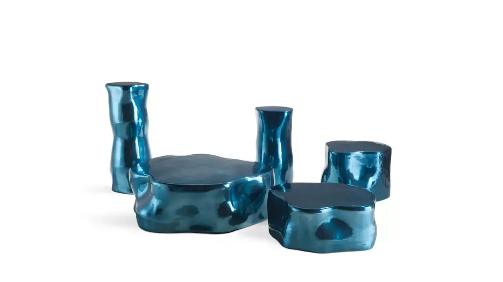 The organic shape of this table resembles a tree trunk. It is made of cast aluminium, creating endless reflections of the surrounding lights and colours.